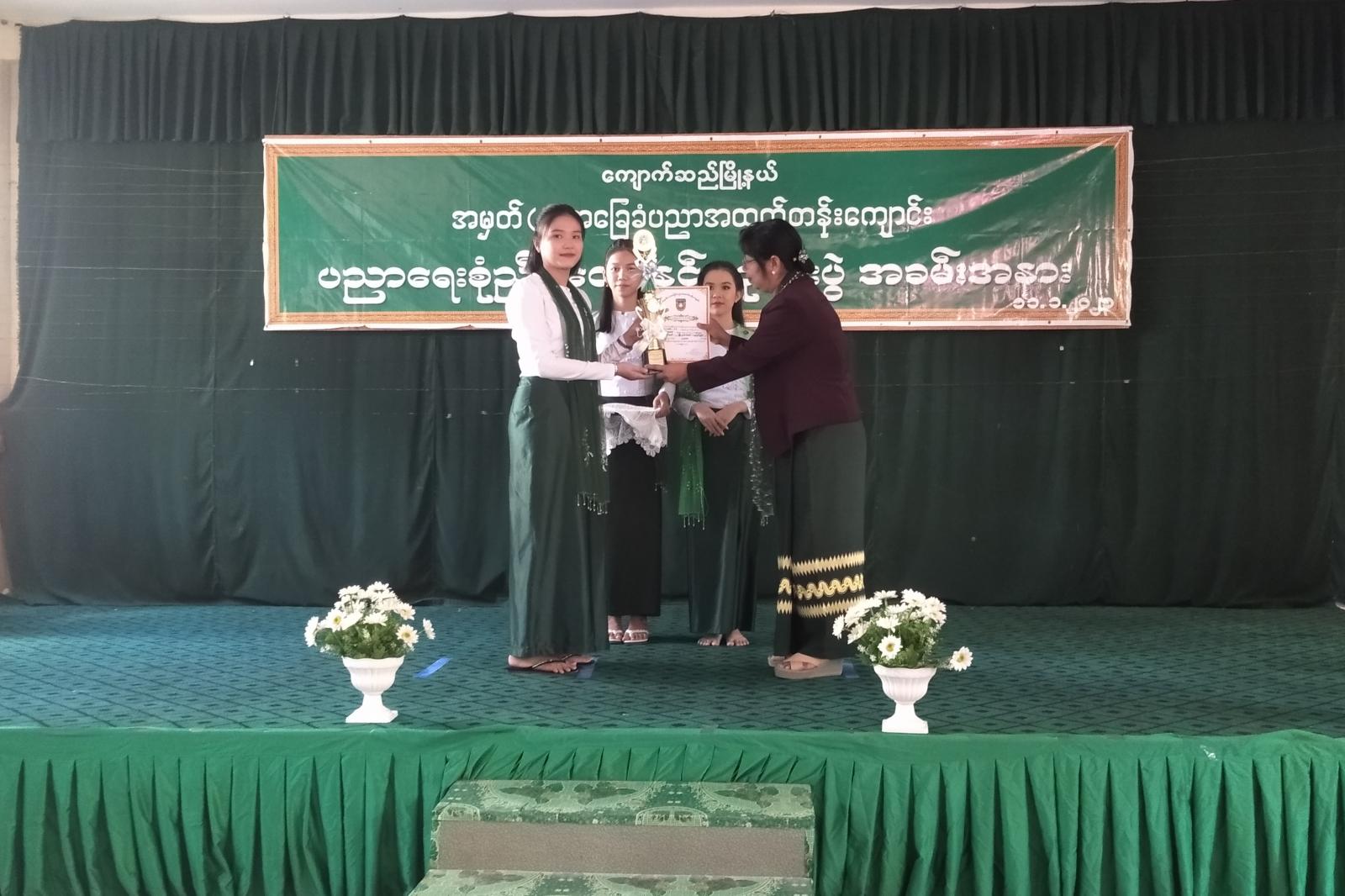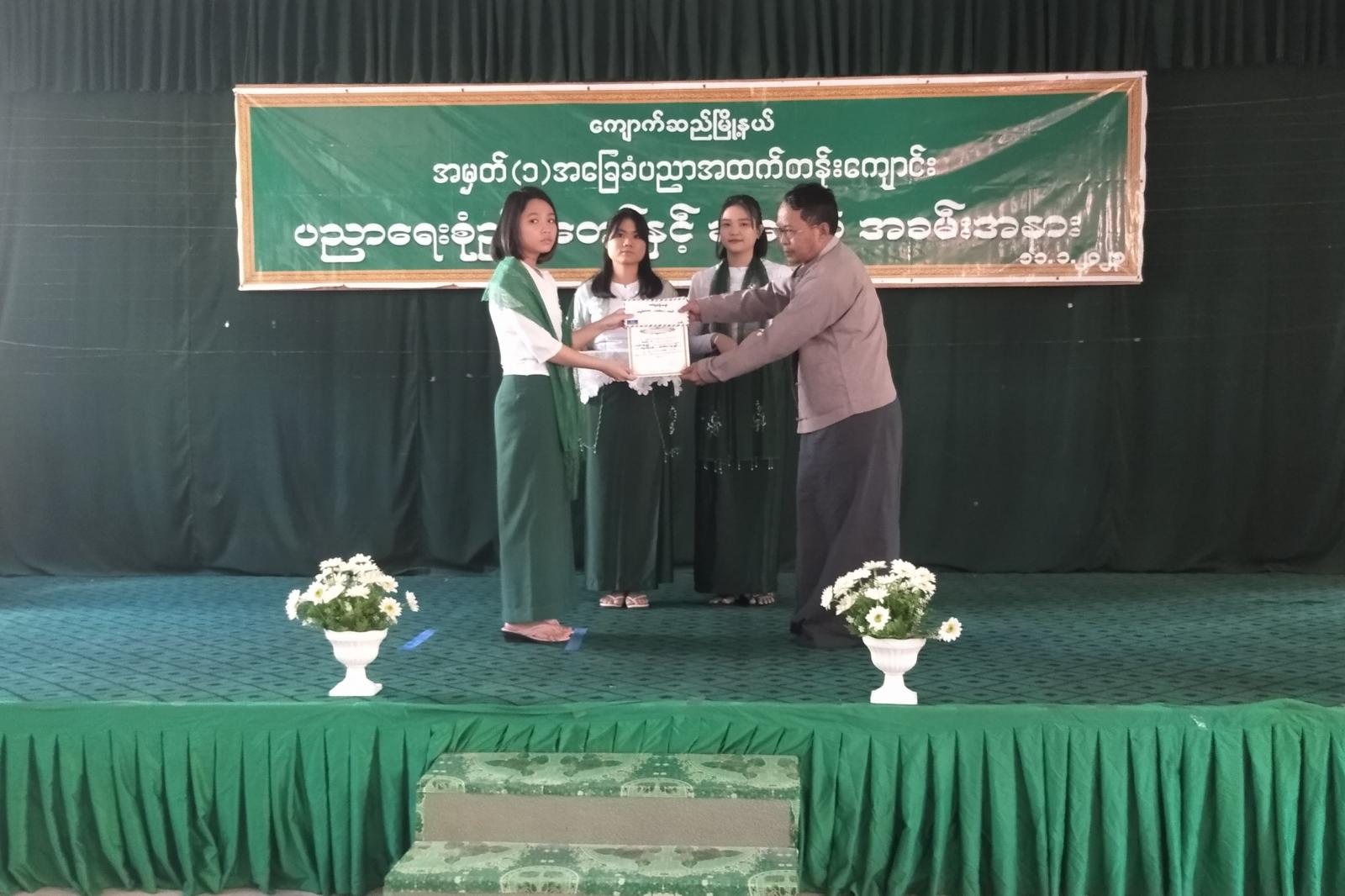 ဆက်လက်ပြီး၂၀၂၂-၂၀၂၃ပညာသင်နှစ် Grade-6 မှ Grade-9 အတန်းများတွင် ဘာသာရပ်အလိုက် ထူးချွန်သူများ၊ ကျောင်းတတ်မှန်သည့် ဆရာ/ဆရာမများနှင့် (၇၅) နှစ်မြောက် အာဇာနည်နေ့၊ ကမ္ဘာ့ဆရာများနေ့၊ ကမ္ဘာ့ခရီးသွားနှစ်၊ နိုင်ငံတကာ ပန်းချီပြိုင်ပွဲ၊ ကျောင်းကျန်းမာရေးသတင်းပတ်၊ နိုင်ငံတကာ စာတတ်မြောက်ရေးနေ့၊ လူကုန်ကူးမှုတိုက်ဖျက်ရေးနေ့၊ (၁၀၁)နှစ်မြောက်အမျိုးသားနေ့၊ (၇၅)နှစ်မြောက် စိန်ရတု လွတ်လပ်ရေးနေ့ အထိမ်းအမှတ် ပြိုင်ပွဲများတွင် အထက်တန်းအဆင့်၊ အလယ်တန်းအဆင့် စာစီစာကုံး၊ ကဗျာ၊ ဆောင်းပါး၊ ပန်းချီ၊ နံရံကပ်ပိုစတာ၊ ကျပန်း ပြိုင်ပွဲတွင် ဆုရရှိခဲ့သည့် ကျောင်းသား/ကျောင်းသူများအား ခေတ္တမြို့နယ်ပညာရေးမှူး ဒေါ်ခင်မာလာ၊ (အ.ထ.က-၁) ကျောင်းအုပ်ကြီး ဒေါ်ညိုအေးနှင့် တာဝန်ရှိသူများက ဆုများ အသီးသီးချီးမြှင့်ခဲ့သည်။