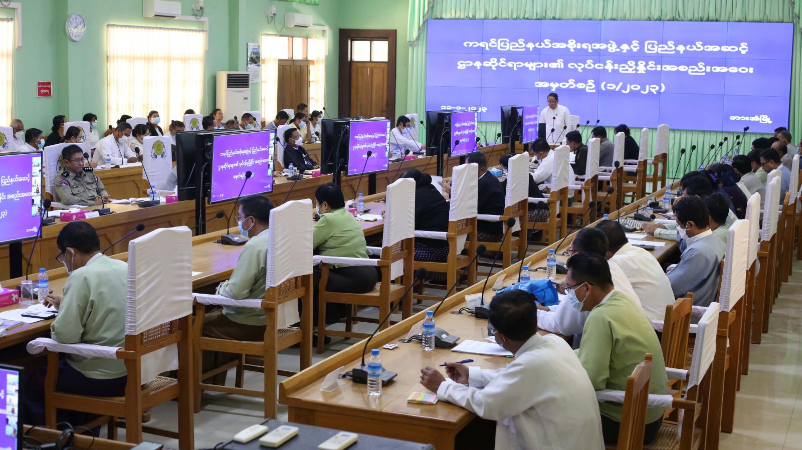 အစည်းအဝေးတွင် ကရင်ပြည်နယ်ဝန်ကြီးချုပ် ဦးစောမြင့်ဦးက နိုင်ငံတော်စီမံအုပ်ချုပ်ရေးကောင်စီဥက္ကဋ္ဌ နိုင်ငံတော်ဝန်ကြီးချုပ်နှင့် ပြည်ထောင်စုဝန်ကြီးများ၏ လမ်းညွှန်မှာကြားချက်များကို ထပ်ဆင့်ရှင်းလင်းပြောကြားပြီး နိုင်ငံ့စီးပွားမြှင့်တင်ရေးရန်ပုံငွေများ တိုးပွားအောင်ဆောင်ရွက်ရန်၊ ပဲတီစိမ်း၊ မတ်ပဲ အစရှိသော ပဲအမျိုးမျိုးကို ပြည်တွင်း၊ ပြည်ပဈေးကွက်များသို့ တင်ပို့ရောင်းချနိုင်ရေး နွေစပါးအပြီးတွင် ပဲတီစိမ်းနှင့်မတ်ပဲကို ထပ်မံစိုက်ပျိုးနိုင်ပါက စိုက်ပျိုးရန်နှင့် လာမည့်နှစ်မိုးစပါးအပြီးတွင် တိုးချဲ့စိုက်ပျိုး၍ အထွက်နှုန်းတိုးတက်အောင် ဆောင်ရွက်ကြစေလိုကြောင်း၊ သတင်းတု၊ သတင်းမှားများကို အချိန်နှင့်တပြေးညီပြန်လည်ချေဖျက်နိုင်ရေး သက်ဆိုင်ရာဌာနများမှ ကြိုးပမ်းဆောင်ရွက်ကြစေလိုကြောင်း၊ ပြည်နယ်၊ ခရိုင်၊ မြို့နယ်များအနေဖြင့် မြို့အင်္ဂါရပ်များနှင့်အညီဖြစ်စေရေး၊ ကိုယ်ပိုင်ကျောင်းများတွင် သင်ရိုးညွှန်းတမ်းများနှင့် ကိုက်ညီမှု ရှိ/မရှိ စစ်ဆေးကြပ်မတ်နိုင်ရေး၊ ပုဂ္ဂလိကဆေးရုံ၊ ဆေးခန်းများတွင် နိုင်ငံတော်မှ ဆေးကုသခွင့်(ဆမ)ရုတ်သိမ်းထားသူများ ဆေးကုမှုမရှိစေရေး ကြပ်မတ်ဆောင်ရွက်ဖို့လိုကြောင်း၊ စက်သုံးဆီသုံးစွဲမှုလျော့ချရေး၊ စားရေရိက္ခာဖူလုံပိုလျှံ၍ သာယာဝပြောစေရေး၊ တရားမဝင်ကုန်သွယ်မှုများလျော့နည်းကျဆင်းစေရေး၊ လမ်းပန်းဆက်သွယ်ရေး အဆင်ပြေချောမွေ့စေရေးကိစ္စရပ်များကို အထူးအလေးထားဆောင်ရွက်စေလိုကြောင်း ပြောကြားသည်။