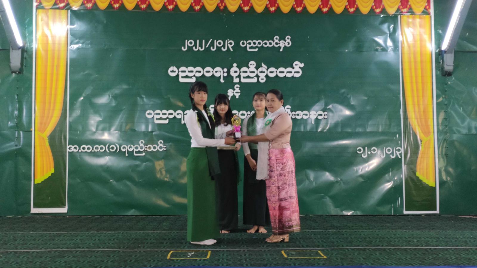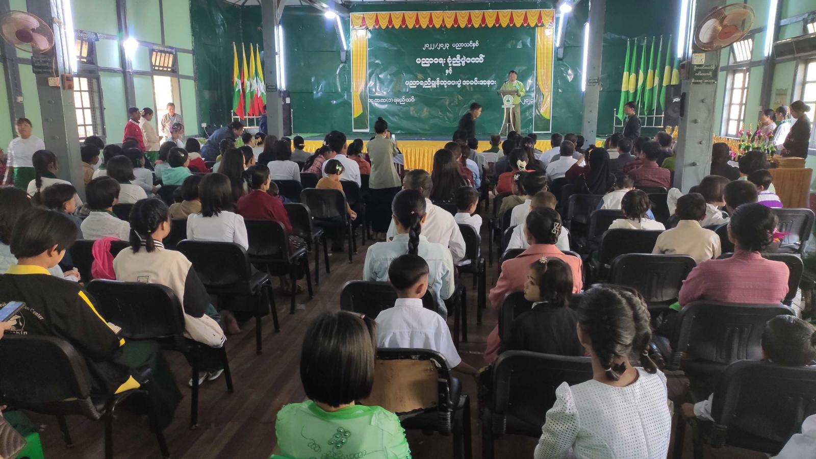 ရှေးဦးစွာ အခမ်းအနားကို Grade-8 ကျောင်းသား၊ကျောင်းသူများမှ ပညာရေးစုံညီပွဲတော်သီချင်းဖြင့် ဖျော်ဖြေကာ ခရိုင်စီမံအုပ်ချုပ်ရေးအဖွဲ့ဥက္ကဋ္ဌ ခရိုင်အုပ်ချုပ်ရေးမှူး ဦးမြင့်ထွန်းက အဖွင့်အမှာစကား ပြောကြားပြီး တိုင်းအဆင့် အင်္ဂလိပ်စာ၊ သင်္ချာစွမ်းရည်ပြိုင်ပွဲများတွင် ဆုရကျောင်းသား၊ကျောင်းသူများ၊ ဗဟိုအဆင့် အားကစားထူးချွန်ဆုရရှိသူများနှင့် ကျောင်းအဆင့် ဘက်စုံထူးချွန်ဆုရရှိသူများကို ခရိုင်စီမံအုပ်ချုပ်ရေးအဖွဲ့ဥက္ကဋ္ဌနှင့် အဖွဲ့ဝင်များ၊ ခရိုင်အဆင့်ဌာနဆိုင်ရာများ၊ မြို့နယ်စီမံအုပ်ချုပ်ရေးအဖွဲ့ဥက္ကဋ္ဌနှင့် အဖွဲ့ဝင်များက ဂုဏ်ပြုဆုများ အသီးသီးချီးမြှင့်ပေးအပ်ကြသည်။