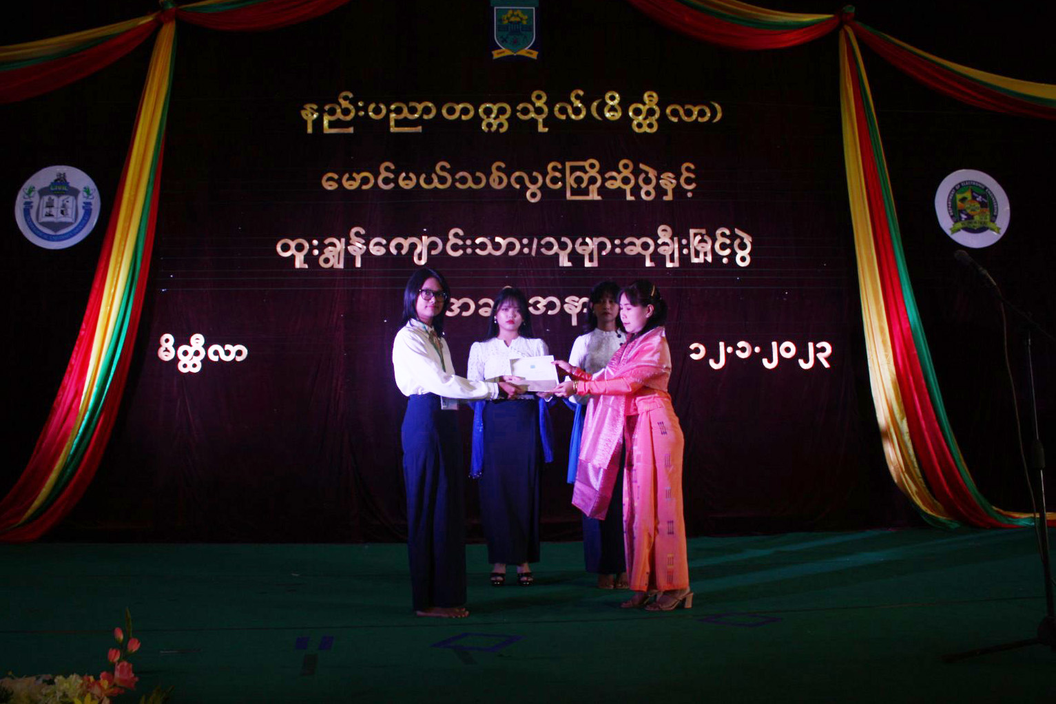 မန္တလေးတိုင်းဒေသကြီး၊ မိတ္ထီလာမြို့နယ် နည်းပညာတ္ကသိုလ်တွင် ၂၀၂၂-၂၀၂၃ ပညာသင်နှစ် မောင်မယ်သစ်လွင်ကြိုဆိုပွဲနှင့် ထူးချွန်ကျောင်းသားကျောင်းသူများအား ဆုချီးမြှင့်ပွဲ အခမ်းအနားကို ယနေ့နံနက်က အဆိုပါတက္ကသိုလ်ရှိ ဘွဲ့နှင်းသဘင်ခန်းမတွင် ကျင်းပခဲ့ကြောင်း သိရသည်။