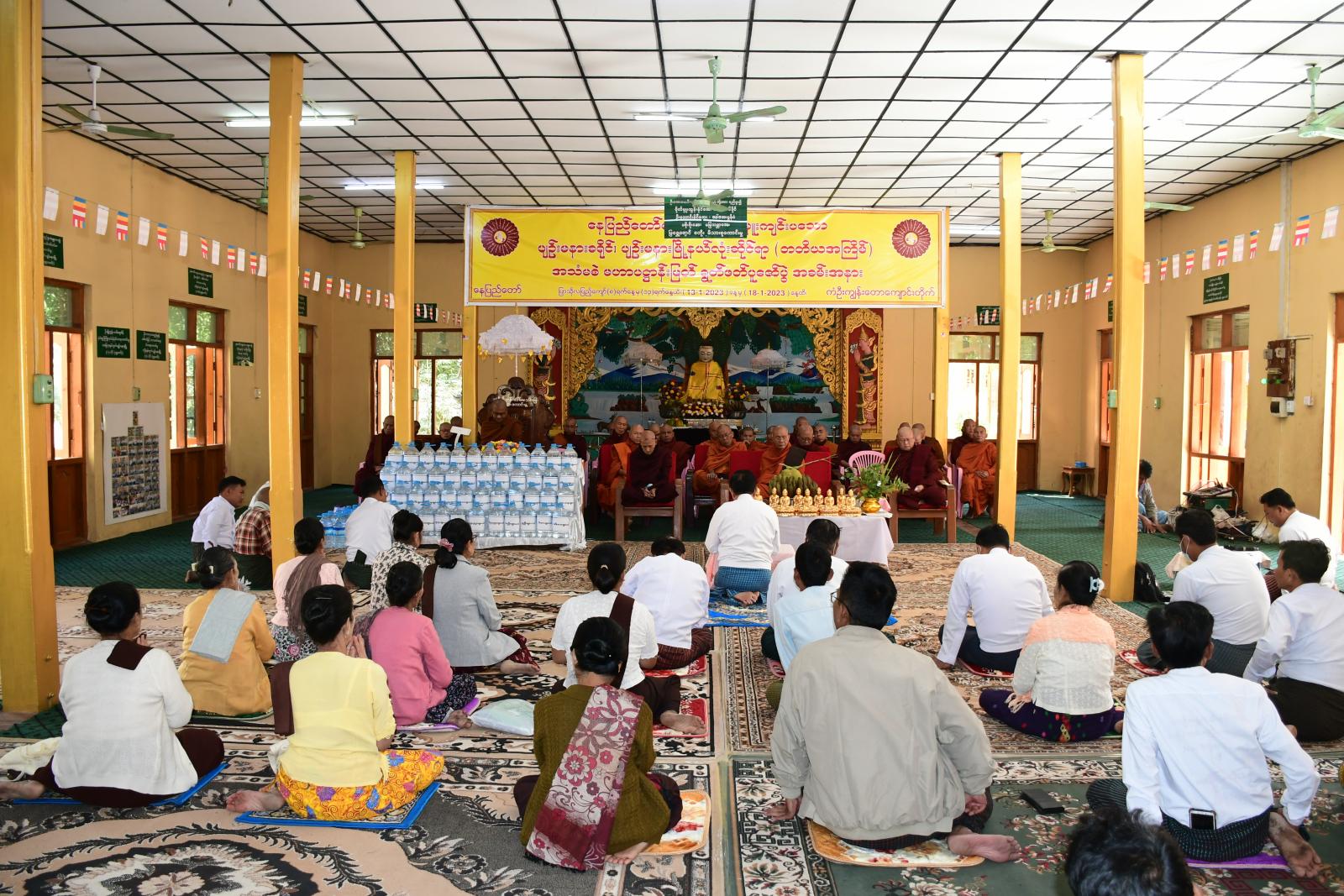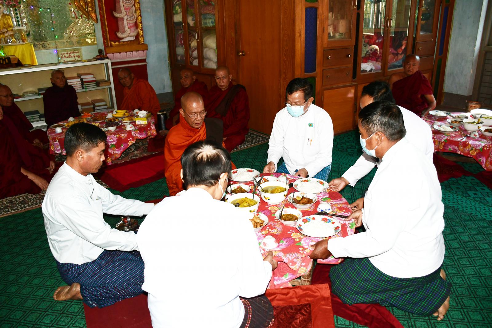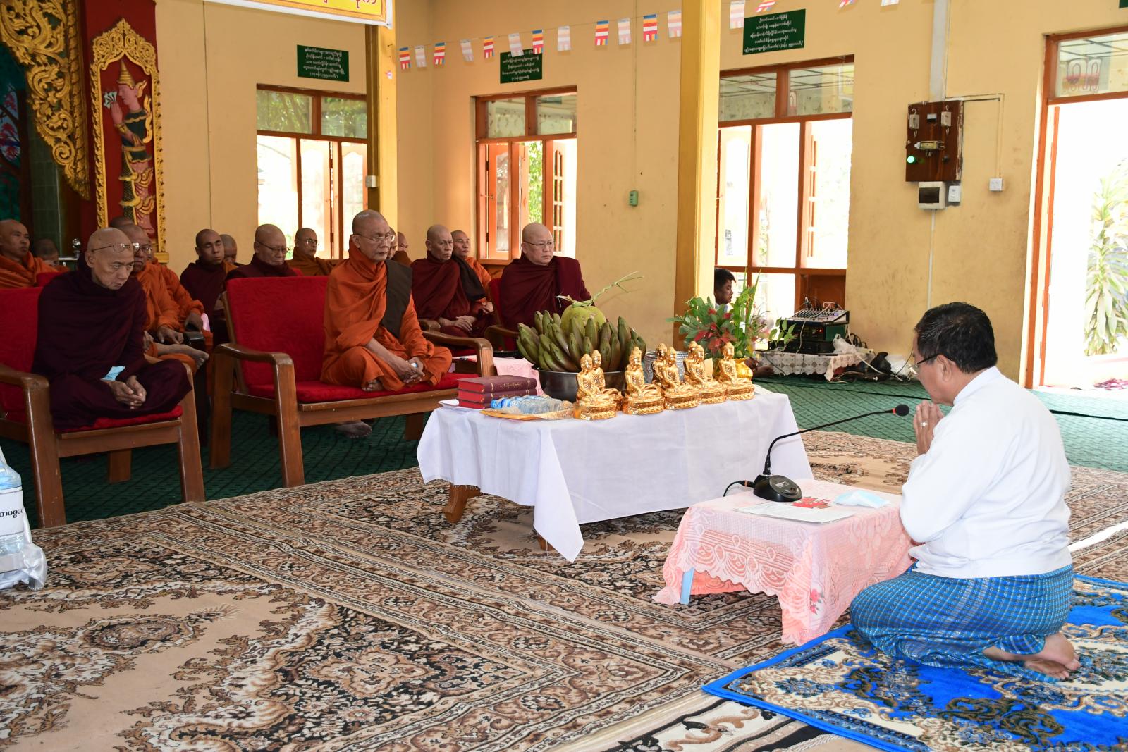 ရှေးဦးစွာ နေပြည်တော်ကောင်စီအဖွဲ့ဝင် ဦးမြင့်စိုးနှင့် ဧည့်ပရိသတ်များက ပျဉ်းမနားမြို့နယ် သံဃာ့နာယကအဖွဲ့ဥက္ကဋ္ဌ မာရ်အောင်ကျောင်းတိုက်ဆရာတော် ဘဒ္ဒန္တဇာဂရမထေရ်မြတ်ထံမှ ငါးပါးသီလ ခံယူဆောက်တည်ကြသည်။ ထို့နောက် နေပြည်တော်ကောင်စီအဖွဲ့ဝင်ဦးမြင့်စိုးက ဆရာတော်သံဃာတော်များထံ သာသနာရေးဆိုင်ရာ ကိစ္စရပ်များအား လျှောက်ထားခဲ့သည်။