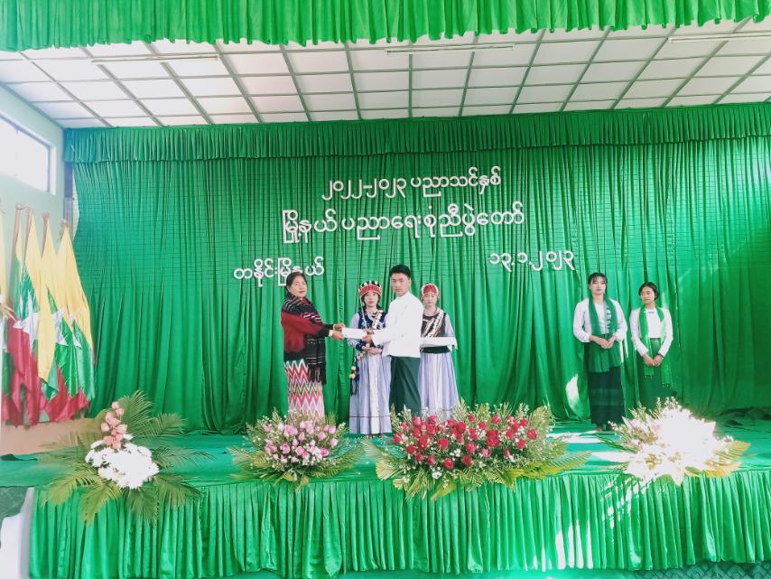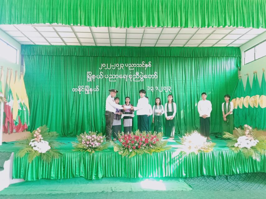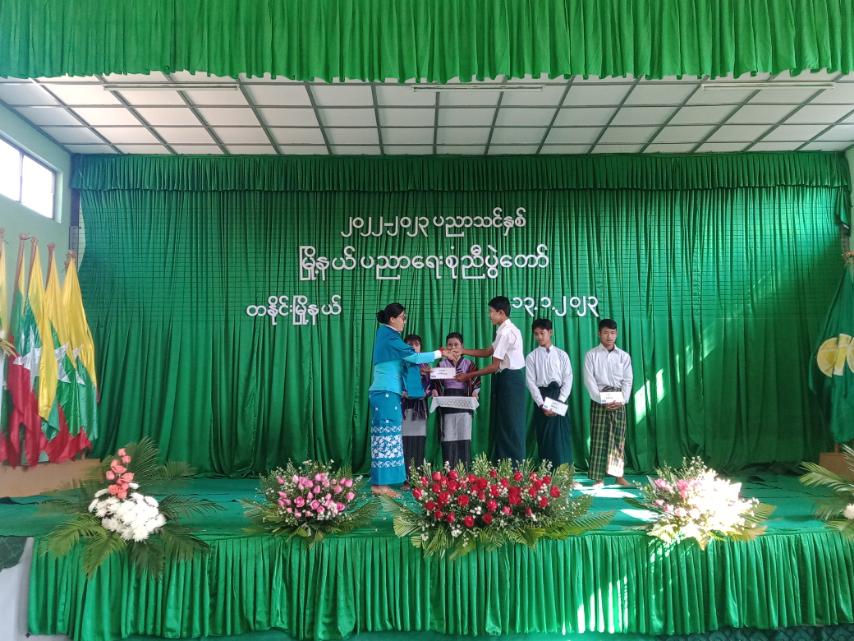 ထို့နောက် ဆုချီးမြှင့်ခြင်း အစီအစဉ်ကို စတင်ခဲ့ပြီး ပညာရေးထူးချွန်ဆု ရရှိသူများ၊ အားကစား ဆုရရှိသူများ၊ စာစီစာကုံးပြိုင်ပွဲဆုရရှိသူများကို မြို့နယ်စီမံအုပ်ချုပ်ရေးအဖွဲ့ ဥက္ကဋ္ဌ ဦးအောင်စိုး၊ ခရိုင်လူဝင်မှုကြီးကြပ်ရေးနှင့်ပြည်သူ့အင်အားဝန်ကြီးဌာန ခရိုင်ဦးစီးမှူး ဦးခင်မောင်သန်း၊ မြို့နယ် ပညာရေးမှူး ဒေါ်ရွှေနယ်ဇိန်း၊ မြို့နယ်စီမံကိန်းဦးစီးဌာန လက်ထောက်ညွှန်ကြားရေးမှူး ဒေါ်နီနီဦး၊ မြို့နယ်ရဲတပ်ဖွဲ့မှူး ရဲမှူးမြသောင်း၊ မြို့နယ်ပြန်ကြားရေးနှင့်ပြည်သူ့ဆက်ဆံရေးဦးစီးဌာန ဦးစီးအရာရှိ ဒေါ်ဝါဦးနှင့် ကျောင်းအုပ်ဆရာ၊ ဆရာမကြီးတို့က ထူးချွန်ဆုများပေးအပ်ချီးမြှင့်ခဲ့ကြပြီး ကျောင်းသား ကျောင်းသူလေးများက တေးသီချင်းများဖြင့် ကပြ သီဆိုဖျော်ဖြေခဲ့ကြကြောင်း သိရသည်။