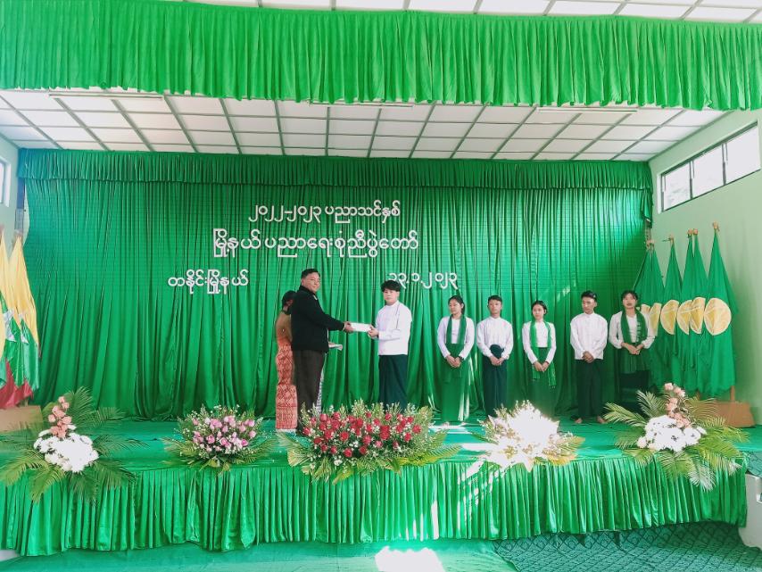 ကချင်ပြည်နယ် တနိုင်းမြို့ အမှတ်(၁) အခြေခံပညာအထက်တန်းကျောင်း ခန်းမ၌ ၂၀၂၂ - ၂၀၂၃ ပညာသင်နှစ် ပညာရေးစုံညီပွဲတော်နှင့် ပညာရည်ချွန်ဆုပေးပွဲ အခမ်းအနားကို ယနေ့နံနက် ၁၀ နာရီအချိန်က ကျင်းပပြုလုပ်ခဲ့ရာ ကျောင်းသား/သူများက စုံညီပွဲတော် ဒို့နွှဲပျော် သီချင်းဖြင့်သီဆိုဖွင့်လှစ်ခဲ့သည်။