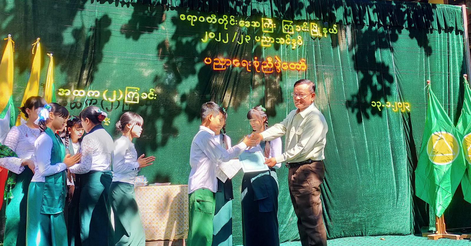 ထို့နောက် အကျိုးတော်ဆောင်ဥက္ကဋ္ဌ ဦးကျော်မျိုးအောင်က (အ ထ က-၂) ကျောင်း၏ဖွံ့ဖြိုးရေးလုပ်ငန်းများ တိုးတက်ရေးနှင့်ပတ်သက်၍ ပြောကြားပြီးနောက် ကာယ၊ ဉာဏဆုများချီးမြှင့်ရာ တိုင်းအဆင့်ဘောလုံးလက်ရွေးစင်ရွေးချယ်ခံရသော (Grade-9) ကျောင်းသားမောင်ထွဋ်အောင်ဝင်း၊ ကျောင်းကျန်းမာရေးရက်သတ္တပတ် (လယ်ဆင့်၊ မူဆင့်) စာစီစာကုံး၊ ပန်းချီ၊ ကဗျာပြိုင်ပွဲတွင်ဆုရသူများအားလည်းကောင်း၊ (ထက်၊ လယ်၊ မူ) အားကစားပြိုင်ပွဲများတွင် ဆုရကျောင်းသား/ သူများနှင့် အမျိုးသားအောင်ပွဲနေ့အထိမ်းအမှတ် မြို့နယ်အဆင့်ကဗျာပြိုင်ပွဲတွင် ဒုတိယဆုရ(ထက်ဆင့်) ကျောင်းသူ (Grade-11) မှ မတွယ်တာမင်းနှင့် (၇၅)နှစ်မြောက်စိန်ရတုလွတ်လပ်ရေးနေ့အထိမ်းအမှတ် စာစီစာကုံး၊ ကဗျာ၊ ပန်းချီ၊ ကျပန်းစကားပြောပြိုင်ပွဲများတွင် (ပထမ၊ ဒုတိယ၊ တတိယ)ဆုရသူများနှင့် ကာယအလှမယ်ပြိုင်ပွဲတွင် နှစ်သိမ့်ဆုရ(Grade-9) ကျောင်းသူမနှင်းသန့်ဇော်အားလည်းကောင်း၊ နိုင်ငံတကာစာတတ်မြောက်ရေးနေ့နှင့် လူကုန်ကူးမှုတိုက်ဖျက်ရေးနေ့ အထိမ်းအမှတ်စာစီစာကုံး၊ ကဗျာပြိုင်ပွဲများတွင် (ပထမ၊ ဒုတိယ၊ တတိယ) ဆုရရှိကြသော ကျောင်းသား/ သူများနှင့် ၂၀၂၂ ခုနှစ်တက္ကသိုလ်ဝင်စာမေးပွဲတွင် ထူးချွန်စွာအောင်မြင်ကြသော(၄) ဘာသာဂုဏ်ထူးရှင်တစ်ဦး၊ (၃)ဘာသာဂုဏ်ထူးရှင်တစ်ဦး၊ (၂)ဘာသာဂုဏ်ထူးရှင်တစ်ဦး၊ တစ်ဘာသာဂုဏ်ထူးရှင်(၈)ဦးနှင့် ထူးချွန်ဆုများရရှိအောင် သင်ကြားပြသပေးသော ဆရာ/ ဆရာမများအား တာဝန်ရှိသူအသီးသီးက ဆုများချီးမြှင့်ပေးအပ်ကြသည်။