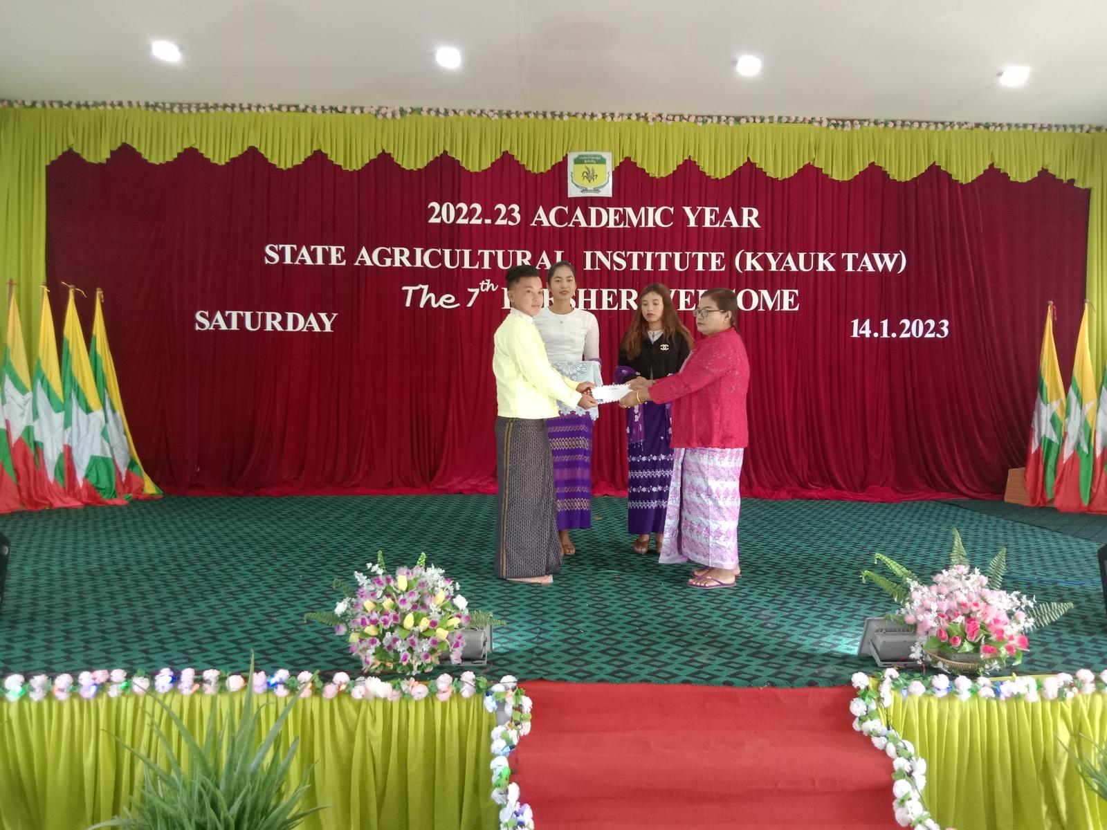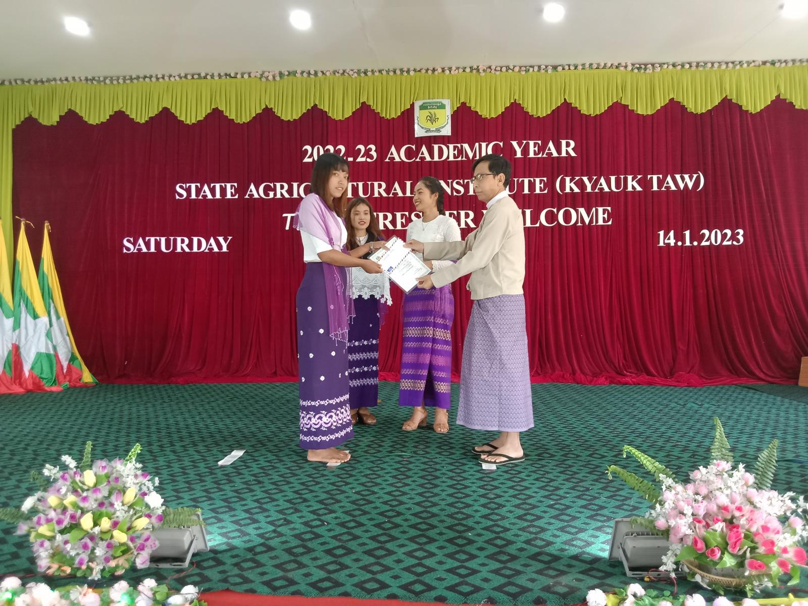 ထို့နောက် ပညာရည်ချွန်ဆုပေးပွဲအား ကျင်းပပြုလုပ်ရာ စိုက်ပျိုးရေးသိပ္ပံ(ကျောက်တော်)မှ ၂၀၁၉-၂၀၂၀ ပညာသင်နှစ်တွင်ပထမ၊ ဒုတိယနှင့်တတိယဆုရရှိသူများနှင့်၂၀၂၁-၂၀၂၂ ပညာသင်နှစ်တွင် ပထမ၊ ဒုတိယနှင့်တတိယဆုရရှိသူများနှင့် ပြန်ကြားရေးနှင့်ပြည်သူ့ဆက်ဆံရေးဦးစီးဌာနနှင့် စိုက်ပျိုးရေးသိပ္ပံ(ကျောက်တော်)တို့ ပူးပေါင်းကျင်းပပြုလုပ်သော လူငယ်စကားဝိုင်းတွင် ပါဝင်ဆွေးနွေးသူများအားလည်း ဂုဏ်ပြုမှတ်တမ်းလွှာများပေးအပ်ခဲ့သည်။ အဆိုပါ မောင်မယ်သစ်လွင်ကြိုဆိုပွဲအခမ်းအနားသို့ စိုက်ပျိုးရေးသိပ္ပံ(ကျောက်တော်)မှ ကျောင်းအုပ်ဆရာကြီး၊ ဒုတိယကျောင်အုပ်ဆရာကြီးနှင့်ဆရာမကြီးများ၊ စိုက်ပျိုးရေးသိပ္ပံမှ ဆရာ/ ဆရာမများ ကျောင်းသား ကျောင်းသူများ တက်ရောက်ကြပြီး ဒုတိယနှစ်ကျောင်းသူကလေးများက လေးဝတီအကဖြင့် ကပြဖျော်ဖြေခဲ့ကြောင်း သိရှိရသည်။