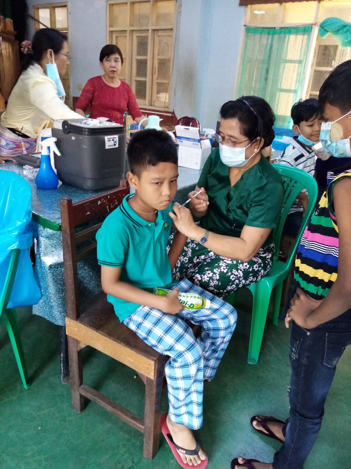 ထို့နောက် ကာကွယ်ဆေးထိုးနှံရာသို့ မြို့နယ်ကျန်းမာရေးမှူး၊ အ.ထ.က(၂) ကျောင်းအုပ်ကြီးနှင့် ဆရာ/မများ၊ မြို့နယ်အထွေထွေအုပ်ချုပ်ရေး ဦးစီးဌာနရုံး ဝန်ထမ်းများ၊ ရဲတပ်ဖွဲ့ဝင်များ၊ ပရဟိတအဖွဲ့များ၊ ပြည်သူ့ကျန်းမာရေးဦးစီးဌာနမှ ဝန်ထမ်းများ၊ ကျောင်းကော်မတီဝင်များ၊ မြို့မိ၊မြို့ဖများ၊ မြို့နယ်ကြက်ခြေနီတပ်ဖွဲ့ဝင်များက ကိုယ်အပူချိန်တိုင်းတာခြင်း၊ လက်ဆေးစေခြင်း၊ ခြောက်ပေအကွာမှာ စောင့်ဆိုင်းစေခြင်းတို့ကို ပြုလုပ်ကာ ကျန်းမာရေးစောင့်ရှောက်မှုများကို ဆောင်ရွက်ပေးလျက်ရှိကြောင်း သတင်းရသည်။