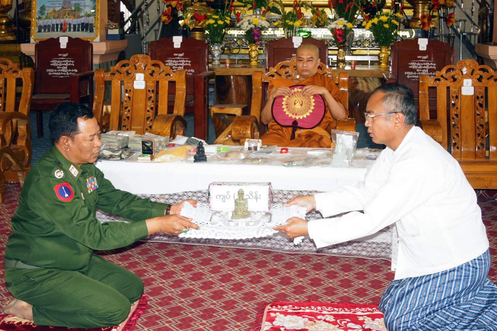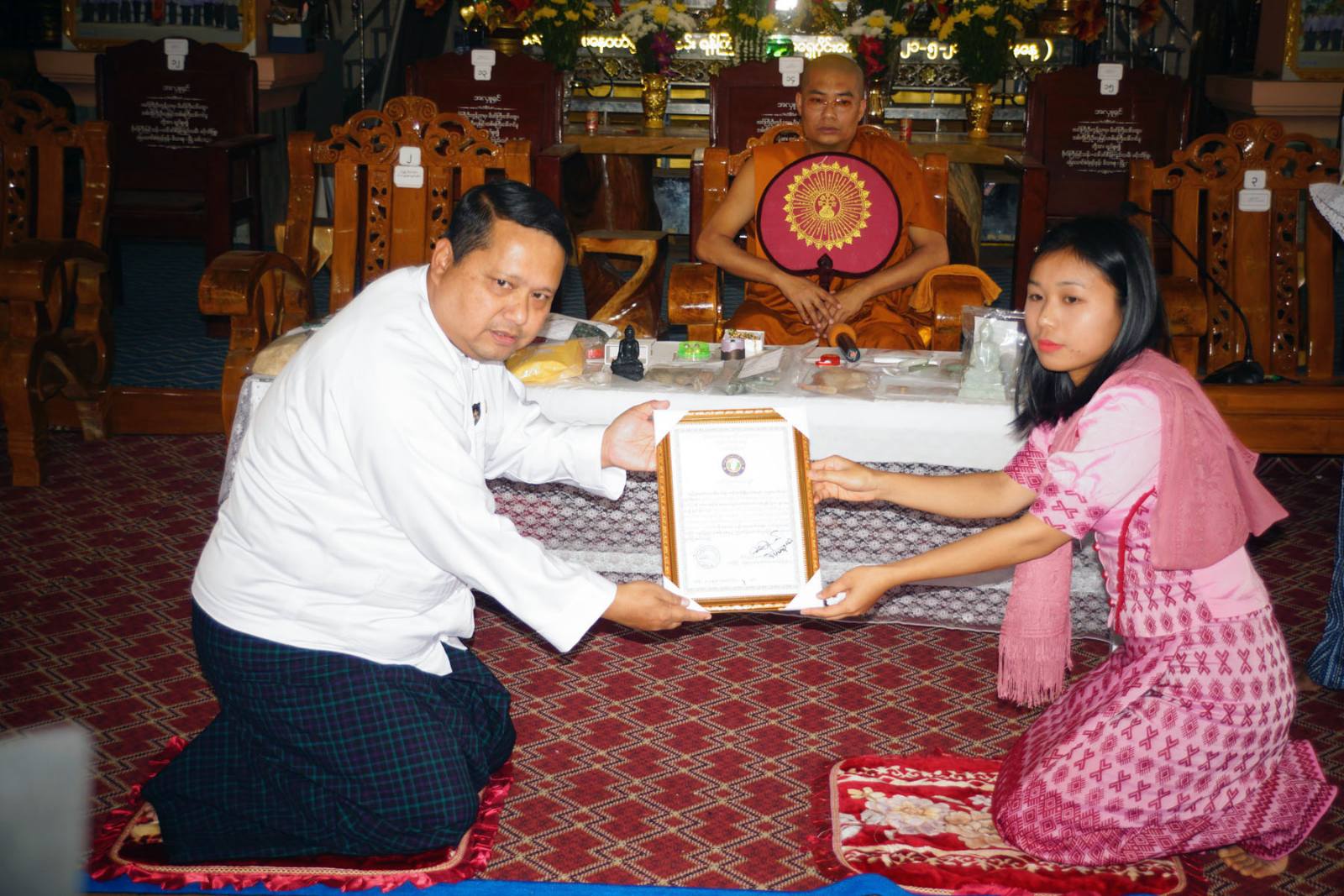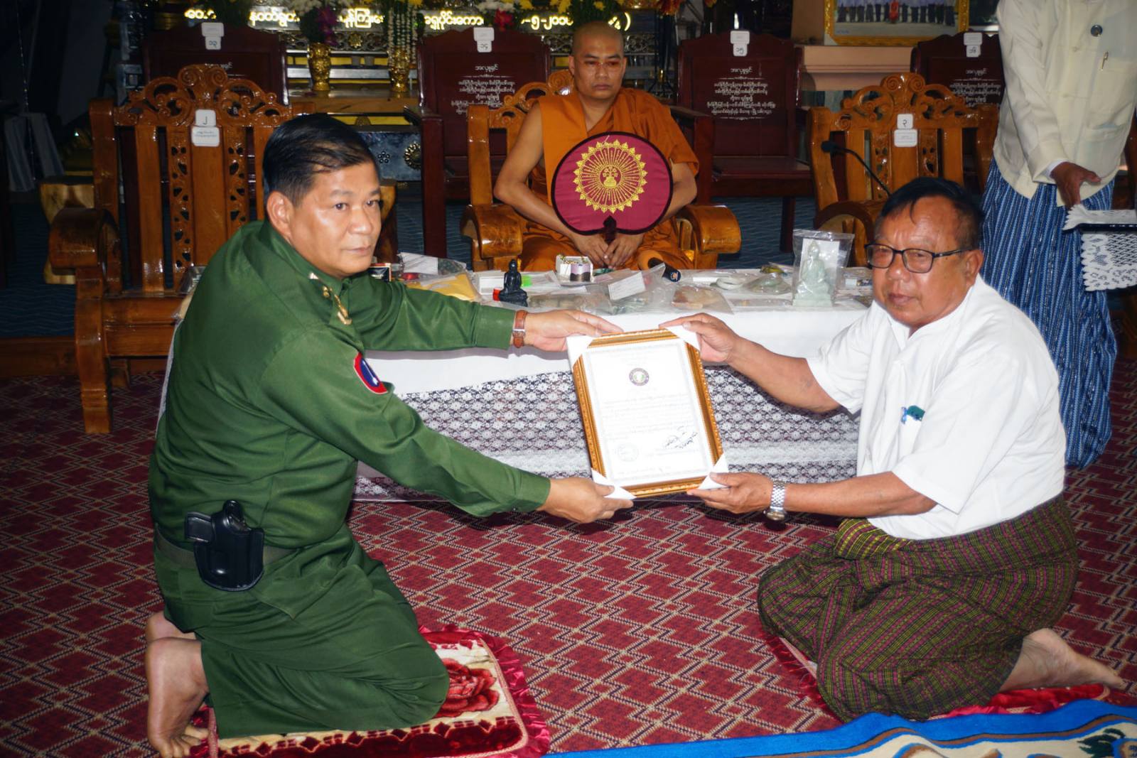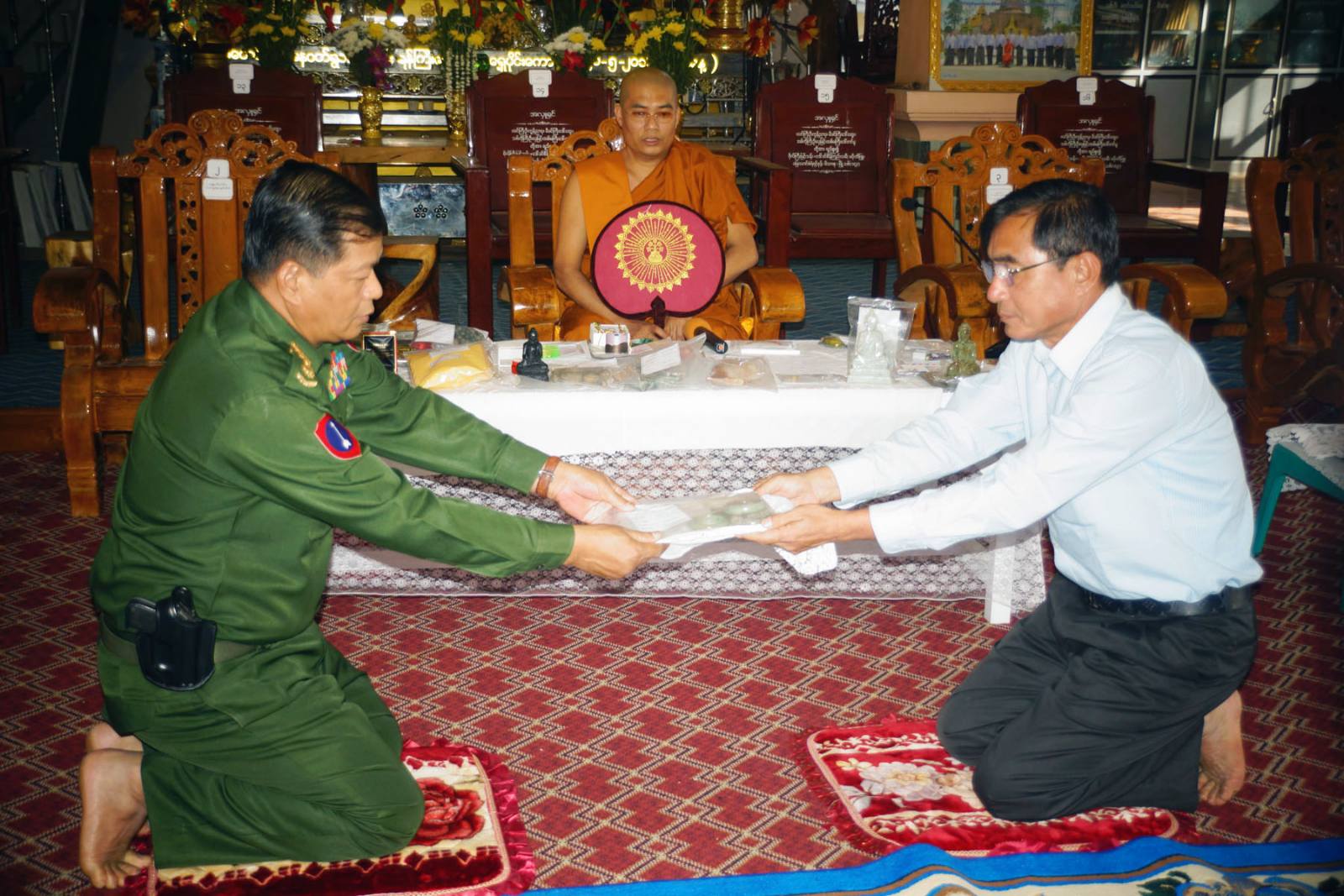 ထို့နောက် ကချင်ပြည်နယ်အစိုးရအဖွဲ့ဝင် ဝန်ကြီးများနှင့်မိသားစုများ၊ ပြည်နယ်ဥပဒေချုပ်နှင့်မိသားစု၊ ပြည်နယ်အစိုးရအဖွဲ့ အတွင်းရေး မှူးနှင့်မိသားစု၊ ပြည်နယ်/ခရိုင်/မြို့နယ် အထွေထွေ အုပ်ချုပ်ရေးဦးစီးဌာနမှ ဝန်ထမ်းမိသားစုများ၊ ဌာနဆိုင်ရာများ၊ စီးပွားရေးလုပ်ငန်းရှင်များ၊ ကုမ္ပဏီများ၊ စေတနာရှင်အလှူရှင်များက ရတနာပစ္စည်းများနှင့် အလှူတော်ငွေများအား ပေးအပ် လှူဒါန်းရာ မြောက်ပိုင်းတိုင်းစစ်ဌာနချုပ်မှ တိုင်းဦးစီးချုပ်၊ ပြည်နယ်အစိုးရအဖွဲ့မှ လုံခြုံရေးနှင့် နယ်စပ်ရေးရာဝန်ကြီးနှင့် လူမှုရေးရာဝန်ကြီးတို့က လက်ခံရယူခဲ့ပြီး အလှူရှင်များအား ဂုဏ်ပြုမှတ်တမ်းလွှာများ ပြန်လည်ပေးအပ်သည်။ယင်းနောက် မြစ်ကြီးနားမြို့ အံတော်ရှင်ကျောင်းတိုက်မှ ကချင် ပြည်နယ်တောင်တန်းသာသနာပြုဗဟိုခေါင်းဆောင် ဆရာတော် မဟာသဒ္ဓမ္မဇောတိကဓဇ ဒေါက်တာဘဒ္ဒန္တဉာဏဓဇထံ လှူဖွယ်ပစ္စည်းများဆက်ကပ်လှူဒါန်းပြီး၊ လှူဒါန်းမှုအစုစုတို့အတွက် ရေစက်သွန်းချ အမျှပေးဝေခဲ့သည်။