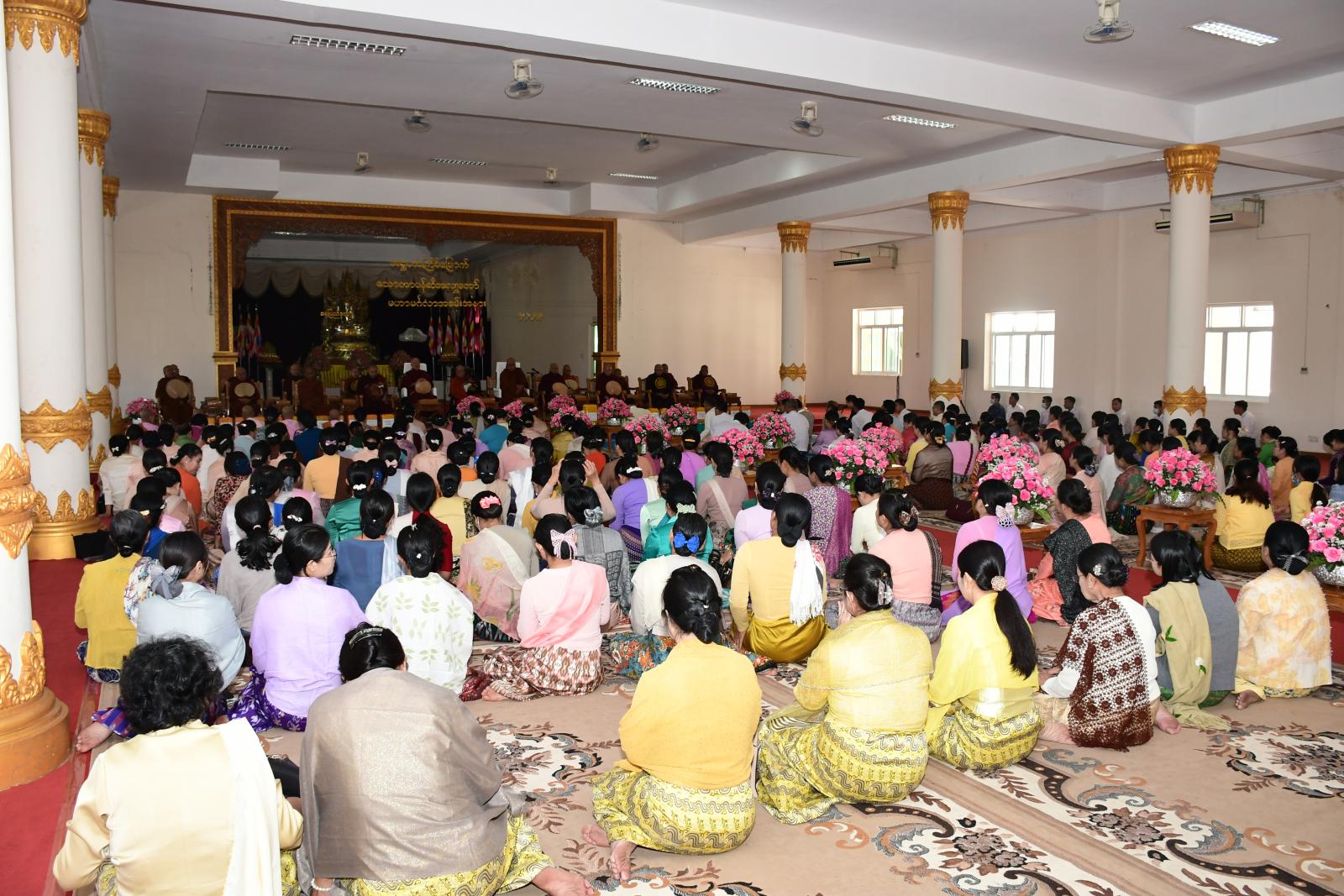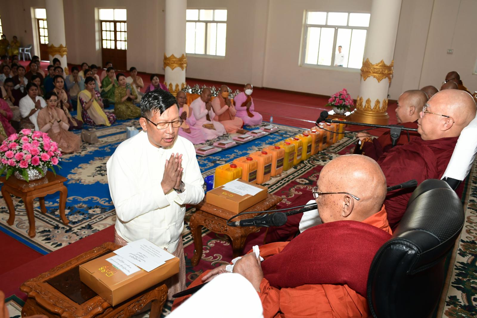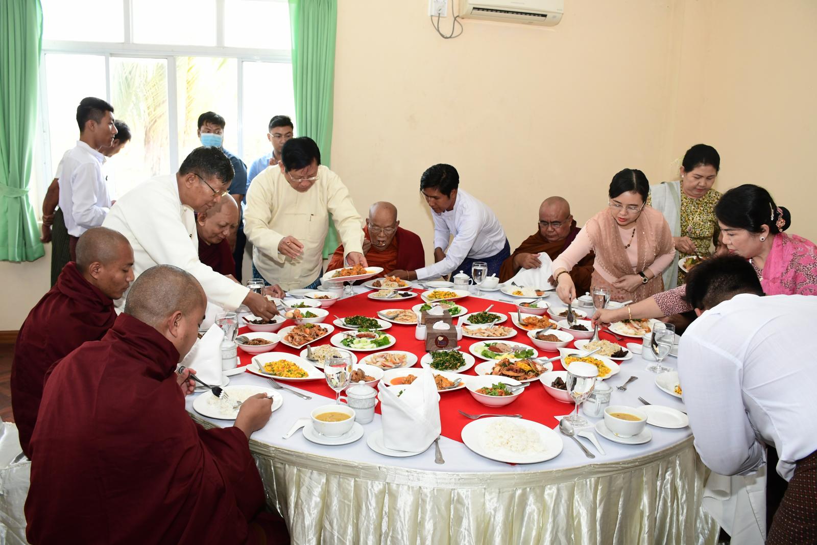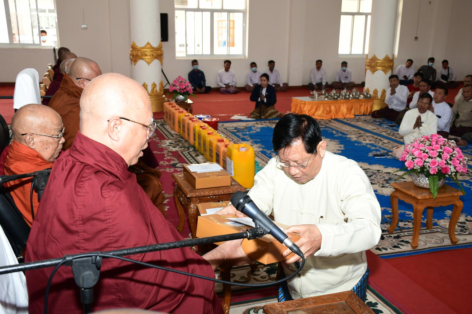 ထို့နောက် ပြည်ထောင်စုရွေးကောက်ပွဲကော်မရှင် ဥက္ကဋ္ဌ(ငြိမ်း) ဦးတင်အေး၊ နေပြည်တော်ကောင်စီဥက္ကဋ္ဌ ဦးတင်ဦးလွင်အမှူးပြုသည့် ဧည့်ပရိတ်သတ်များက အပြည်ပြည်ဆိုင်ရာ ထေရဝါဒဗုဒ္ဓတက္ကသိုလ် ပါမောက္ခချုပ်ဆရာတော် ဓမ္မဒူတဒေါက်တာအရှင်ဆေကိန္ဒထံမှ သာဓုအနုမောဓနာတရားနာယူကြပြီး လှူဒါန်းမှုအစုစုတို့အတွက် ရေစက်သွန်းချကာ ဆရာတော်သံဃာတော်များအား နေ့ဆွမ်းဆက်ကပ် လှူဒါန်းခဲ့ကြောင်း သိရသည်။
