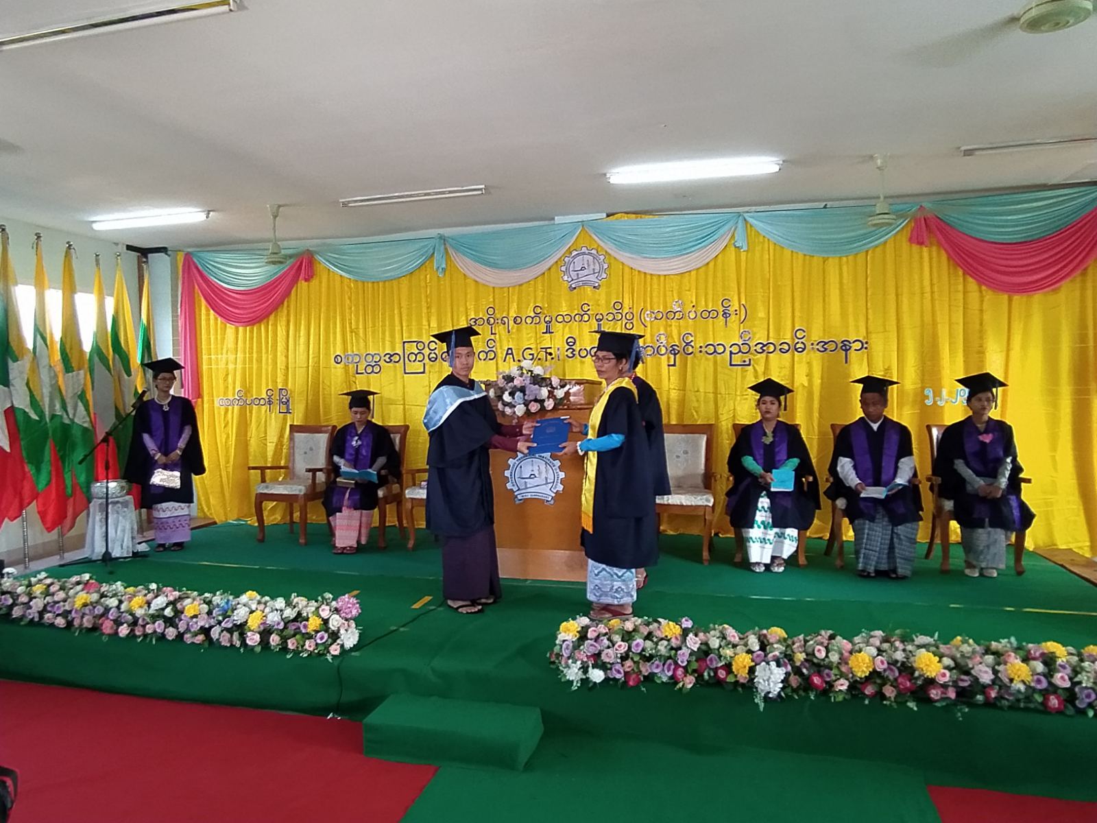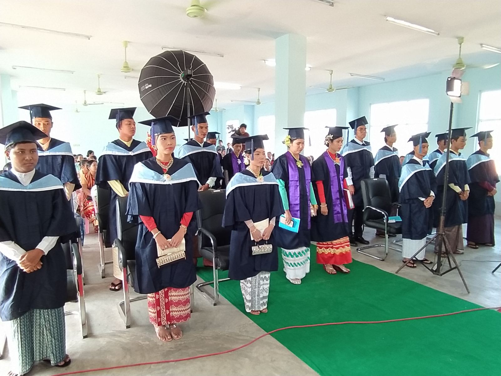ရှေးဦးစွာ တွဲဖက်ပါမောက္ခနှင့်တကွ တာဝန်ရှိသူများက ဘွဲ့နှင်းသဘင်စင်မြင့်ရှိ သတ်မှတ်နေရာ အသီးသီး၌ နေရာယူကြပြီး တက်ရောက်လာကြသူများနှင့်အတူ နိုင်ငံတော်သီချင်းဖြင့် နိုင်ငံတော်အလံကို အလေးပြုကြသည်။ ယင်းနောက် တွဲဖက်ပါမောက္ခ ဒေါ်သင်းသင်းဆွေက အထူးပြုဘာသာရပ်အလိုက် ဘွဲ့ရရှိသူများကို ဘွဲ့လက်မှတ်များ အသီးသီးအပ်နှင်းချီးမြှင့်သည်။