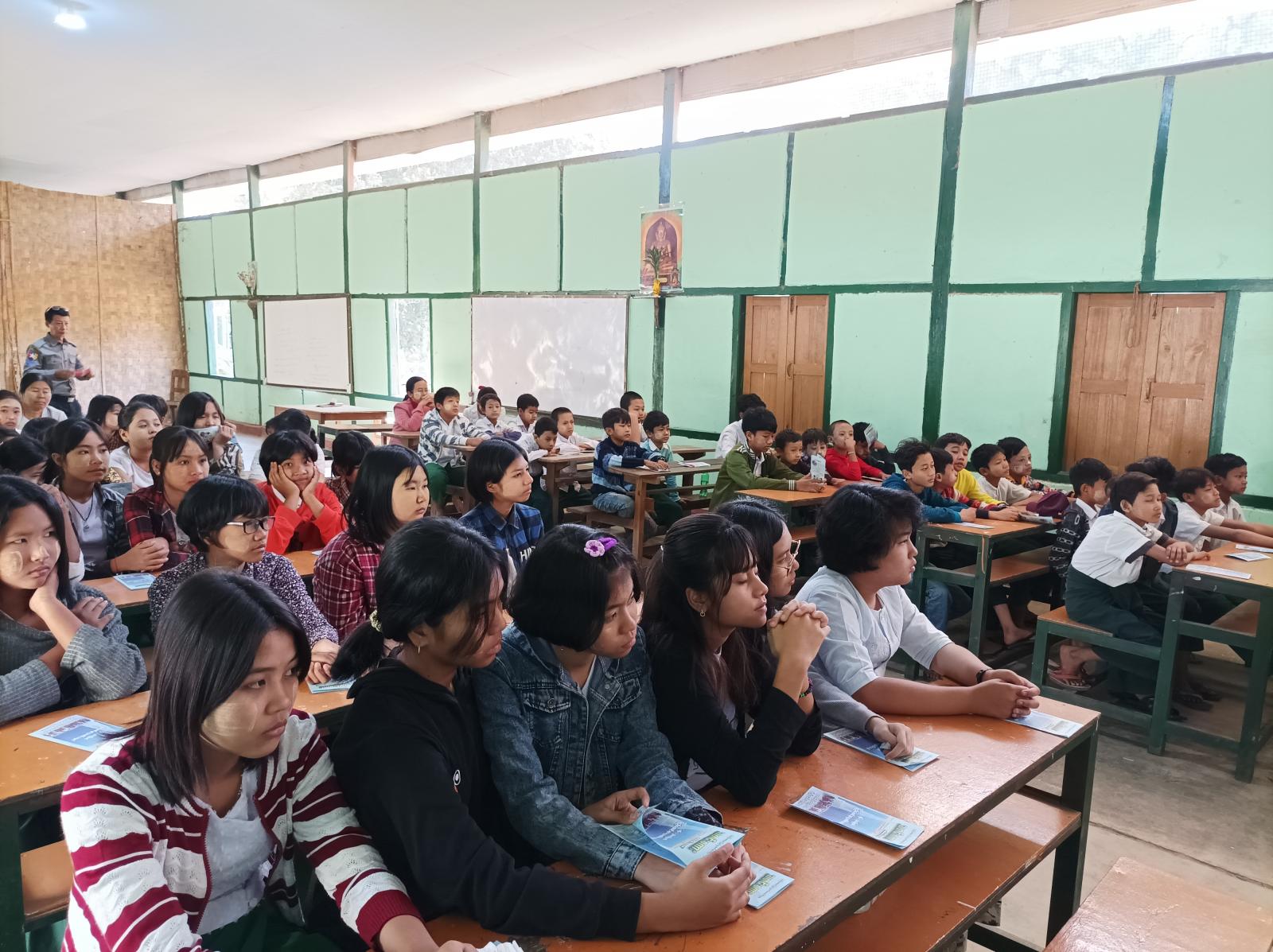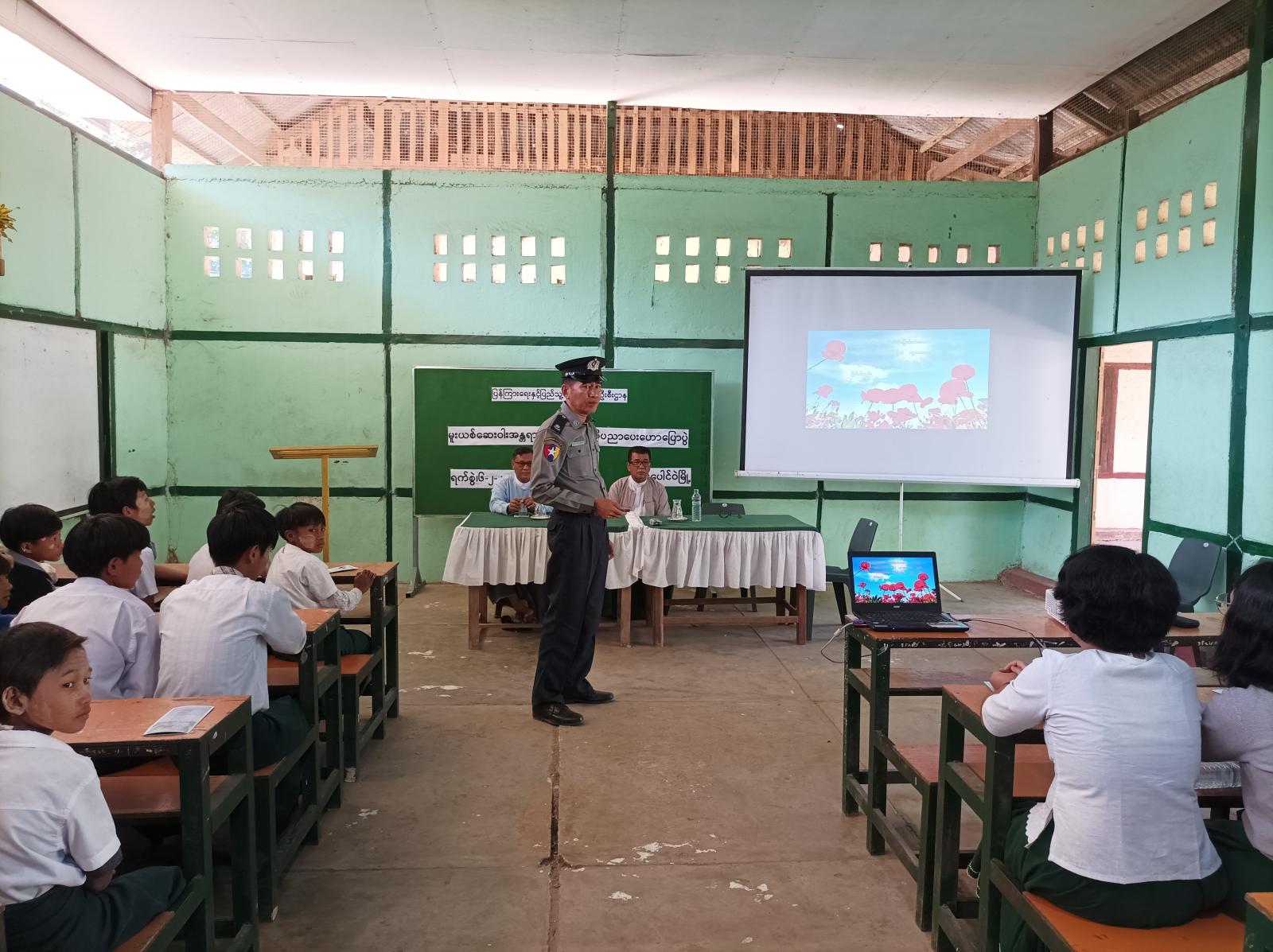 ဆက်လက်ပြီး မြို့နယ်ရဲတပ်ဖွဲ့မှ ရဲမှူးအောင်ကျော်မြင့်က မူးယစ်ဆေးဝါးပြဿနာများ၊ မူးယစ်ဆေးဝါးစတင်အသုံးစွဲသည့် အဓိကအကြောင်းအရင်း၊ အရွယ်အလိုက် တာဝန်ရှိမှု၊ တာဝန်သိမှု၊ မူးယစ်ဆေးသံသရာ၊ မူးယစ်ဆေးဝါးဆိုင်ရာ ဆောင်ပုဒ်များ စသည့် အကြောင်းအရာများကို ကျောင်းသား၊ ကျောင်းသူလူငယ်လူရွယ်များ ကျယ်ကျယ်ပြန့်ပြန့် သိရှိစေရန် power point ဖြင့် ချပြရှင်းလင်း အသိပညာပေး ဟောပြောခဲ့ကြောင်း သိရသည်။