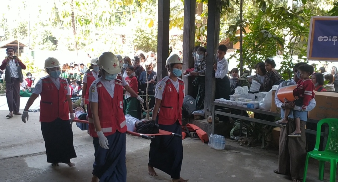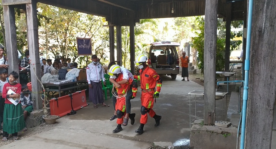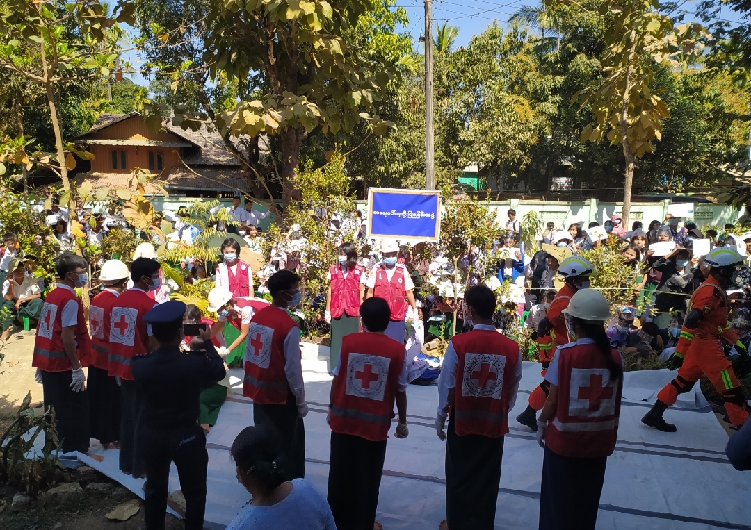 ထို့နောက် မီးသတ်တပ်ဖွဲ့ဝင်များက ရှာဖွယ်ကယ်ဆယ်ရေးလုပ်ငန်းများဆောင်ရွက်ရာ ပျောက် ဆုံးနေသူ (၃) ဦးကို ရှာဖွယ်ကယ်ဆယ်ခဲ့ပြီး ကြက်ခြေနီတပ်ဖွဲ့ဝင်များက ကျောင်းသား(၃) ဦးကို စု ရပ်အနီးသတ်မှတ်နေရာသို့ သယ်ဆောင်နည်းဖြင့် သယ်ယူခဲ့ပြီး ရှေးဦးပြုစုခြင်း၊ ခေါင်းထိခိုက်မိ၍ အရေးပေါ်ကုသရန်လိုအပ်သည့်ကျောင်းသားအား ကရုဏာလှိုင်းသွေးလှူရှင်များ အသင်းအရေးပေါ်ကားလူနာတင်ယာဉ်ဖြင့် ပို့ဆောင်ခြင်း၊ စုရပ်မှကျောင်းသား/ကျောင်းသူများအား မိဘများ ထံပြန်လည်အပ်နှံခြင်း ငလျင်ဘေးအန္တရာယ်သဏ္ဍာန်တူ ဇာတ်တိုက်လေ့ကျင့်ခဲ့ကြသည်။