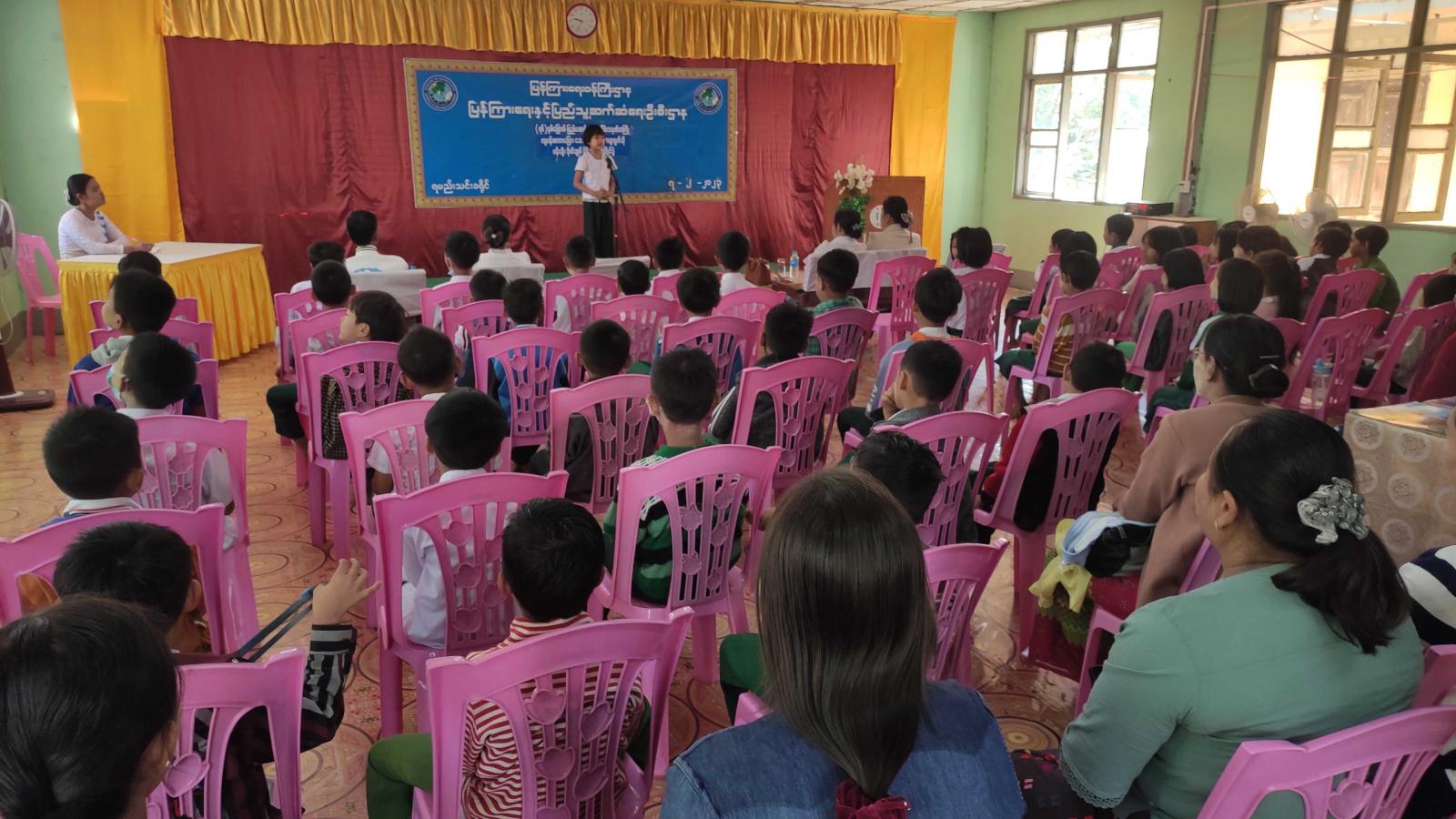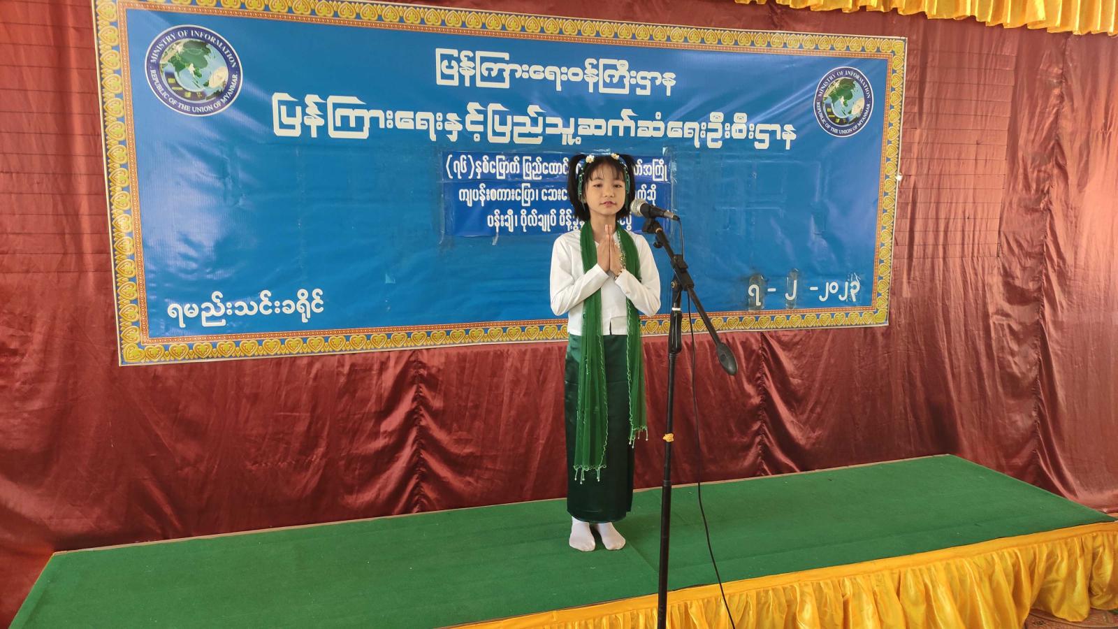 ရှေးဦးစွာရမည်းသင်းခရိုင် ပြန်ကြားရေးနှင့်ပြည်သူ့ဆက်ဆံရေးဦးစီးဌာန၊ လက်ထောက်ညွန်ကြားရေးမှူးဒေါ်သိမ့်သိမ့်မျိုးက (၇၆) နှစ်မြောက်ပြည်ထောင်စုနေ့ အထိမ်းအမှတ်အကြို မူလတန်းအဆင့်ကဗျာရွတ်ဆိုပြိုင်ပွဲ ကျင်းပခြင်းရည်ရွယ်ချက် နှင့်ပြိုင်ပွဲစည်းချက် များကိုရှင်းလင်းပြောကြားသည်။