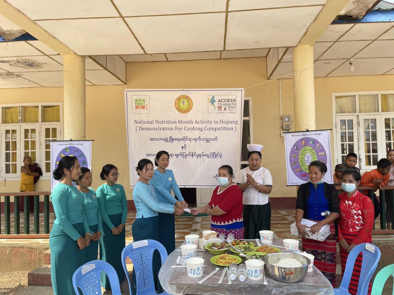 ပြိုင်ပွဲဝင်ခဲ့သည့်အဖွဲ့များအား ဟိုပန်ပြည်သူ့ဆေးရုံမှ သွားနှင့်ခံတွင်းဆရာဝန် ဒေါက်တာကျော်ဇင်သက်နှင့် ဆရာမများ၊ ခရိုင်မိခင်နှင့်ကလေးစောင့်ရှောက်မူကြီးကြပ်ရေးအဖွဲ့ ဥက္ကဋ္ဌ ဒေါ်နီလာခိုင်၊ မြို့နယ်အမျိုးသမီးရေးရာအဖွဲ့ဥက္ကဋ္ဌ ဒေါ်ချယ်ရီစိုးနှင့်အဖွဲ့ဝင်များက အာဟာရဆိုင်ရာချက်ပြုတ်နိုင်မူ စွမ်းရည်ပြိုင်ပွဲစည်းကမ်းချက်များနှင့် ကိုက်ညီသည့်အဖွဲ့အား ဆုများပေးအပ်ခဲ့ပြီး ပြိုင်ပွဲဝင်သူများအား မေတ္တာလက်ဆောင်များ ပေးအပ်ချီးမြှင့်ခဲ့ကြကြောင်း သိရသည်။