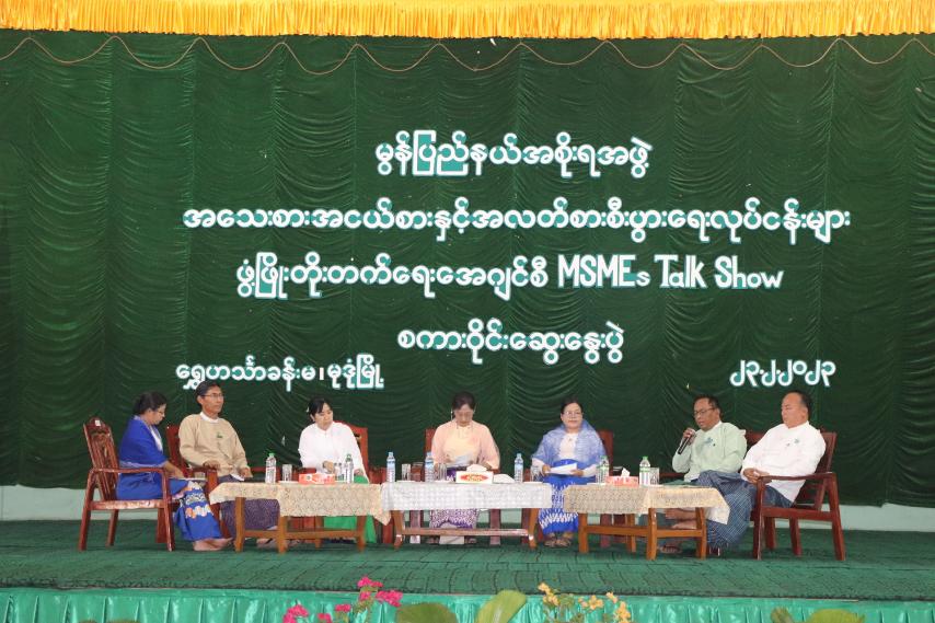 မွန်ပြည်နယ် အသေးစား၊ အငယ်စားနှင့် အလတ်စား စီးပွားရေးလုပ်ငန်းများ ဖွံ့ဖြိုးတိုးတက်ရေး အေဂျင်စီ MSMEs Talk Show စကားဝိုင်း ဆွေးနွေးပွဲကို ယမန်နေ့ နံနက်ပိုင်းက မုဒုံမြို့၊ ရွှေဟင်္သာခန်းမ၌ ကျင်းပပြုလုပ်ရာ မွန်ပြည်နယ်ဝန်ကြီးချုပ်ဦးအောင်ကြည်သိန်း၊ ပြည်နယ်ဝန်ကြီးများ၊ ဌာနဆိုင်ရာတာဝန်ရှိသူများ၊ အသေးစား၊ အငယ်စားနှင့် အလတ်စား စီးပွားရေးလုပ်ငန်းရှင်များ ဖိတ်ကြားထားသူများ တက်ရောက်ကြသည်။
