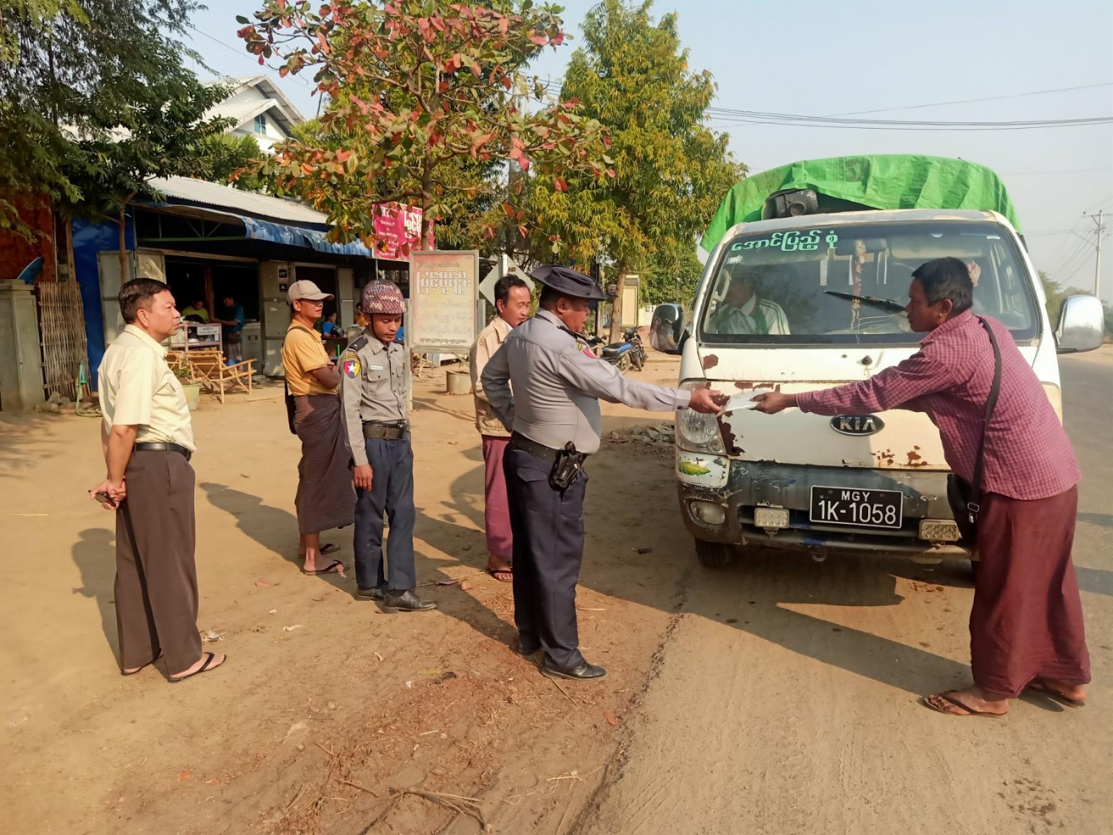 ထိုသို့စစ်ဆေးခဲ့ရာ မြို့နယ်စီမံအုပ်ချုပ်ရေးအဖွဲ့ဥက္ကဋ္ဌ မြို့နယ်အုပ်ချုပ်ရေးမှူး ဦးသန့်စင်နှင့် အဖွဲ့ဝင်များ ၊ မြို့နယ်ရဲတပ်ဖွဲ့မှူးရဲမှူး တင်ကိုကိုနှင့် တပ်ဖွဲ့ဝင်များ၊ မြို့နယ် ပုဂ္ဂလိက မော်တော်ယာဉ်လိုင်းများ ကြီးကြပ်ရေးကော်မတီဥက္ကဋ္ဌဦးချင်ဟိုနှင့် အဖွဲ့ဝင်များက စုပေါင်း၍ ကိုယ်ပိုင်မော်တော်ယာဉ်များ၊ အဝေးပြေခရီးသည်ယာဉ်များနှင့် ကုန်တင်ယာဉ်များအား ဖောင်းကြွ နံပါတ်ပြားအသစ် တပ်ဆင်ထားခြင်း ရှိ/မရှိ စစ်ဆေးခဲ့ကြပြီး တပ်ဆင်ခြင်း မရှိသေးပါက မတ်လ (၃၁) ရက်နေ့အပြီး ဖောင်းကြွနံပါတ်ပြားအသစ် လဲလှယ်တပ်ဆင်သွားရန် မော်တော်ယာဉ် စုစုပေါင်း (၁၆၀) စီးအား အသိပညာပေးပြောကြားခဲ့ကြောင်း သိရသည်။