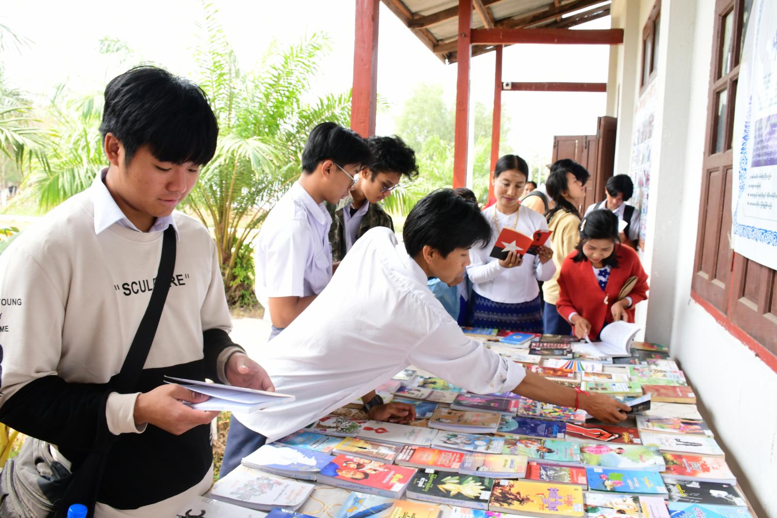 အစိုးရနည်းပညာအထက်တန်းကျောင်း(ကျိုင်းတုံ)၌ စာဖတ်ရှိန်မြှင့်တင်ရေး အသိပညာပေးဟောပြာပွဲ၊ နယ်လှည့်စာကြည့်တိုက်၊ နံရံကပ်စာစောင်နှင့် ဓာတ်ပုံပြပွဲကို ယမန်နေ့နံနက် ၁၀ နာရီခွဲက ကျင်းပသည်။