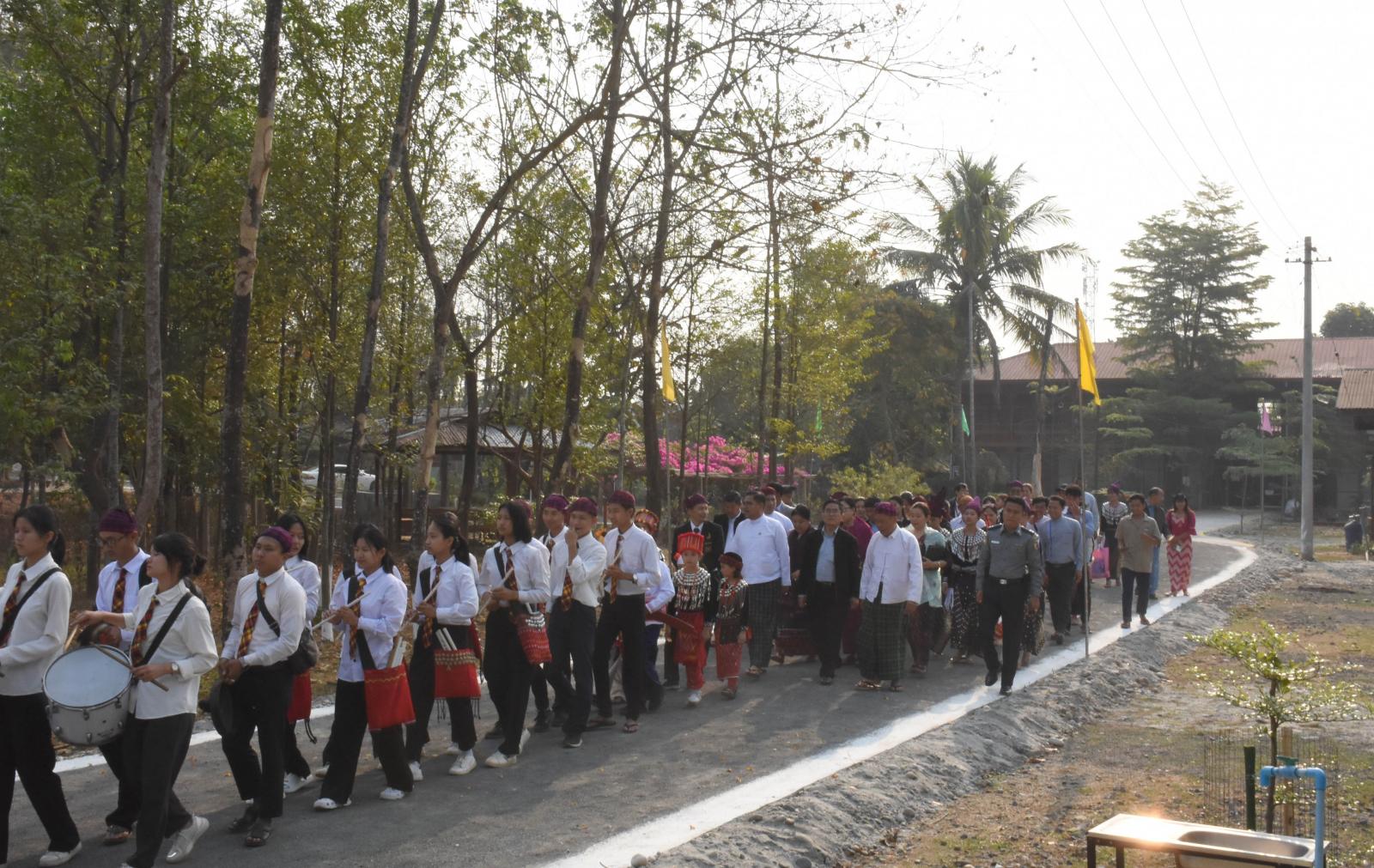 လမ်းသစ်ကို သိက္ခာတော်ရဆရာတော်များက ဆုတောင်းဆက်ကပ်ပေးခြင်း၊ ဓမ္မတေးသီချင်း များသီဆိုခြင်း၊ ကောင်းချီးပေးဆုတောင်းဆက်ကပ်ခြင်းများကို ဆောင်ရွက်ခဲ့ကြပြီး ကတ္တရာလမ်း သစ်ကို ပြည်နယ်ဝန်ကြီးချုပ်၊ သိက္ခာတော်ရဆရာ လယော်ဒေါင်ဟောင်း၊ သိက္ခာတော်ရဆရာ ဒေါက်တာဆိုင်းခွမ်၊ ဒူဝါဒေါက်တာဘန်လွန်ဘွမ်ယွန်တို့က ဖဲကြိုးဖြတ်ဖွင့်လှစ်ပေးကြကာ ကတ္တရာ လမ်းသစ်အား ဖြတ်သန်းကြည့်ရှုစစ်ဆေးခဲ့ကြသည်။