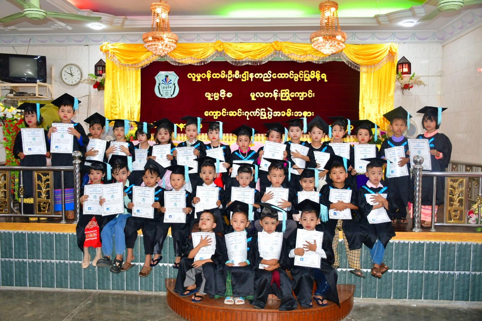 ထို့နောက် တာဝန်ရှိသူများက အဆိုပါကျောင်း၌ ၂၀၂၂- ၂၀၂၃ ပညာသင်နှစ်တွင် တက်ရောက်ခဲ့သော သားငယ်၊ သမီးငယ်(၃၀)ဦးအား ကျောင်းဆင်းဂုဏ်ပြုလက်မှတ်များ အသီးသီးပေးအပ်ချီးမြှင့်ကြပြီး ကျောင်းသားမိဘများကိုယ်စား မိဘတစ်ဦးကကျေးဇူးတင်စကားပြန်လည်ပြောကြားသည်။ ယင်းနောက် ဂုဏ်ပြုခံကလေးများနှင့်အတူ အမှတ်တရမှတ်တမ်းဓာတ်ပုံများရိုက်ကူးကြကြောင်း သိရသည်။