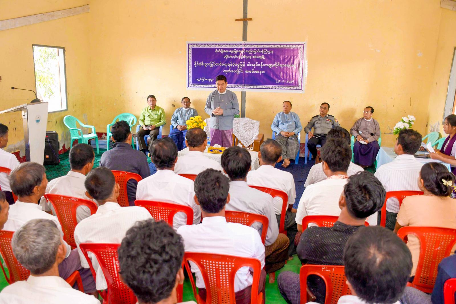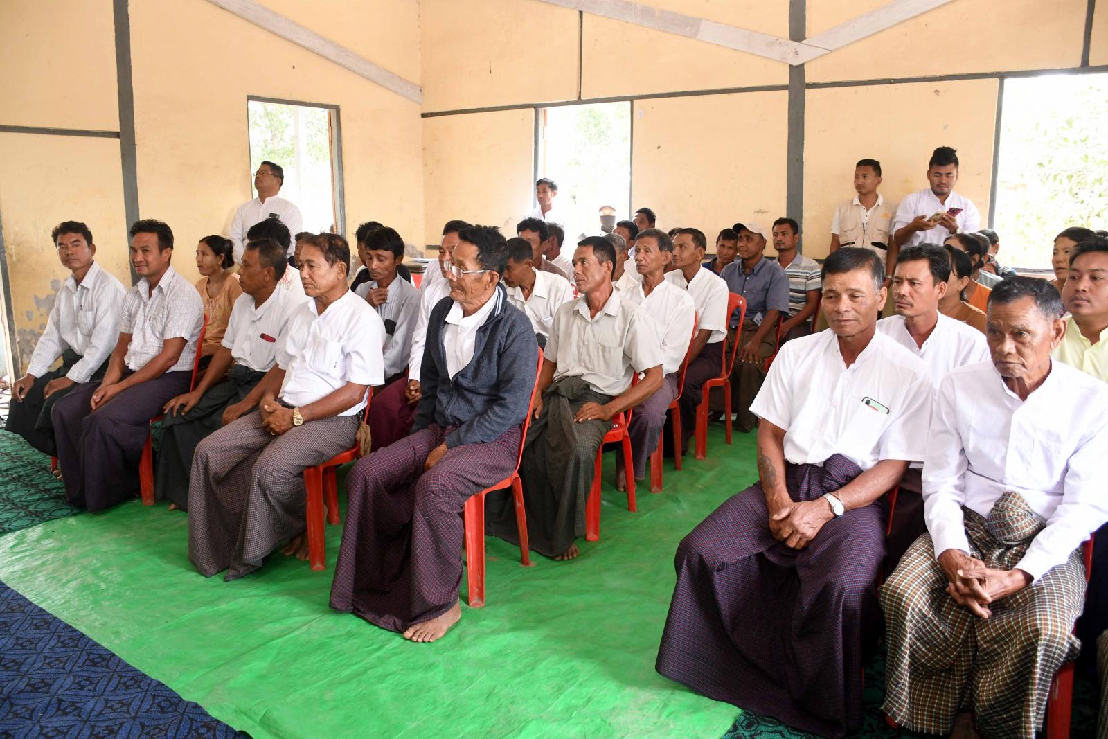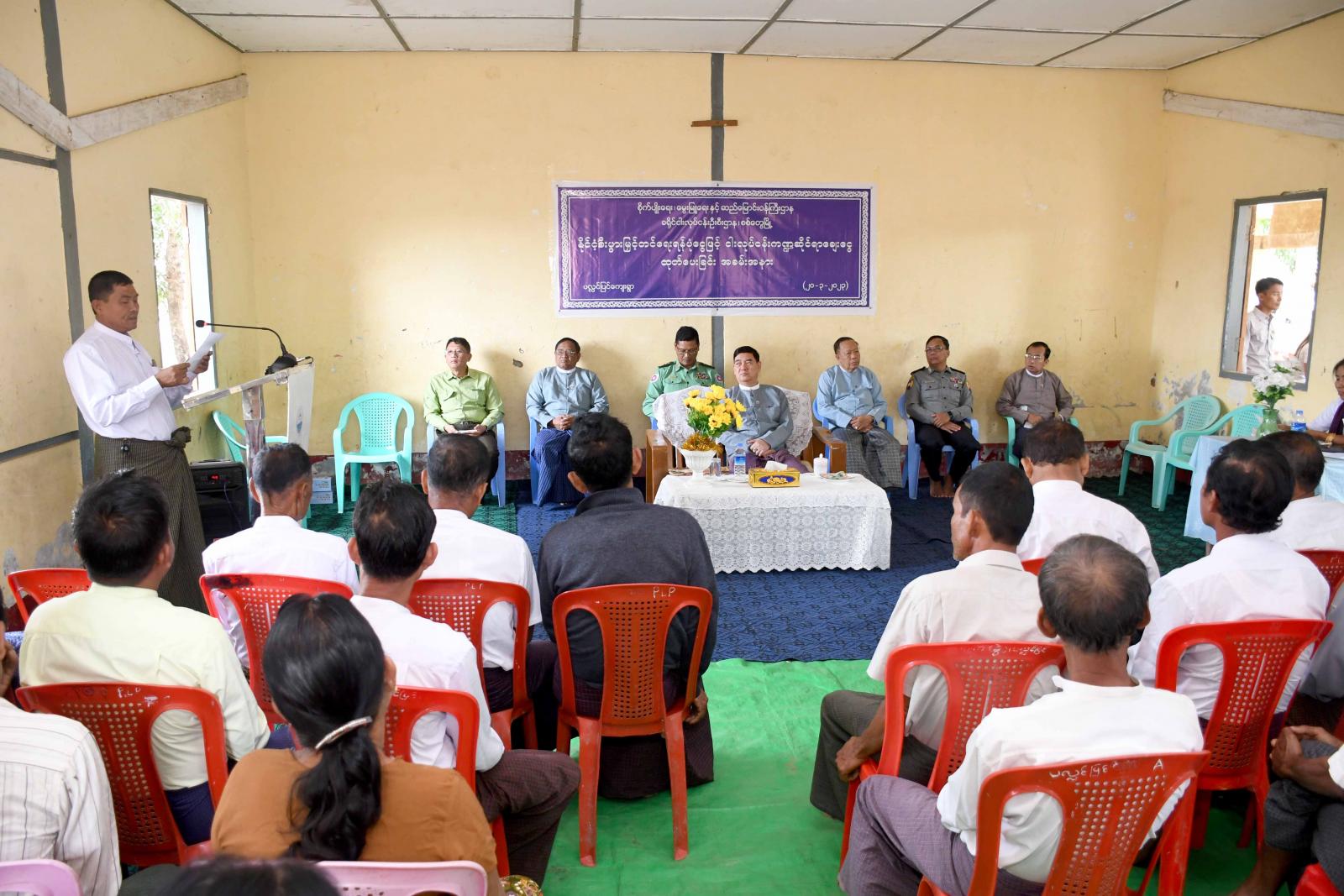 အခမ်းအနားတွင် ပြည်နယ်ဝန်ကြီးချုပ် ဦးထိန်လင်းက တိုင်းရင်းသားများ၏ လူမှုစီးပွားဘဝ ဖွံ့ဖြိုးတိုးတက်ရေးအတွက်၊ ငါးလုပ်ငန်းကဏ္ဍဖွံ့ဖြိုးတိုးတက်ရေးအစုအဖွဲ့အတွက် နိုင်ငံ့စီးပွားမြှင့်တင် ရေးရန်ပုံငွေမှ ချေးငွေထုတ်ချေးပေးခြင်းဖြစ်ကြောင်း၊ ယခုချေးငွေကို အစုအဖွဲ့များဖြင့်၊ ကြီးကြပ်မှု ကော်မတီများဖြင့် မပျောက်မပျက်ရအောင် အဓိကအားဖြင့် တိုးပွားလာအောင် ဆောင်ရွက်သွား ကြရမည်ဖြစ်ကြောင်း၊ မိမိဒေသ၊ မိမိရပ်ရွာတွင်ရှိသော စိုက်ပျိုးရေး၊ မွေးမြူရေးလုပ်ငန်းများကို ယခင် ထက်အထွက်နှုန်းကောင်းအောင်၊ ယခင်ထက် တိုးပွားလာအောင် ဆောင်ရွက်ကြရမည်ဖြစ်ကြောင်း၊ မိသားစုတစ်စုချင်း ဖွံ့ဖြိုးတိုးတက်လာမှ မိမိရပ်ရွာ၊ မိမိဒေသ ဖွံ့ဖြိုးတိုးတက်လာမည်ဖြစ်ကြောင်းနှင့် ယခုမိမိတို့ ပေးအပ်ထားသည်ငွေများအပေါ်တွင် ဆထက်တိုးပွားအောင်ရွက်ခြင်းဖြင့် မိသားစုလူမှုစီးပွားဘဝ ဖွံ့ဖြိုးတိုးတက်နိုင်ကြပါစေကြောင်း ပြောကြားသည်။ ဆက်လက်၍ ရခိုင်ပြည်နယ် ငါးလုပ်ငန်းဦးစီးဌာနမှ ဒုတိယညွှန်ကြားရေးမှူး ဦးဦးထွန်းသိန်းက နိုင်ငံ့စီးပွားမြှင့်တင်ရေး ရန်ပုံငွေမှ ချေးငွေပေး အပ်ရခြင်းနှင့် ပတ်သက်၍ ရှင်းလင်းတင်ပြသည်။