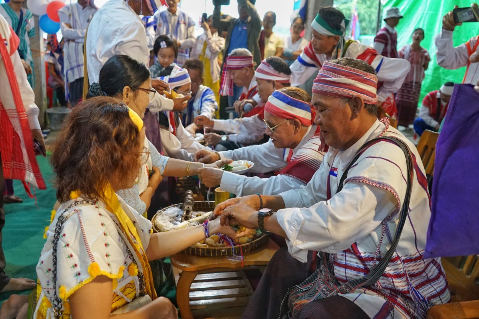 ချည်ဖြူဖွဲ့မင်္ဂလာပွဲတော်တွင် ကရင်အမျိုးသားအလံတော်အား လွှင့်ထူအလေးပြုကြပြီး၊ ကျိုက္ကော်ဓမ္မဒူတသုခိတာရုံကျောင်းတိုက် ပဓာနနာယကဆရာတော် အဂ္ဂမဟာသဒ္ဓမဇောတိကဓဇ ဘဒ္ဒန္တသုဓမ္မထံမှ တက်ရောက်လာသူတို့က သြဝါဒစကားများ နာကြားကြသည်။