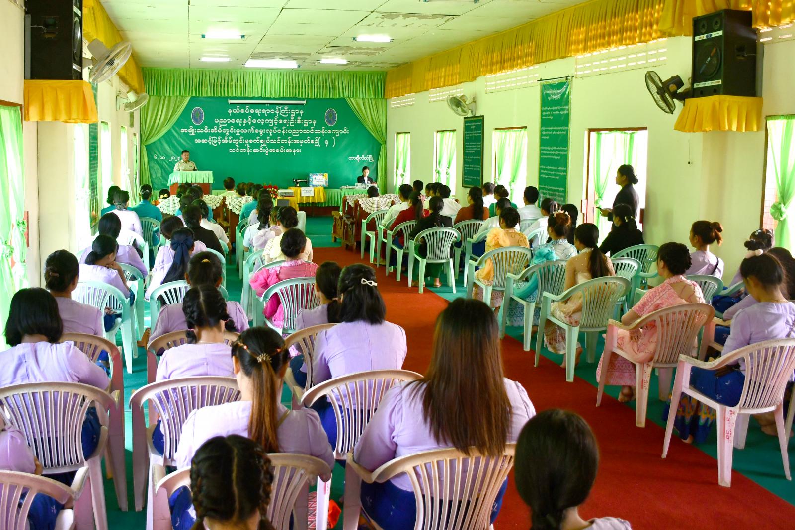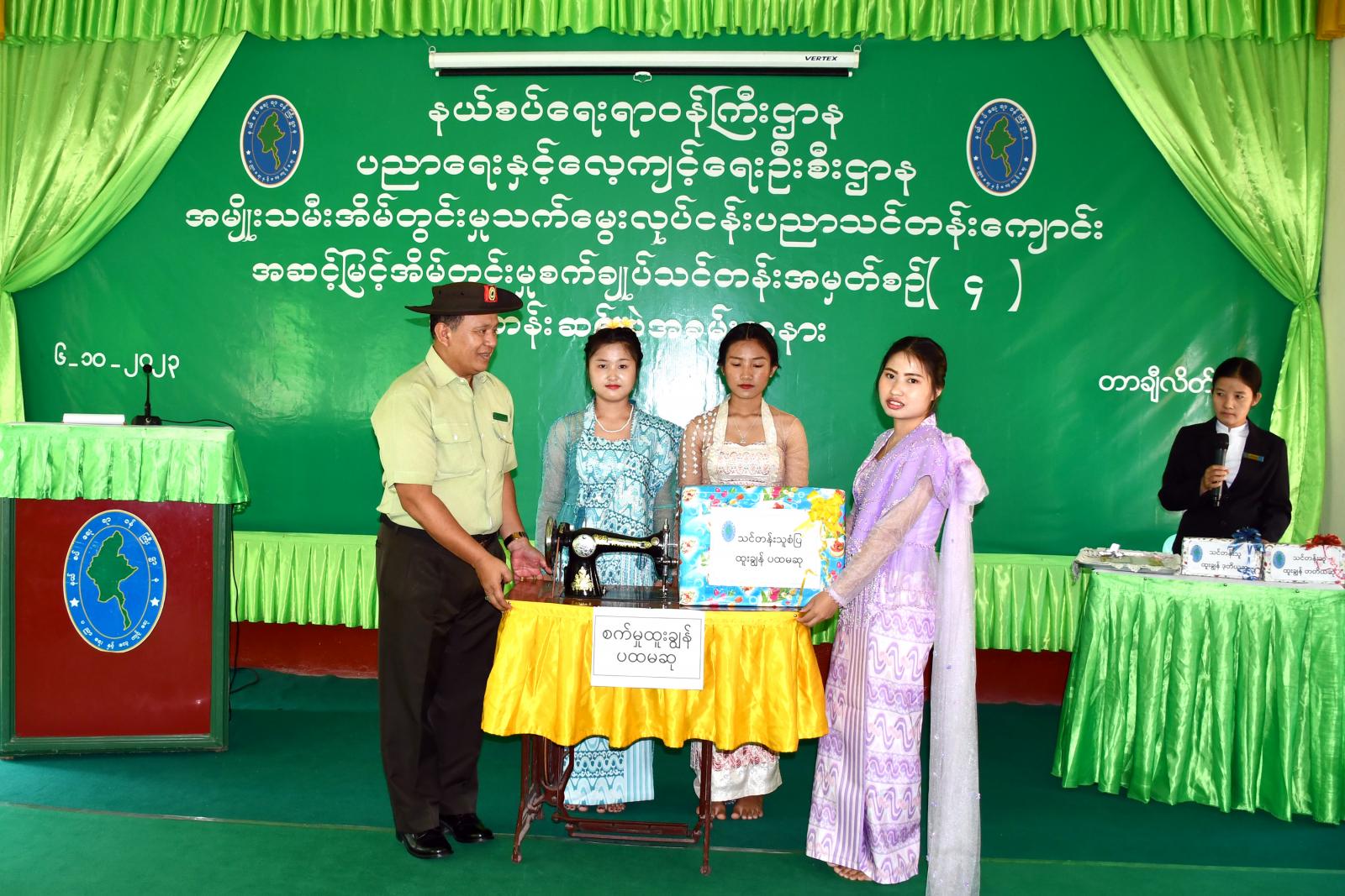 ဦးစွာ ခရိုင်စီမံအုပ်ချုပ်ရေးအဖွဲ့ဥက္ကဋ္ဌဦးမြင့်နိုင်က အမှာစကားပြောကြားပြီး အမျိုးသမီးအိမ်တွင်းမှု သက်မွေးလုပ်ငန်းပညာသင်တန်းကျောင်းမှ ဒုတိယကျောင်းအုပ်ကြီးဒေါ်ခန့်စုယဉ်က သင်တန်းကျောင်းဆိုင်ရာအချက်အလက်များအား ရှင်းလင်းတင်ပြကာ သင်တန်းတွင် ထူးချွန်ပထမဆုရရှိသော မဂျီးလာအား ခရိုင်စီမံအုပ်ချုပ်ရေးအဖွဲ့ဥက္ကဋ္ဌ ဦးမြင့်နိုင်၊ ဒုတိယဆုရရှိသော မနာစောတီအား ခရိုင်ရဲတပ်ဖွဲ့မှူး ဒုတိယရဲမှူးကြီးဇော်လင်းအောင်၊ တတိယဆုရရှိသော မဒီးနာအား ခရိုင်လူဝင်မှုကြီးကြပ်ရေးနှင့်ပြည်သူ့အင်အားဝန်ကြီးဌာန၊ ခရိုင်ဦးစီးမှူးဦးသန့်ဇင်နှင့် သင်တန်းဆင်းအောင်လက်မှတ်များကို ခရိုင်ဖွံ့ဖြိုးမှုကြီးကြပ်ရေးရုံး၊ ဒုတိယညွှန်ကြားရေးမှူး ဒေါ်ဖြူပြာခတို့က အသီးသီးချီးမြှင့်ပေးအပ်ရာ သင်တန်းသူများကိုယ်စား သင်တန်းသူတစ်ဦးက ကျေးဇူးတင်စကားပြန်လည်ပြောကြားသည်။