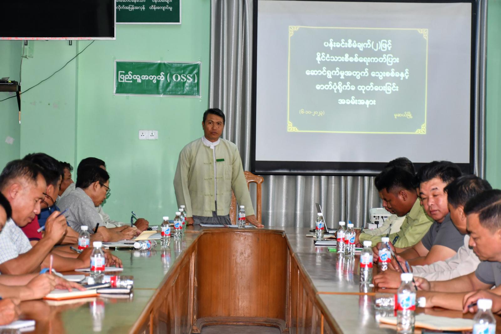 ရှေးဦးစွာ မူဆယ်မြို့နယ်စီမံအုပ်ချုပ်ရေးအဖွဲ့ဥက္ကဋ္ဌ၊ မြို့နယ်အုပ်ချုပ်ရေးမှူးဦးဇော်လင်းက တက်ရောက်လာသော ဌာနဆိုင်ရာများ၊ ရပ်/ကျေးစာရေးများ၊ ရပ်/ကျေးအုပ်ချုပ်ရေးမှူးများအား အမှာစကားပြောကြားခဲ့ပြီး မူဆယ်မြို့နယ်လူဝင်မှုကြီးကြပ်ရေးနှင့်ပြည်သူ့အင်အားဝန်ကြီးဌာန၊ မြို့နယ်ဦးစီးအရာရှိဦးစန်းလွင်က ပန်းခင်းစီမံချက်ဆောင်ရွက်ချက်များ၊ နိုင်ငံသားမှတ်ပုံတင်မရှိကြသူများစာရင်းကို ရပ်ကွက်/ကျေးရွာအုပ်ချုပ်ရေးမှူးများကို စာရင်းကောက်ယူပြီး မြေပြင်ထိကွင်းဆင်းကာ နိုင်ငံသားစိစစ်ရေးကတ်ပြားများ ပြုလုပ်ဆောင်ရွက်ပေးမည်ဖြစ်ကြောင်း၊ နိုင်ငံသားမှတ်ပုံတင်လဲလှယ်ဆောင်ရွက်ပေးရမည် စာရင်းများနှင့် ယာယီအိမ်ထောင်စုစာရင်းများကိုလည်း ဖြန့်ဝေဆောင်ရွက်လျက်ရှိကြောင်း ပြောကြားခဲ့ပါသည်။ ဆက်လက်ပြီး မြို့နယ်အုပ်ချုပ်ရေးမှူးနှင့်တကွ မြို့နယ်လဝကဦးစီးမှူးတို့မှ မြို့နယ်အတွင်းရှိ မြို့အုပ်ချုပ်ရေးမှူးများနှင့် ရပ်ကွက်/ ကျေးရွာအုပ်ချုပ်ရေးမှူးများမှတစ်ဆင့် ပန်းခင်းစီမံချက်(၂)ဖြင့် ဆောင်ရွက်ထားသူ(၄၆၈၉)ဦးအတွက် သွေးစစ်ခနှင့်ဓာတ်ပုံရိုက်ခ စုစုပေါင်းမြန်မာငွေ(၁၄၀၆၇၀၀၀)ကျပ်အား ထုတ်ပေးခဲ့ကြောင်း သိရသည်။