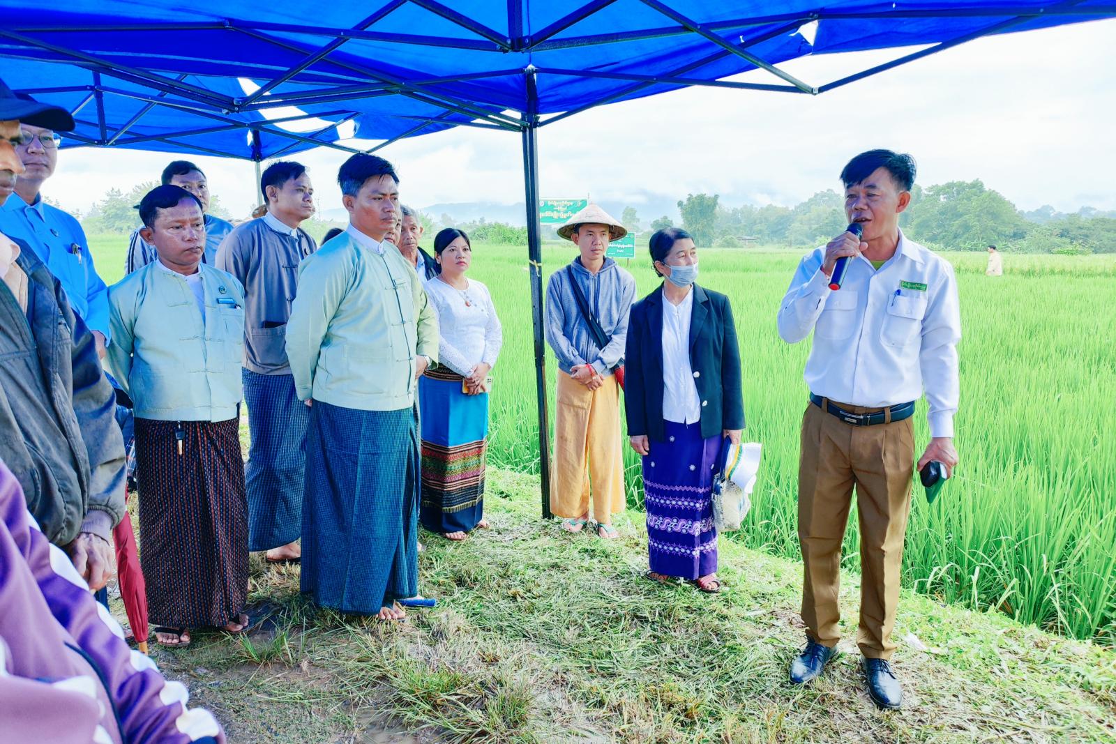 မိုးစပါးမှော်ဘီကောက်ညှင်းမွှေး မျိုးစေ့ထုတ် (FS-RS) စိုက်ခင်း မျိုးကွဲနှုတ်ပယ်ခြင်း သရုပ်ပြပွဲကို ယမန်နေ့နံနက် (၉)နာရီ အချိန်က လားရှိုးမြို့၊ ဟူးမွန်ကျေးရွာအုပ်စု၊ ရေပူကွင်းရှိ တောင်သူ ဦးစိုင်းလှကျော်၏ လယ်ကွင်းတွင် ကျင်းပပြုလုပ်သည်။