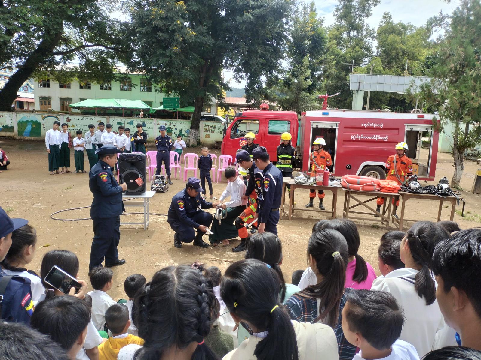 ထိုသို့ဆောင်ရွက်ရာတွင် မြို့နယ်မီးသတ်ဦးစီးဌာန မြို့နယ်မီးသတ်ဦးစီးမှူး ဦးမင်းသုမောင်က သဘာဝဘေးအန္တရာယ်ကျရောက်လာပါက လုပ်ဆောင်ရမည့်အချက်များ၊ ဆောင်ရန်/ရှောင်ရန်အချက်များ၊ ရှာဖွေကယ်ဆယ်ရေးလုပ်ငန်းများ ဆောင်ရွက်ရာတွင် ဆောင်ရွက်ရမည့်အခြေအနေများကို ကျောင်းသား/သူများအား ရှင်းလင်းပြောကြားခဲ့ပြီး မြို့နယ်ဦးစီးမှူးနှင့် မီးသတ်တပ်သားများက မီးသတ်ဆေးဗူးဖြင့် မီးငြိမ်းသတ်နည်း၊ မီးသတ်ကားဖြင့် မီးငြိမ်းသတ်နည်း၊ ဟိုက်ဒရောရစ်စက်ဖြင့် သံဖြတ်နည်း၊ အသက်ကယ်ဝတ်စုံ ဝတ်ဆင်နည်းနှင့် (BA Set) အရေးပေါ်အသက်ကယ် ပစ္စည်းတပ်ဆင်နည်းအစရှိသည်တို့ကို သရုပ်ပြကွင်းဆင်းဆောင်ရွက်ပေးခဲ့ပြီး ကျောင်းသား/သူများက စိတ်ပါဝင်စားစွာကြည့်ရှုခဲ့ကြောင်း သိရသည်။