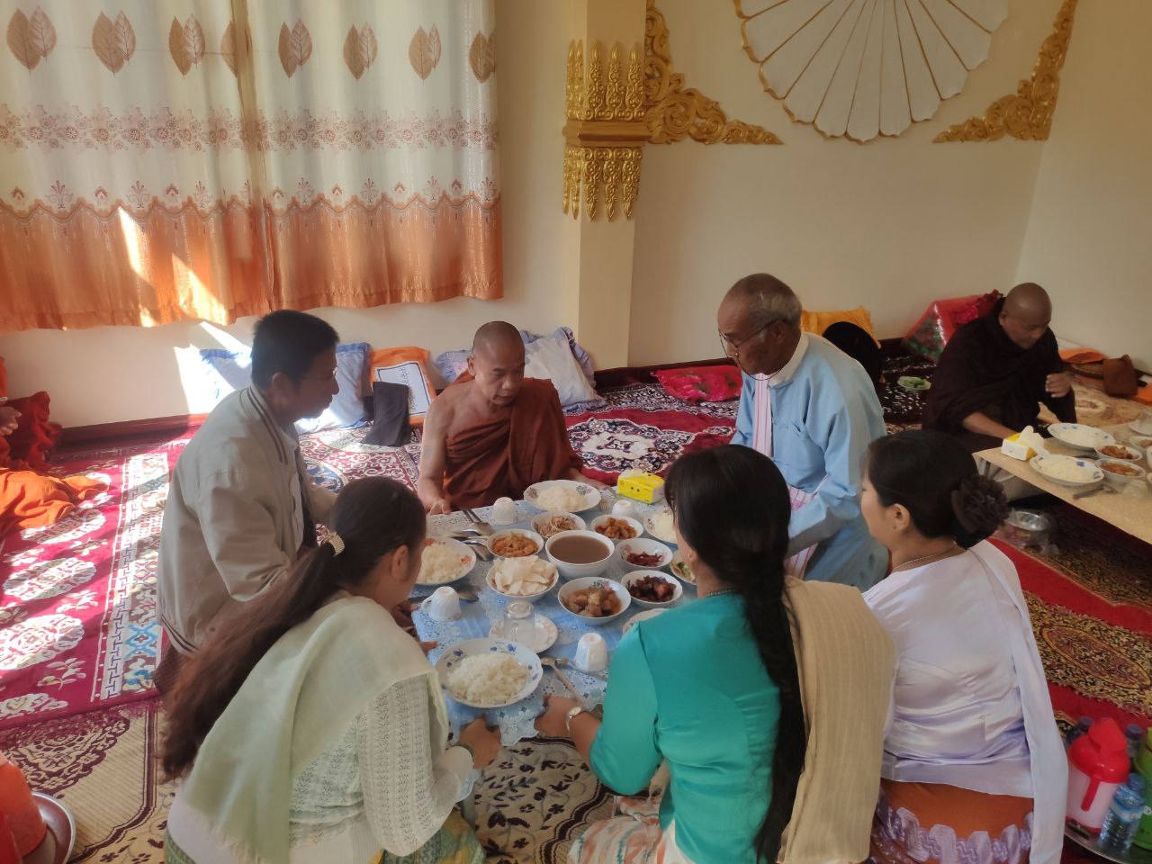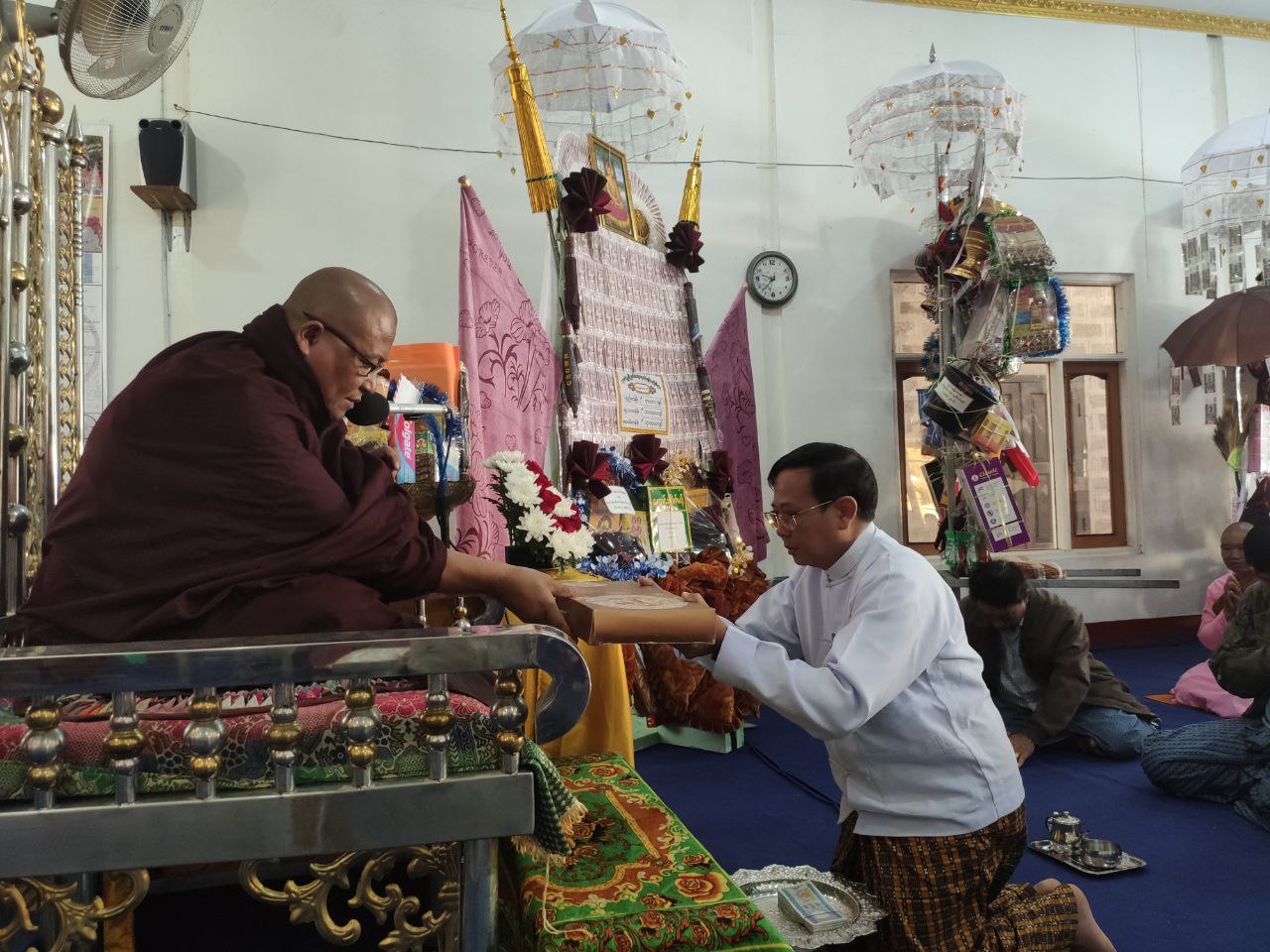 အခမ်းအနားတွင် မြို့နယ်စီမံအုပ်ချုပ်ရေးအဖွဲ့ဥက္ကဋ္ဌ ဦးကျော်စွာလင်းနှင့် ဌာနဆိုင်ရာ တာဝန်ရှိသူများက နိဂြောဓာရုံကျောင်းတိုက် တိုက်အုပ်ဆရာတော် ဘဒ္ဒန္တစက္ကိန္ဒထံမှ ငါးပါးသီလ ခံယူဆောက်တည်ကြသည်။ ထို့နောက် မြို့နယ်စီမံအုပ်ချုပ်ရေးအဖွဲ့ဥက္ကဋ္ဌနှင့် ဌာနဆိုင်ရာ တာဝန်ရှိသူများက ကထိန်လျာ ဉတ်သင်္ကန်း၊ အရန်သင်္ကန်းနှင့် လှူဖွယ်ဝတ္ထုပစ္စည်းများကို ဆရာတော် သံဃာတော်များထံ ဆက်ကပ်လှူဒါန်းပြီး လှူဒါန်းမှုအစုစုတို့အတွက် ရေစက်သွန်းချ အမျှပေးဝေကာ ဆရာတော် သံဃာတော်များကို နေ့ဆွမ်း ဆက်ကပ်လှူဒါန်းခဲ့သည်။