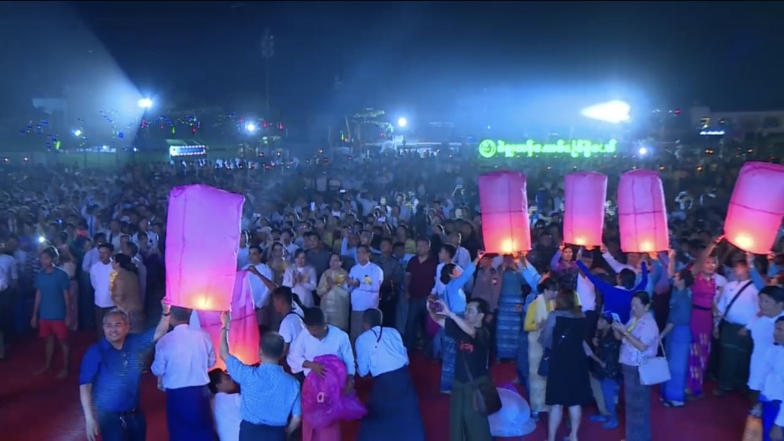 ယင်းနောက် ညပိုင်း၌ တိုင်းဒေသကြီးအစိုးရအဖွဲ့မှ ဦးဆောင်၍ တန်ဆောင်တိုင်ပွဲတော် မီးပုံးပျံ လွှတ်တင်ပူဇော်ပွဲအား ဆက်လက်ကျင်းပပြုခဲ့ရာ တိုင်းဒေသကြီးဝန်ကြီးချုပ် ဦးမျိုးဆွေဝင်းက ပဲခူးတန်ဆောင်တိုင်ပွဲတော်စာတမ်းများ စက်ခလုပ်နှိပ်၍ ဖွင့်လှစ်ပေးခဲ့ပြီး တိုင်းဒေသကြီးဝန်ကြီးချုပ်နှင့် တာဝန်ရှိသူများက တန်ဆောင်တိုင်ပွဲတော် မီးပုံးပျံလွှတ်တင်ပူဇော်ပွဲအား ဖဲကြိုးဖြတ် ဖွင့်လှစ်ပေးခဲ့ကြသည်။ တစ်ဆက်တည်း ရောင်စုံမီးပုံးပျံအသေး (၆၀၀)နှင့် မီးပုံပျံအကြီး (၅)လုံးတို့အား လွှတ်တင်ပူဇော်ခဲ့ကြသည်။