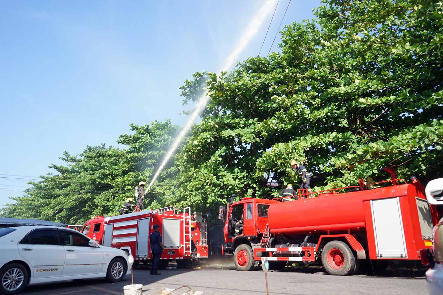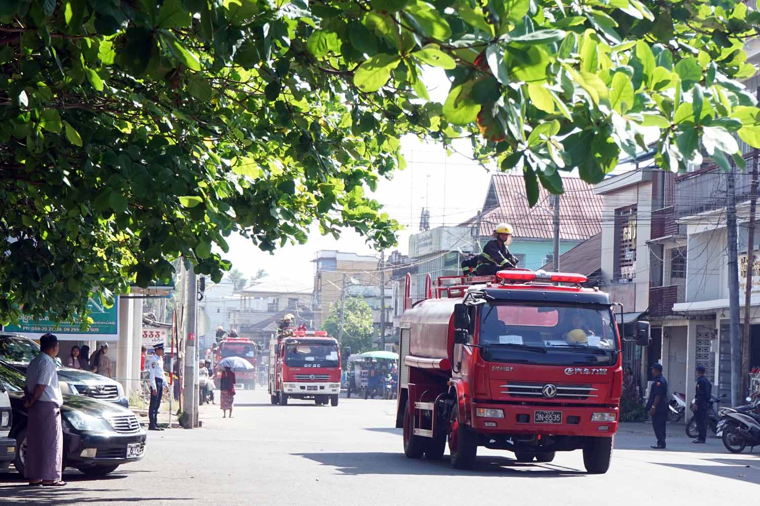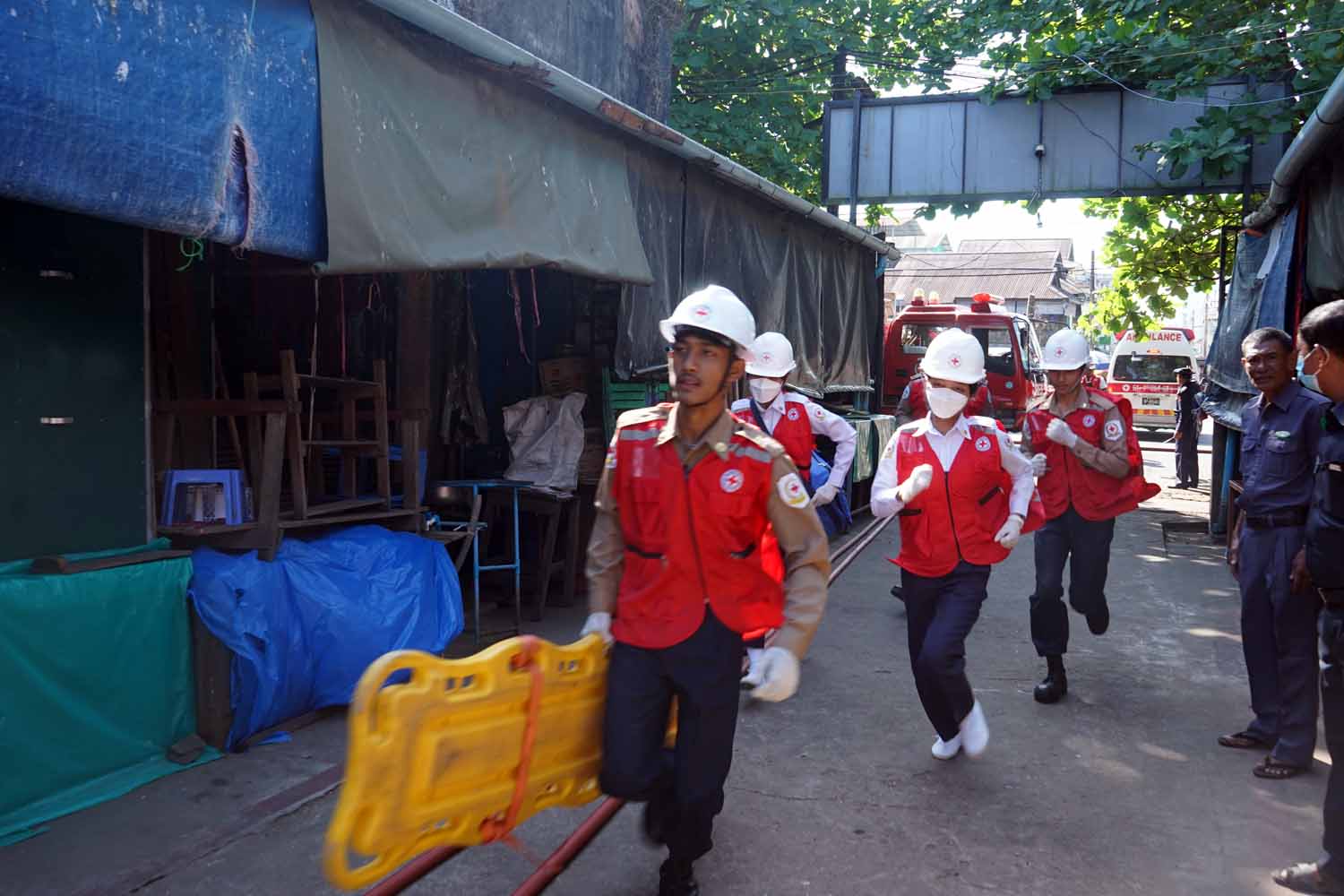 ဇာတ်တိုက်လေ့ကျင့်ရာတွင် သန္ဓေတပ်ဖွဲ့ဝင်များ၊ အရန်မီးသတ်တပ်ဖွဲ့ဝင်များ၊ ကြက်ခြေနီတပ်ဖွဲ့ဝင်များတို့က မီးငြှိမ်းသတ်ယာဉ်၊ လူနာကူညီသယ်ဆောင်ရေးယာဉ်များဖြင့် အလျှင်အမြန် ရောက်ရှိနေရာယူကြပြီး မီးဘေးသဏ္ဍာန် တူဈေးအဆောက်အဦအားမီးငြှိမ်းသတ်ခဲ့ကြပြီး ရှာဖွေ ကယ်ဆယ်ရေးသုံးပစ္စည်းကိရိယာများအား အသုံးပြု၍ ကယ်ဆယ်ခြင်းလုပ်ငန်းများကို လျှင်မြန်စွာ ပြင်ဆင်ဆောင်ရွက်ခဲ့ကြသည်။
