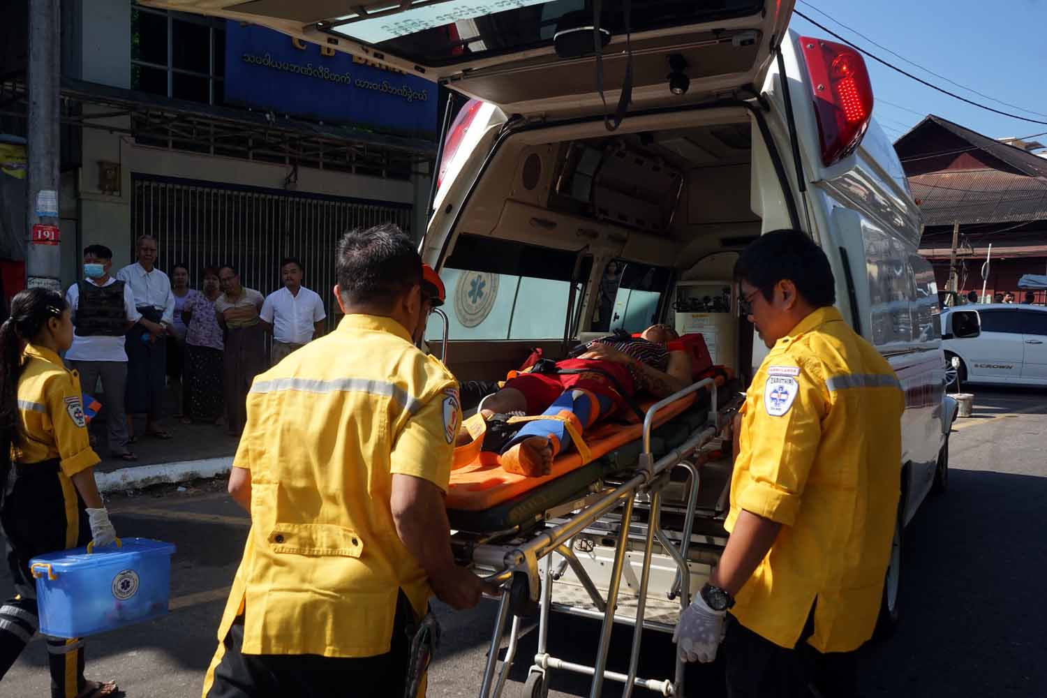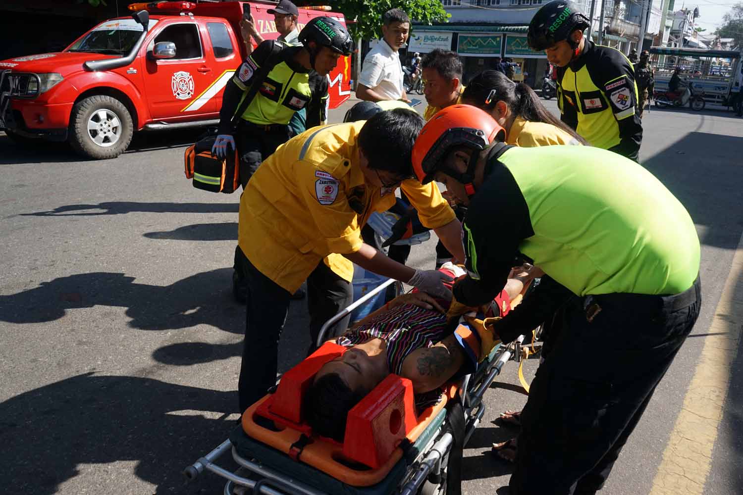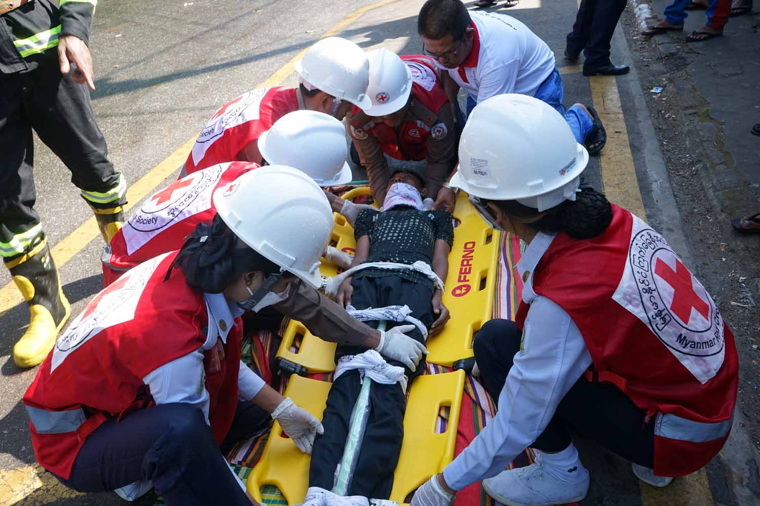 ဆက်လက်၍ ရှာဖွေကယ်ဆယ်ရေးအဖွဲ့က ဒဏ်ရာရရှိသူများကို လွှဲပြောင်းပေးအပ်ရာ အရေးပေါ် လူနာကူညီသယ်ဆောင်ရေးအဖွဲ့များက ဆက်လက်သယ်ဆောင်၍ ရှေးဦးပြုစုခြင်းနှင့် အရေးပေါ် နှလုံးနှိုးဆွအသက်ရှူနည်းဖြင့် ပြုစုပေးခဲ့ကြပြီး ကယ်ဆယ်ရေးယာဉ်ဖြင့် တင်ဆောင်၍ နီးစပ်ရာ ဆေးရုံသို့ ပို့ဆောင်ပေးခြင်းတို့ကို အချိန်တိုအတွင်း အလျှင်အမြန်ပြီးစီးရန် ဇာတ်တိုက် လေ့ကျင့်ခဲ့ ကြကြောင်း သိရသည်။