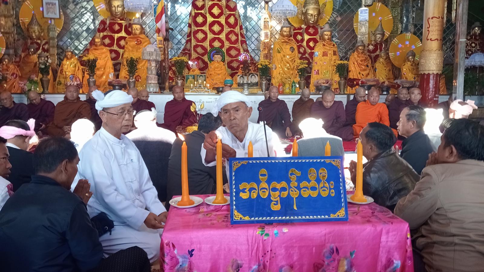 ဆက်လက်ပြီး အဓိဌာန်ဆီမီး(၆)တိုင် ထွန်ညှိပူဇော်ကြရာ (က)မြို့နယ်ဩဝါဒါစရိယဆရာတော်ဘုရားကြီး၊ (ခ)နမ့်ဆန်မြို့နယ်၊ ငွန်ဆိုင်းကျေးရွာအုပ်စု၊ လွယ်ခမ်းကျေးရွာမှ တာပလိန်း၊ (ဂ)ပလောင်ကိုယ်ပိုင်အုပ်ချုပ်ရေးအဖွဲ့ဥက္ကဌ တာသိန်းဇော်၊ (ဃ)အမှတ်(၁၀၁)ခြေမြန်တပ်မဌာနချုပ်မှ တပ်မမှူး၊ (င)မြို့နယ်ဗုဒ္ဓသာသနာ့ဂေါပကအဖွဲ့နာယက ဦးထွန်းကျော်နှင့် မြို့နယ်ဗုဒ္ဓသာသနာ့ဂေါပကအဖွဲ့ဥက္ကဋ္ဌတို့မှ ဆီမီးထွန်းညှိပူဇော်ခဲ့ကြသည်။ (၇၅)ကြိမ်မြောက် မြို့လုံးကျွတ် စုပေါင်းမဟာဘုံကထိန်အလှူတော်တွင် လှူဒါန်းသည့် ဉတ်သင်္ကန်းကို ကထိန်သင်္ကန်းအဖြစ် ဆောင်ရွတ်ရန် ပန်ကြားချက် ပါဌိကာထာကို မြို့နယ်သံဇဆရာတော်မှ ချမှတ်ပေးတော်မူရန်နှင့် ကထိန်လျာသင်္ကန်းကို အလှူရှင်များကိုယ်စား ဂေါပကအဖွဲ့ဥက္ကဌ ဦးမောင်ကျော်မှ ကိုင်ဆောင်ဆက်ကပ်သည်။ ထို့နောက် ဆရာတော် သံဃာတော်များက ကထိန်အလှူခံပုဂ္ဂိုလ် ရွေးချယ်တော်မူရန်နှင့် ခဏ္ဍသိမ်သို့ ကြွရောက်တော်မူ၍ ဉတ်သင်္ကန်းကို ဉတ္တိဒုတိယကမ္မဝါစာဖြင့် ဆောင်ရွက်တော်မူနေစဉ် မြို့မဂိုဏ်းချုပ်ကျောင်းတိုက် (အကျိုးတော်ဆောင်)ဆရာတော်က ကထိန်တရားတော်ကို ဟောကြားချီးမြှင့်ပေးတော်မူခဲ့သည်။