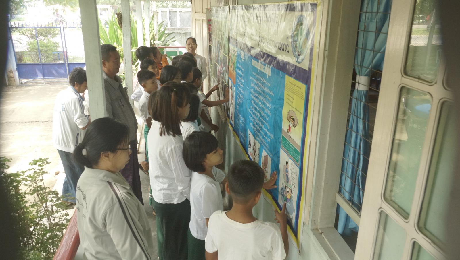 ထို့နောက် ကျောင်းသား/သူလေးများက ပြန်ကြားရေးနှင့်ပြည်သူ့ဆက်ဆံရေးဦးစီးဌာနမှ ပြသထားသော အသိပညာပေး နံရံကပ်စာစောင်များကို စိတ်ဝင်တစား ကြည့်ရှုခဲ့ကြကြောင်း သိရသည်။
