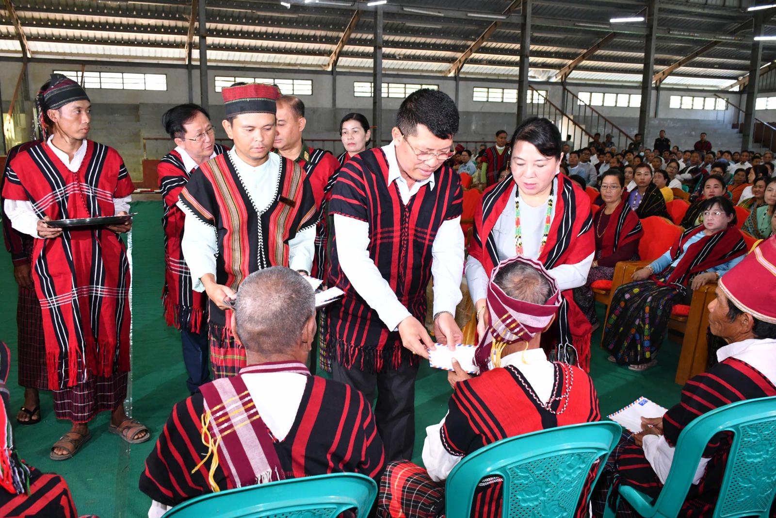 ဆက်လက်၍ အနောက်တောင်တိုင်းစစ်ဌာနချုပ်တိုင်းမှူးက နှုတ်ခွန်းဆက်စကားပြောကြားပြီး ဧရာဝတီတိုင်းဒေသကြီး ချင်းအမျိုးသားစာပေနှင့် ယဉ်ကျေးမှုအသင်းဥက္ကဋ္ဌက အရှိုချင်းရိုးရာကောက်သစ်စားပွဲတော် ကျင်းပရသည့် ရည်ရွယ်ချက်များအား ရှင်းလင်းတင်ပြသည်။ ထို့နောက် သက်ကြီးဘိုးဘွားများအား တိုင်းဒေသကြီးဝန်ကြီးချုပ်နှင့် ဇနီး၊ အနောက်တောင်တိုင်းစစ်ဌာနချုပ် တိုင်းမှူးနှင့် ဇနီး၊ တိုင်းရင်းသားရေးရာဝန်ကြီးတို့က ကန်တော့ငွေများ ပေးအပ်ခဲ့ပြီး ဧရာဝတီတိုင်းဒေသကြီး ချင်းအမျိုးသားစာပေနှင့် ယဉ်ကျေးမှုအသင်း အတွင်းရေးမှူးက ကျေးဇူးတင်စကားများ ပြောကြားသည်။
