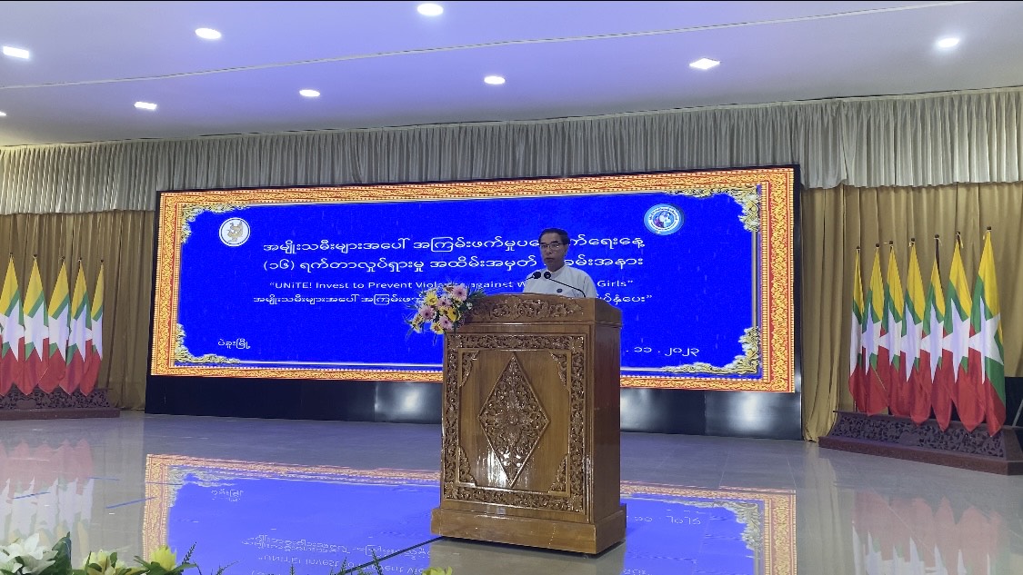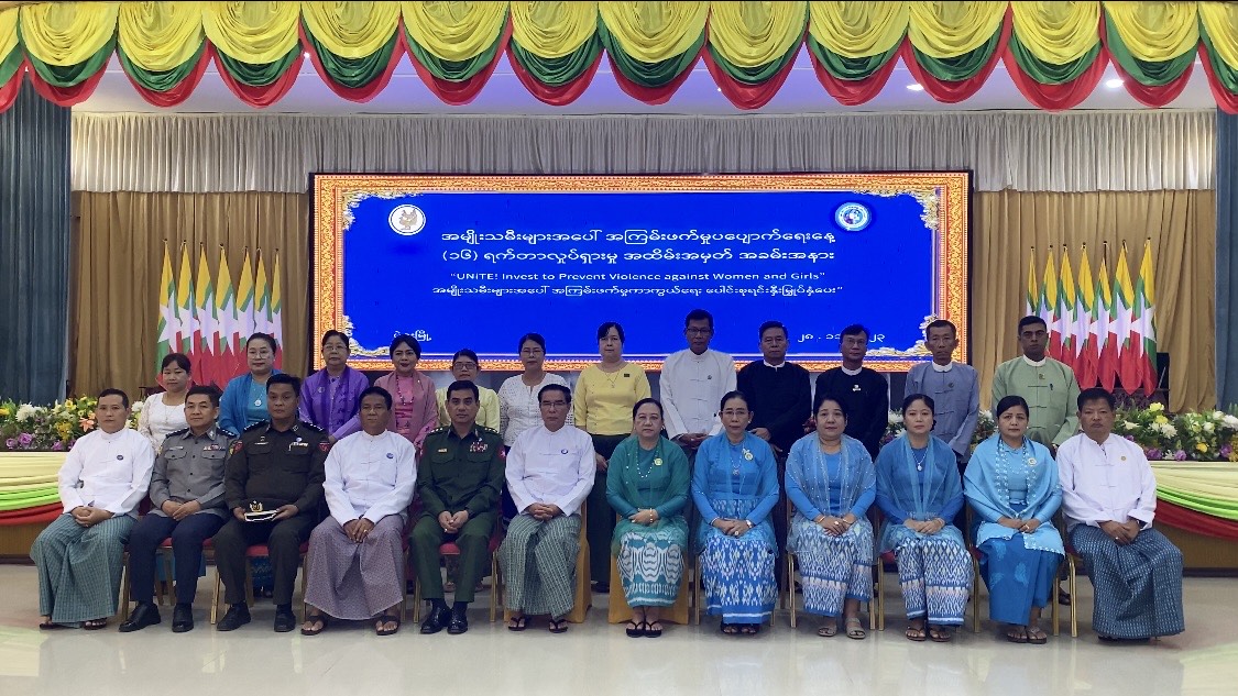 ရှေးဦးစွာ ပဲခူးတိုင်းဒေသကြီးဝန်ကြီးချုပ် ဦးမျိုးဆွေဝင်းက နိုဝင်ဘာလ(၂၅)ရက်နေ့ကို အပြည်ပြည်ဆိုင်ရာအမျိုးသမီးအကြမ်းဖက်မှုများပပျောက်ရေးနေ့အဖြစ် သတ်မှတ်ထားရှိပြီး နိုဝင်ဘာလ(၂၅)ရက်နေ့မှ ဒီဇင်ဘာလ(၁၀)ရက်နေ့အထိကို အပြည်ပြည်ဆိုင်ရာအမျိုးသမီးအကြမ်းဖက်မှုပပျောက်ရေး(၁၆)ရက်တာ လှုပ်ရှားမှုအထိမ်းအမှတ်အဖြစ် သတ်မှတ်ထားရှိခြင်းကြောင့် ပဲခူးတိုင်းဒေသကြီးတွင် တိုင်းဒေသကြီးအဆင့်အခမ်းအနားကို နှစ်စဉ်ကျင်းပပြုလုပ်ခဲ့ကြောင်း၊ အကြိုလှုပ်ရှားမှုအဖြစ် လူစည်ကားရာနေရာများတွင် အသိပညာပေးဆိုင်းဘုတ်များစိုက်ထူခြင်း၊ လက်ကမ်းစာစောင်များဖြန့်ဝေခြင်းများကို ဖွဲ့စည်းထားသည့် အမျိုးသမီးကော်မတီများက ပူးပေါင်းဆောင်ရွက်ခဲ့သလို အမျိုးသမီးဖွံ့ဖြိုးတိုးတက်ရေးနှင့် ကာကွယ်စောင့်ရှောက်ရေးကဏ္ဍများကိုလည်း အကောင်အထည်ဖော် ဆောင်ရွက်ပေးလျက်ရှိကြောင်း၊ ကျား၊ မအခြေပြုအကြမ်းဖက်မှုမှ ကာကွယ်စောင့်ရှောက်နိုင်ရေးအတွက် (၂၄)နာရီဝန်ဆောင်မှုများ ဆောင်ရွက်ပေးနေသလို ၂၀၂၂ ခုနှစ်မှစ၍ မည်သည့်ဖုန်းဖြင့်မဆို ၁၅၆၆ သို့ အခမဲ့သတင်းပေးပို့ တိုင်ကြားနိုင်သည့်စနစ်တို့ တိုးချဲ့ဆောင်ရွက်ပေးနိုင်ခဲ့ကြောင်း၊ ယခုနှစ်ဆောင်ပုဒ်သည် “အမျိုးသမီးများအပေါ် အကြမ်းဖက်မှုကာကွယ်ရေး ပေါင်းစုရင်းနှီးမြှုပ်နှံပေး”ဖြစ်ပြီး နိုင်ငံတော်အနေဖြင့် အမျိုးသမီးများအပေါ် နည်းမျိုးစုံဖြင့်အကြမ်းဖက်မှုမှကာကွယ်ရန်နှင့် တုံ့ပြန်မှုများဆောင်ရွက်ရန်အတွက် အသိပညာပေးခြင်းအပြင် ဘတ်ဂျက်နှင့်မူဝါဒများ ချမှတ်ဆောင်ရွက်ခြင်း၊ သုတေသနပြုခြင်း၊ စစ်တမ်းကောက်ယူခြင်း၊ လုပ်ငန်းအကောင်အထည်ဖော်ခြင်းများ ဆောင်ရွက်လျက်ရှိကြောင်း၊ နိုင်ငံတော်၏ အင်အားစုတစ်ရပ်ဖြစ်သည့် အမျိုးသမီးများ၏ အခန်းကဏ္ဍကိုမြှင့်တင်ပေးခြင်း၊ အမျိုးသမီးများ/အမျိုးသမီးငယ်ရွယ်များအား အကြမ်းဖက်မှုမှ ကာကွယ်စောင့်ရှောက်ပေးခြင်းတို့သည် အမျိုးသမီးများ၏ အခွင့်အရေးအပြည့်အဝရရှိစေရန် ဖြည့်ဆည်းပေးနေခြင်းဖြစ်ပြီး နိုင်ငံတော်၏ဖွံ့ဖြိုးတိုးတက်မှုလုပ်ငန်းစဉ်များမှာ အထောက်အကူပြုနိုင်မှာဖြစ်ကြောင်းနှင့် တိုင်းဒေသကြီး၊ ခရိုင်၊ မြို့နယ်အဆင့် အမျိုးသမီးကော်မတီဝင်များအနေဖြင့် အရပ်ဖက်လူမှုအဖွဲ့အစည်းများနှင့်ပူးပေါင်းပြီး အမျိုးသမီးများအပေါ် နည်းမျိုးစုံဖြင့်အကြမ်းဖက်မှုများ ပပျောက်အောင် အရှိန်အဟုန်တိုးမြှင့်ဆောင်ရွက်သွားကြရန် အမှာစကားပြောကြားသည်။