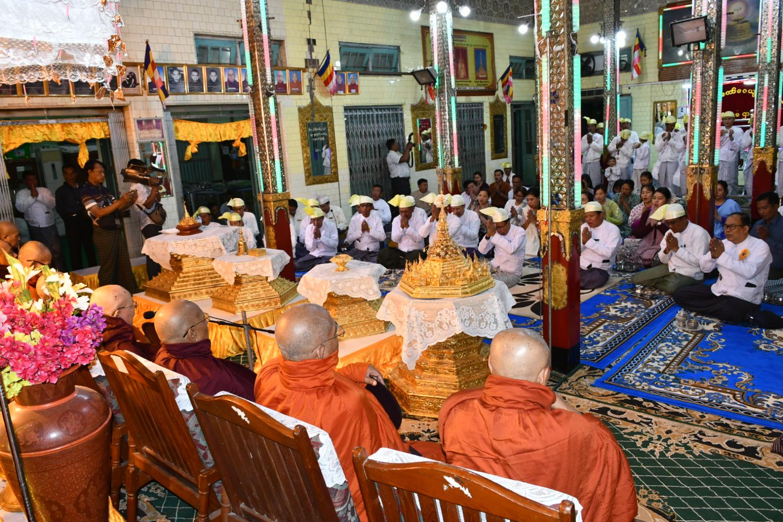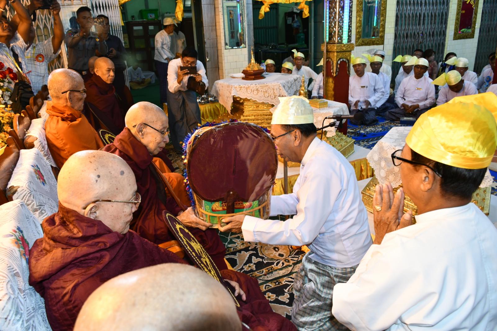 ထို့နောက် ပြည်မြို့ ဝိသုဒ္ဓါရုံဗာရာဏသီကျောင်းတိုက် ဦးစီးပဓာနမဟာနာယက ဆရာတော်ကြီး ဘဒ္ဒန္တနာဂဝံသ အရှင်သူမြတ်ထံမှ ဧည့်ပရိတ်သတ်များက ငါးပါးသီလခံယူဆောက်တည်ကြပြီး တိုင်းဒေသကြီးဥပဒေချုပ်နှင့် တာဝန်ရှိသူများက ဩဝါဒါစရိယဆရာတော်ကြီးများထံ လှူဖွယ်ဝတ္တုပစ္စည်းများ ဆက်ကပ်လှူဒါန်းကြသည်။ ဆက်လက်၍ ဂေါပကအဖွဲ့ဝင် ဦးဆန်းအောင်က ပွဲတော်ရက်အတွင်း အလှူငွေနှင့် ရတနာပစ္စည်းများ လှူဒါန်းရရှိမှုစာရင်းအား ဆရာတော်ကြီးများထံ လျှောက်ထားတင်ပြပြီး လှူဒါန်းမှုအစုစုတို့အတွက် ပြည်မြို့ ရွာဘဲတောင်ပေါ်ကျောင်းတိုက်ကြီး၏ ဦးစီးပဓာနမဟာနာယက ဘဒ္ဒန္တကုမာရဆရာတော်ဘုရားကြီးက အနုမောဓနာတရားချီးမြှင့်တော်မူပြီး ဝေနေယျသတ္တဝါအပေါင်းအား ရေစက်သွန်းချ အမျှပေးဝေကြသည်။