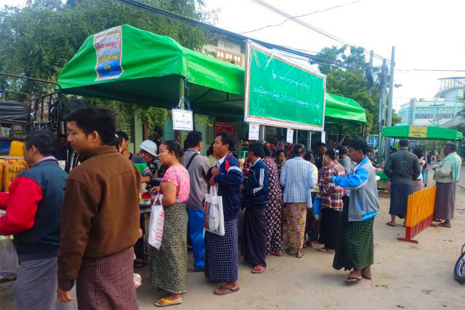 အခြေခံစားသောက်ကုန်တွေကို ဒေသခံပြည်သူတွေထံ သက်သာသော ဈေးနှုန်းနဲ့ ရောင်းချပေးတာ ဖြစ်ပါတယ်။ ဧည့်မထ ဆန်တစ်ပြည်ကို ၂၇ဝဝ ကျပ် ၊ ဆီတစ်ပိဿာ ၅၂ဝဝ ကျပ် ၊ ကြက်ဥတစ်လုံး ၂ဝဝ ကျပ် ၊ ကြက်သားတစ်ပိဿာ ၁ဝ၈၀၀ကျပ် ၊ ဝက်သား အသား/အရိုးပါ တစ်ပိဿာ ၁၅၅၀၀ ကျပ်၊ အမဲသား တစ်ပိဿာ ၁၂ဝဝဝ ကျပ် ၊ ငါးမြစ်ချင်း တစ်ပိဿာ ၇ဝဝဝ ကျပ်နှုန်းနဲ့ ရောင်းချပေးတာဖြစ်ပါတယ်ဟု မြို့နယ်အထွေထွေအုပ်ချုပ်ရေးဦးစီးဌာနမှ တာဝန်ရှိသူတစ်ဦးက ပြောသည်။ အဆိုပါ အခြေခံစားသောက်ကုန်များအား သက်သောဈေးနှုန်းဖြင့် ရောင်းချပေးခြင်းအား မြို့နယ်အထွေထွေအုပ်ချုပ်ရေးမှူး ဦးအောင်ဇော်လေး၏ ကြီးကြပ်မှုဖြင့် ဝန်ထမ်းများက ရောင်းချပေးခဲ့ပြီး ဒေသခံပြည်သူ ၇ဝဝ ဦးခန့် လာရောက်ဝယ်ယူခဲ့ကြောင်း သိရသည်။ ၎င်းအခြေခံစားသောက်ကုန်များအား သက်သာသော ဈေးနှုန်းဖြင့် ရောင်းချပေးခြင်းကို ရပ်ကွက် ၁၄ ရပ်ကွက်တွင် အပတ်စဉ် သောကြာနေ့တိုင်း ဆောင်ရွက်သွားမည်ဖြစ်ကြောင်း သိရသည်။