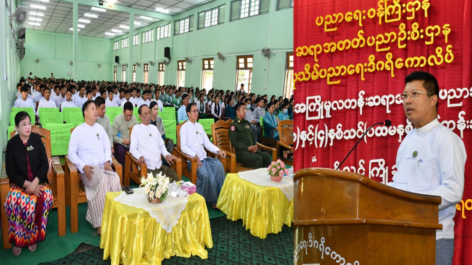 ရှေးဦးစွာ အခမ်းအနားအား သင်တန်းသား၊ သင်တန်းသူများက“ကြိုဆိုလက်ကမ်း ကံ့ကော်တန်း” သီချင်းဖြင့်ဖွင့်လှစ်ခဲ့ပြီးနောက် တိုင်းဒေသကြီးဝန်ကြီးချုပ်က“ တိုင်းဒေသကြီး အတွင်းရှိ ပညာရေးဒီဂရီကောလိပ် (၃)ခုတွင် မောင်မယ်သစ်လွင်ကြိုဆိုပွဲများကို ပြုလုပ်လျက် ရှိပါကြောင်း၊ တိုင်းဒေသကြီး၏ ပညာရေးကဏ္ဍမြင့်မားအောင်ဆောင်ရွက်ပေးမည့် ဆရာ၊ ဆရာများအား ပညာရေးဒီဂရီကောလိပ်ကျောင်းတော်ကြီးမှ ပညာသင်ကြားဆည်းပူးမှုများ ပြုလုပ်၍ လုပ်ငန်းခွင်သို့ဝင်ရောက်ကြရမည်ဖြစ်ပါကြောင်း၊ နိုင်ငံတော်အနေဖြင့် လူငယ်များ၏ အခန်းကဏ္ဍကို ပိုမိုမြှင့်တင်ပေးလျက်ရှိရာ ဗလငါးတန်နှင့်ပြည့်စုံသည့် နိုင်ငံ့သေားကောင်းများ ဖြစ်အောင် ဆရာ၊ ဆရာများမှ ပြုစုပျိုးထောင်ပေးရမှာဖြစ်ပါကြောင်း၊ ဆရာ၊ ဆရာမများသည် တပည့်များ၏ လက်ဦးဆရာများဖြစ်သဖြင့် စံနမူနာပြဖြစ်ရန်လိုအပ်ကြောင်း၊ မိမိတို့သင်တန်း များပြီးဆုံး၍ တာဝန်ကျရာဒေသများသို့ သွားရောက်တာဝန်ထမ်းဆောင်သည့်အခါတွင်လည်း ဒေသ၌ရှိသည့် ပညာရေးကိုလိုလားသည့် ကျောင်းသားမိဘများ၊ ရပ်မိ၊ ရပ်ဖများ၊ ကျောင်းသား၊ ကျောင်းသူများက ကြိုဆိုနေကြမှာဖြစ်ပါကြောင်း၊ ဆရာ၊ ဆရာမများသည် ကျောင်းသား၊ ကျောင်းသူများ၏ ကိုယ်ရည်ကိုယ်သွေးနှင့် စွမ်းရည်သတ္တိပြည့်ဝအောင် သင်ကြားပေးရမှာဖြစ်ပါကြောင်း၊ ဆရာ၊ ဆရာမများသည် ခေတ်နှင့်အညီပြောင်းလဲလာသော ပညာရေးစနစ်ကို အစဉ်လေ့လာသင်ယူပြီး အမြဲကြိုးစားနေရမည့် ထာဝရကျောင်းသားကြီးများဖြစ်ပါကြောင်း၊ စနစ်သစ် Grade-12 တက္ကသိုလ်ဝင်စာမေးပွဲတွင် အောင်ချက်မြင့်မားရေးအတွက် ဘာသာရပ်ဆိုင်ရာ သိကောင်းစရာ ဆွေးနွေးဟောပြောပွဲများအား တက္ကသိုလ်များမှ ပါမောက္ခချုပ်များ၊ ပါမောက္ခဌာနမှူးနှင့် အခြေခံပညာ အထက်တန်းကျောင်းများမှ ဆရာ၊ ဆရာမများပူးပေါင်း၍ ပုသိမ်တက္ကသိုလ်၊ ဟင်္သာတ တက္ကသိုလ်နှင့် မအူပင်တက္ကသိုလ်တို့တွင် ဇုန်ကြီး(၃)ဇုန်ခွဲ၍ ပြုလုပ်ခဲ့ ပါကြောင်း၊ တိုင်းဒေသကြီးတွင် အခြေခံပညာကျောင်း၊ ကိုယ်ပိုင်ကျောင်း၊ ဘုန်းတော်ကြီးသင် ကျောင်းများအပါအဝင် ကျောင်းပေါင်း (၇၂၀၀)ကျော် ဖွင့်လှစ်ထားရှိပြီး ကျောင်းတက်ရောက်မှု (၁၁)သိန်းနှစ်သောင်းကျော်နှင့် ဆရာဆရာမအင်အားပေါင်း (၅)သောင်းကျော်ရှိပါကြောင်း၊ တိုင်းဒေသကြီးသည် ကျောင်းတက်ရောက်မှု၊ ကျောင်းဖွင့်လှစ်မှု၊ အတန်းစဉ်ကူးပြောင်းမှုနှင့် အောင်ချက်မြင့်မားသော တိုင်းဒေသကြီးဖြစ်ပါကြောင်း၊ တိုင်းဒေသကြီးသည် ရေခံမြေခံကောင်းမွန်ပြီး ပညာရေးကဏ္ဍတိုးတက်မြင့်မားကာ လူ့စွမ်းအားအရင်းအမြစ်များစွာ မွေးထုတ်ရာ တိုင်းဒေသကြီးလည်းဖြစ်ပါကြောင်း၊ နိုင်ငံတော်မှ စာမတတ်သူများပပျောက်ရေး "ဝထကလသ" စီမံချက်ချက်ဖြင့် အကောင