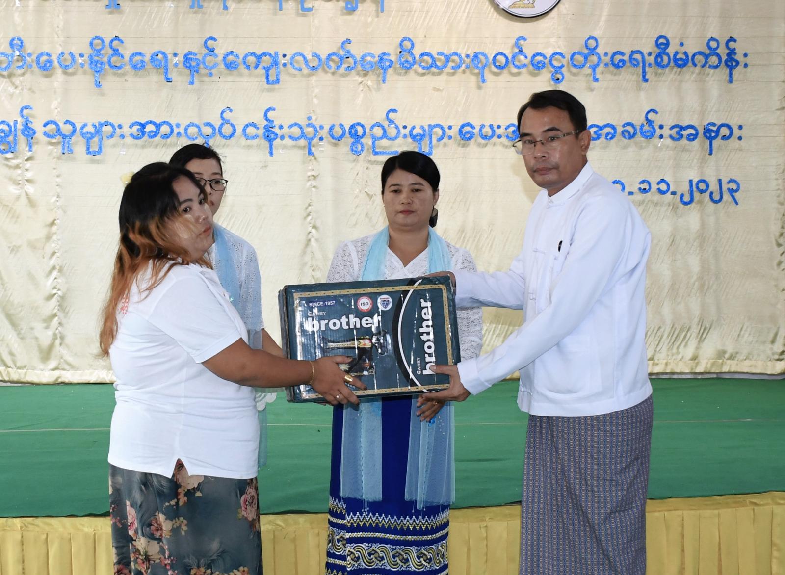 ပဲခူးတိုင်းဒေသကြီး တောင်ငူခရိုင် အသေးစားစက်မှုလက်မှုလုပ်ငန်းဦးစီးဌာနက ကြီးမှူး၍ အသေးစားကုန်ထုတ်လုပ်ငန်းများ ဖန်တီးပေးနိုင်ရေးနှင့် ကျေးလက်နေမိသားစုဝင်ငွေတိုးရေးစီမံကိန်းဖြင့် အကောင်အထည်ဖော်ဆောင်ရွက်ခဲ့သည့် အသက်မွေးဝမ်းကျောင်း အထောက်အကူပြု နည်းပညာသင်တန်းများမှ လုပ်ငန်းထူထောင်သူများအား “ဒေသဖွံဖြိုးရေးလုပ်ငန်းသုံးပစ္စည်းများ ပေးအပ်ပွဲ”အခမ်းအနားကို ယမန်နေ့နံနက်ပိုင်းက တောင်ငူမြို့ ကေတုမတီမြို့တော်ခန်းမ၌ ကျင်းပသည်။