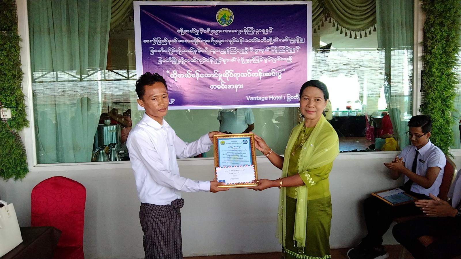 ဆက်လက်၍ သင်တန်းတွင် ဘာသာရပ်အလိုက် ပထမဆု၊ ဒုတိယဆုနှင့် တတိယဆုရရှိခဲ့သည့် သင်တန်းသား၊ သင်တန်းသူ ၉ ဦးတို့အား လက်ထောက်ညွှန်ကြားရေးမှူး ဒေါ်ချောကြည်ကြည်၊ Union Hotel မှ မန်နေဂျာ ဦးအောင်ကျော်နှင့် Westay Hospitality Group မှ Operation Manager ဦးသော်သော်လွင်တို့က ဆုများ အသီးသီးချီးမြှင့်ပေးသည်။