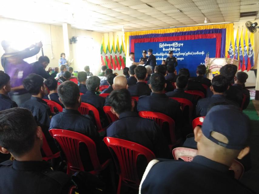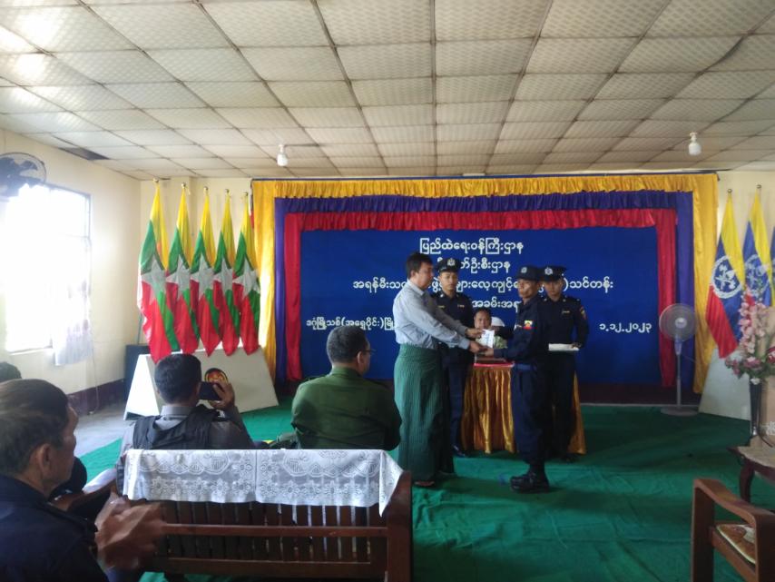 ရှေးဦးစွာ မြို့နယ်စီမံအုပ်ချုပ်ရေးအဖွဲ့ဥက္ကဋ္ဌ ဦးမျိုးသူက သင်တန်းဆင်းအမှာစကား ပြောကြားခဲ့သည်။ ထို့နောက်ထူးချွန်ဆိုရရှိသူ သင်တန်းသားအမှတ်စဥ် (၃၃)နှင့် အမှတ်စဥ် (၄၄)တို့အား မြို့နယ်စီမံအုပ်ချုပ်ရေးအဖွဲ့ဥက္ကဋ္ဌဦးမျိုးသူ၊ အဖွဲ့ဝင်(၂) ဦးတင်ဝင်းနှင့် မြို့နယ်ရဲတပ်ဖွဲ့မှ ဆုများအသီးသီးချီးမြှင့်ခဲ့ပြီး ဌာနဆိုင်ရာအကြီးအကဲများက သင်တန်းဆင်းလက်မှတ်များ အသီးသီးပေးအပ်ခဲ့ကြသည်။