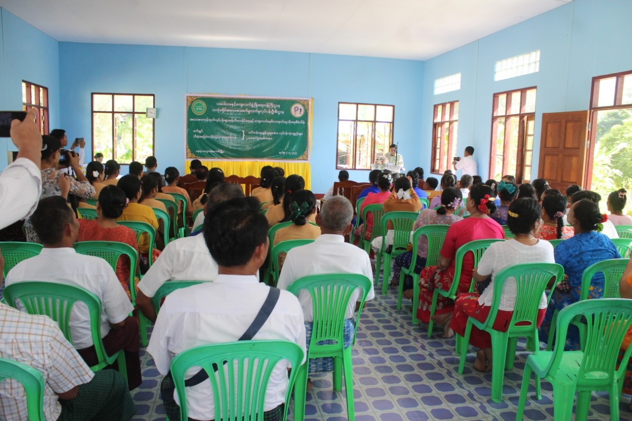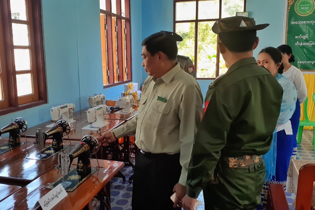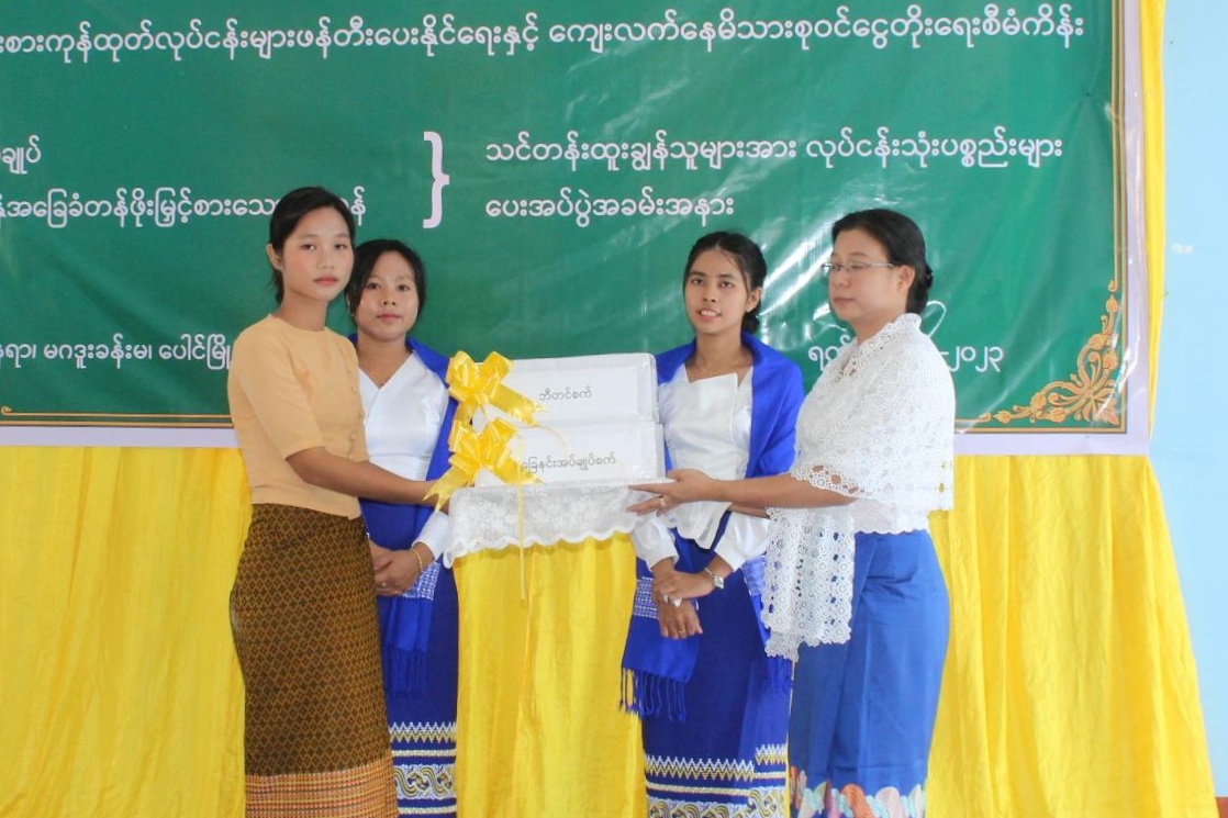 ယင်းနောက် ခရိုင်အသေးစား စက်မှုလက်မှုလုပ်ငန်းဦးစီးဌာနမှ ခရိုင်ဦးစီးမှူး ဒေါ်ခင်မြတ်အေးက အသေးစား ကုန်ထုတ်လုပ်ငန်းများ ဖန်တီးပေးနိုင်ရေးနှင့် ကျေးလက်နေမိသားစုများ ဝင်ငွေတိုးရေးစီမံကိန်းလုပ်ငန်းနှင့် စပ်လျဉ်းသည်တို့ကို ရှင်းလင်းပြောကြားကာ ခရိုင်စီမံအုပ်ချုပ်ရေးအဖွဲ့ခေတ္တဥက္ကဋ္ဌနှင့် တာဝန်ရှိသူတို့က ထူးချွန်သင်တန်းသူ (၁၀)ဦးတို့အား တစ်ဦးလျှင် ငွေကျပ်(၁၀)သိန်းနှင့် ညီမျှသည့်လုပ်ငန်းသုံးပစ္စည်းများ ချီးမြှင့်ပေးအပ်ရာ သင်တန်းသူများက လက်ခံရယူပြီး ကျေးဇူးတင်စကား ပြန်လည်ပြောကြားခဲ့သည်။