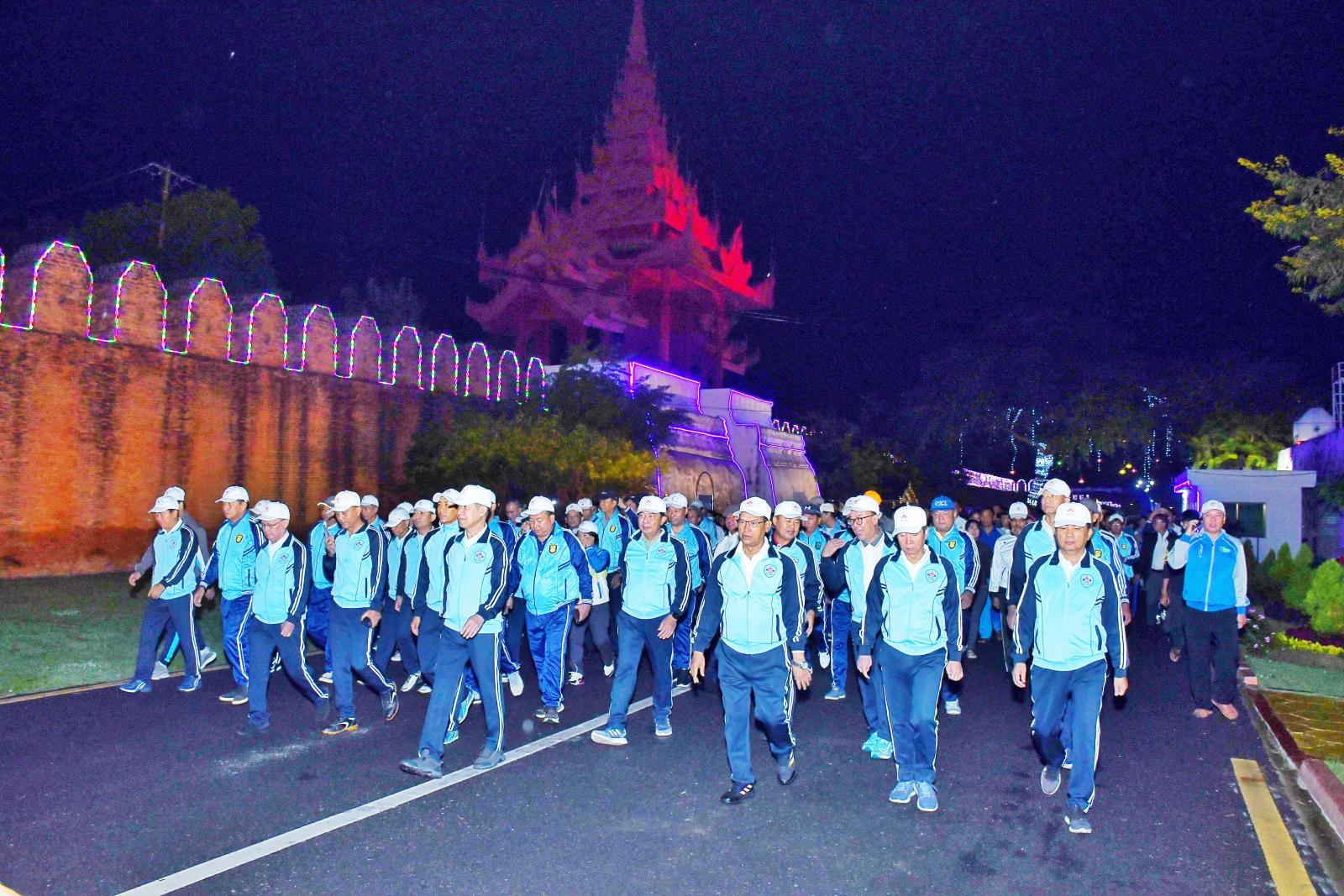 ထို့နောက် ဦးထိပ်တံတားမှ စတင်ကာ ရတနာပုံ ဥယျာဉ်အတွင်းမှ ကျုံး၏ အရှေ့တောင်ထောင့်အထိ တပျော်တပါးစုပေါင်း လမ်းလျှောက်ခဲ့ကြပြီး၊ ကာယကြံ့ခိုင်မှုလေ့ကျင့်ခန်းအတွဲ (၁/၂) တို့ဖြင့် ကိုယ်လက်လှုပ်ရှား အားကစားများ ပြုလုပ်ဆောင်ရွက်ကြကြောင်း သိရသည်။