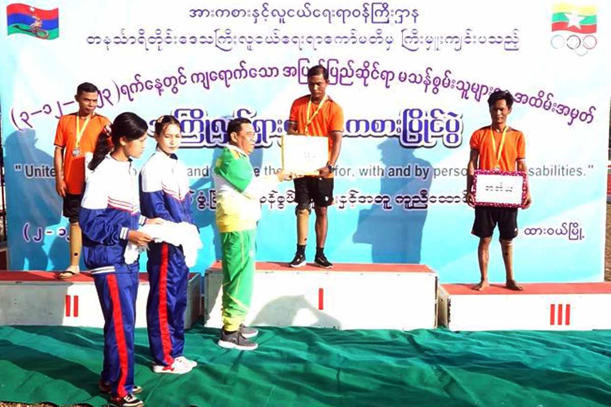 ထို့နောက် တိုင်းဒေသကြီးအစိုးရအဖွဲ့နှင့် စေတနာရှင်အလှူရှင်များက ပြိုင်ပွဲများတွင် ပါဝင်ယှဉ်ပြိုင် သော မသန်စွမ်းအားကစားသမား (၂၄) ဦးအား စုစုပေါင်းငွေကျပ် (၆၃၀၀၀၀) အား ပေးအပ်ချီးမြှင့်ခဲ့ကြောင်း သိရသည်။