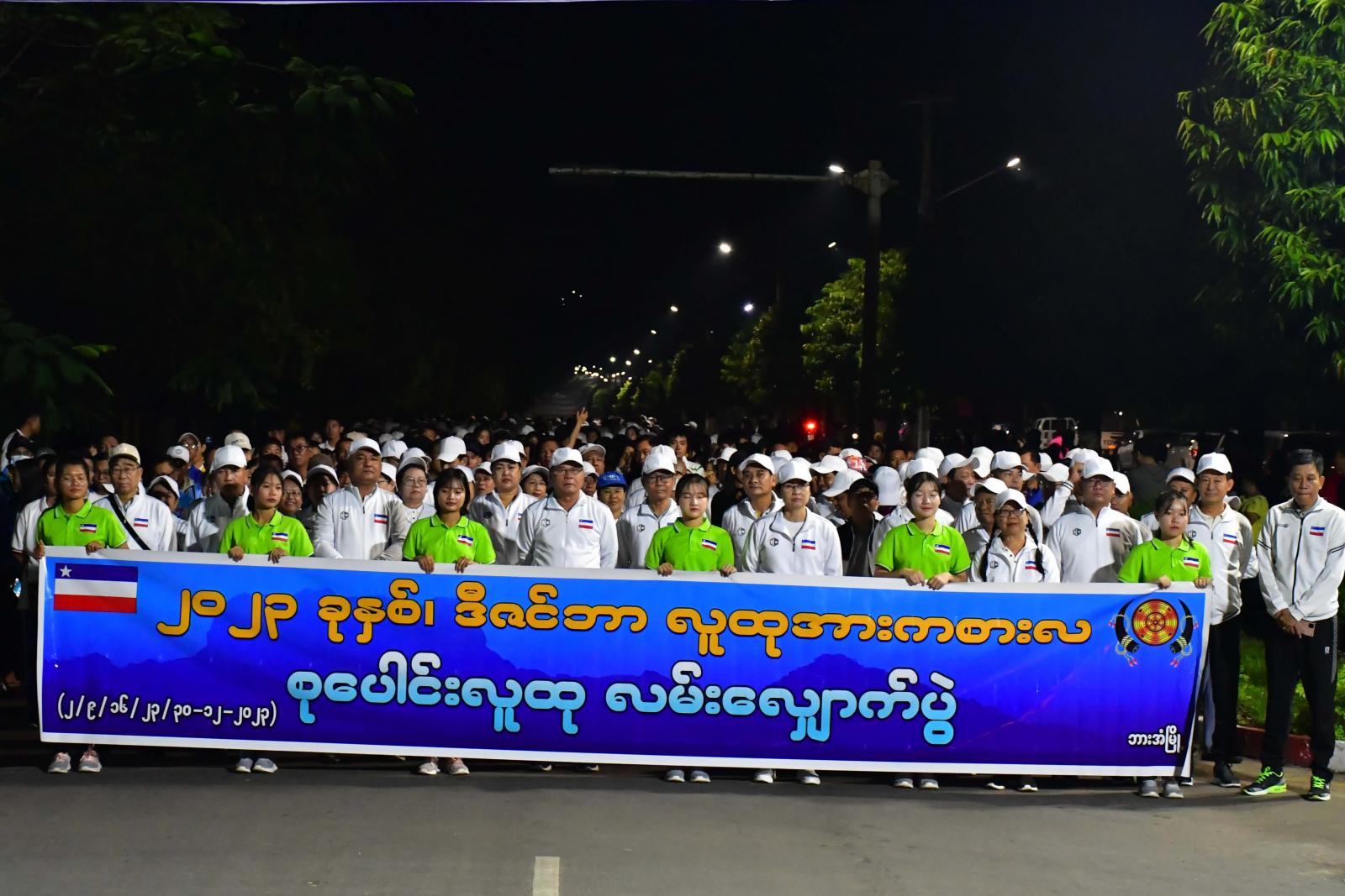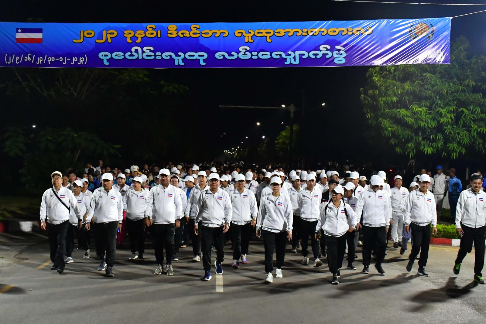 ကရင်ပြည်နယ်၊ ဘားအံမြို့တွင် ၂၀၂၃ ခုနှစ် ဒီဇင်ဘာ လူထုအားကစားလ စုပေါင်းလူထုလမ်းလျှောက်ပွဲနှင့် ကိုယ်လက်လှုပ်ရှားလေ့ကျင့်ခန်းများ ဆောင်ရွက်ခြင်းကို ယမန်နေ့ နံနက် ၅ နာရီခွဲခန့်က ဘားအံမြို့၊ အမှတ်(၄)ရပ်ကွက်၊ သီရိလမ်း၊ ဝန်ကြီးများ အိမ်ရာရှေ့၌ စုရပ်ပြုလုပ်ကျင်းပရာ ကရင်ပြည်နယ်ဝန်ကြီးချုပ် ဦးစောမြင့်ဦးနှင့်ဇနီး၊ ပြည်နယ်တရားလွှတ်တော်တရားသူကြီးချုပ် ဒေါ်ခင်ဆွေထွန်း၊ ပြည်နယ်အစိုးရအဖွဲ့ဝင်များနှင့် ၎င်းတို့၏ ဇနီးများ၊ ပြည်နယ်၊ ခရိုင်၊ မြို့နယ်အဆင့် ဌာနဆိုင်ရာများ၊ ဘားအံတက္ကသိုလ်နှင့် ဘားအံပညာရေးဒီဂရီကောလိပ်တို့မှ သင်တန်းသား၊ သင်တန်းသူ၊ ဆရာ၊ဆရာမများ၊ ဒေသခံတိုင်းရင်းသားပြည်သူများ စုစုပေါင်းအင်အား ၂၀၀၀ ဦးခန့် အေးချမ်းပျော်ရွှင်စွာ ပါဝင်ဆင်နွှဲခဲ့ကြသည်။