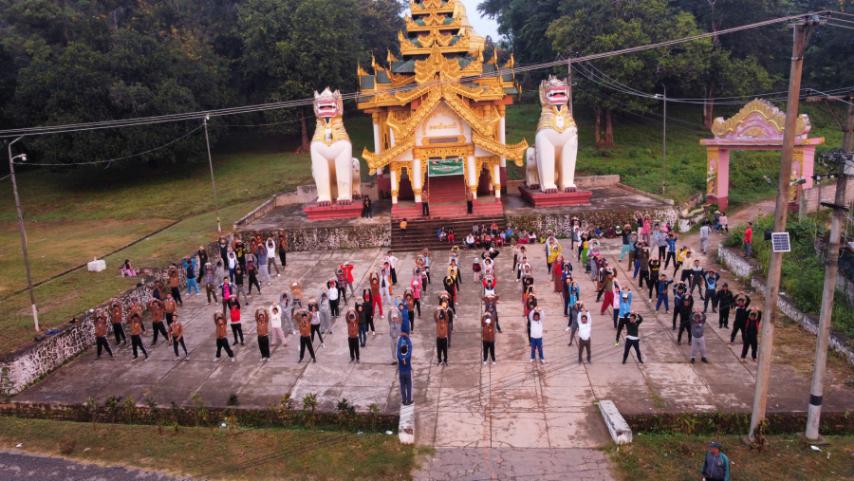 အဆိုပါလူထုစုပေါင်းလမ်းလျှောက်ပွဲကို တပ်နယ်ဘောလုံးကစားကွင်းစုရပ်မှ ပြည်ထောင်စုလမ်းမ ကွန်ဟိန်းတံတားစု ပေါင်းဂိတ်အထိ တပျော်တပါးစုပေါင်းလမ်းလျှောက်ခဲ့ကြပြီး မဟာကမ္ဘောဇပြည်ငြိမ်းအေးစေတီတော်၊ တောင်ဘက်မုဒ်ဦးတွင် ကိုယ်လက်ကြံ့ခိုင်ရေးလေ့ကျင့်ခန်းများ ဆောင်ရွက်ခဲ့ကြသည်။