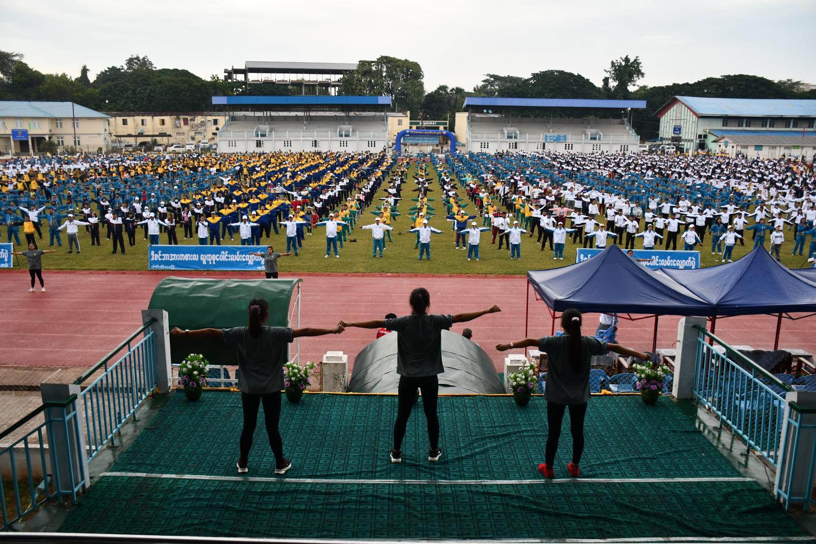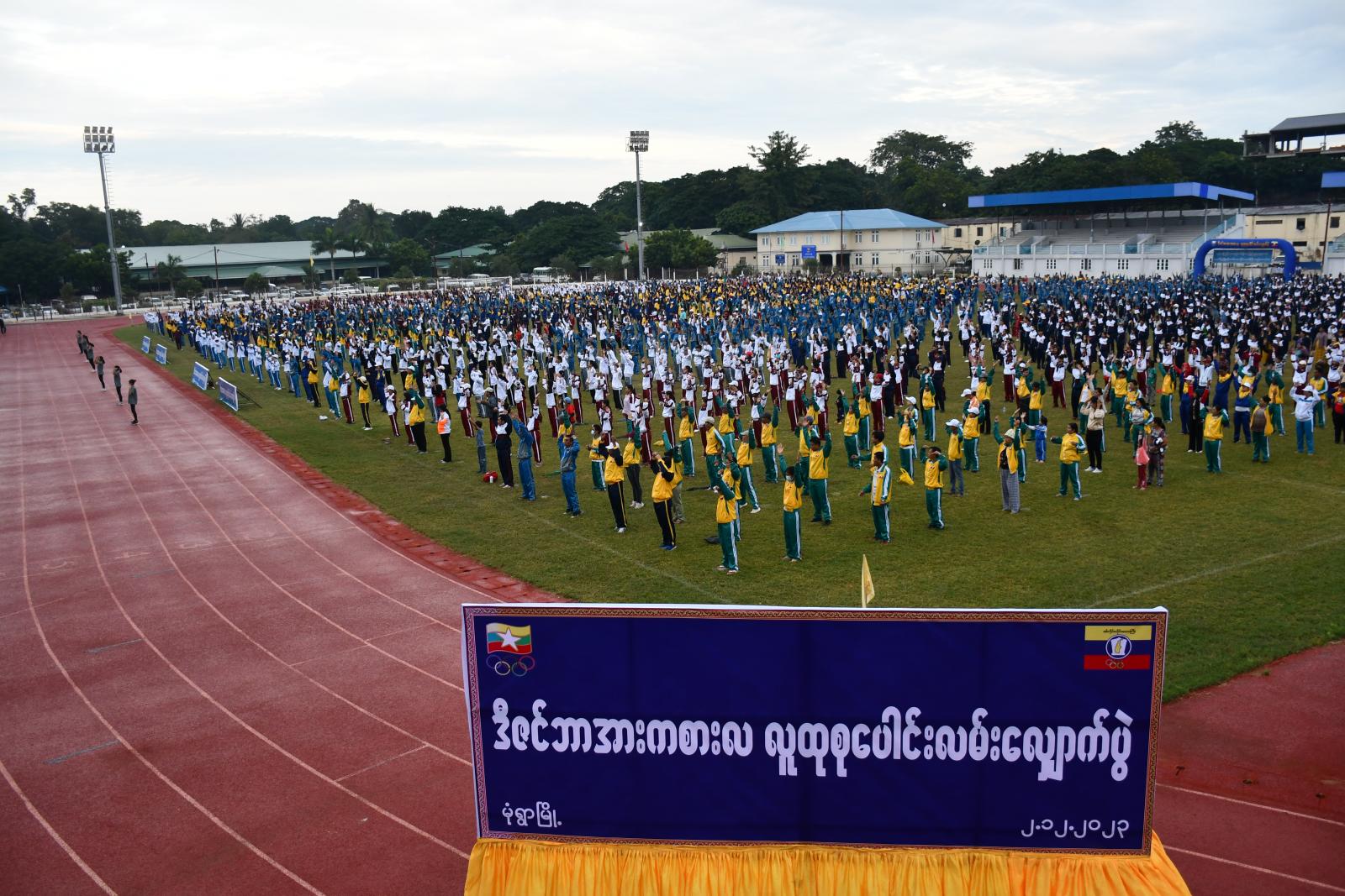 ဆက်လက်၍ တိုင်းဒေသကြီး ဝန်ကြီးချုပ်နှင့် တာဝန်ရှိသူများ၊ စုပေါင်းလမ်းလျှောက်ပွဲသို့ တက်ရောက်လာသူများသည် တိုင်းဒေသကြီး ပြည်သူ့အားကစားကွင်းအတွင်းသို့ ဝင်ရောက်ကြ ပြီး အဆိုပါအားကစားကွင်းကြီးရှိ မြက်ခင်းပြင်၌ စနစ်တကျ နေရာယူကြကာ တိုင်းဒေသကြီး အားကစားနှင့်ကာယပညာဦးစီးဌာနမှ လူငယ်မောင်မယ်များ၏ ကိုယ်ကာယလေ့ကျင့်ခန်း အမှတ်စဉ် (၁) အမှတ်စဉ်(၂) သရုပ်ပြသမှုနှင့်အတူ သွေးပူလေ့ကျင့်ခန်းအားကစားများ စုပေါင်း ဆောင်ရွက်ခဲ့ကြသည်။