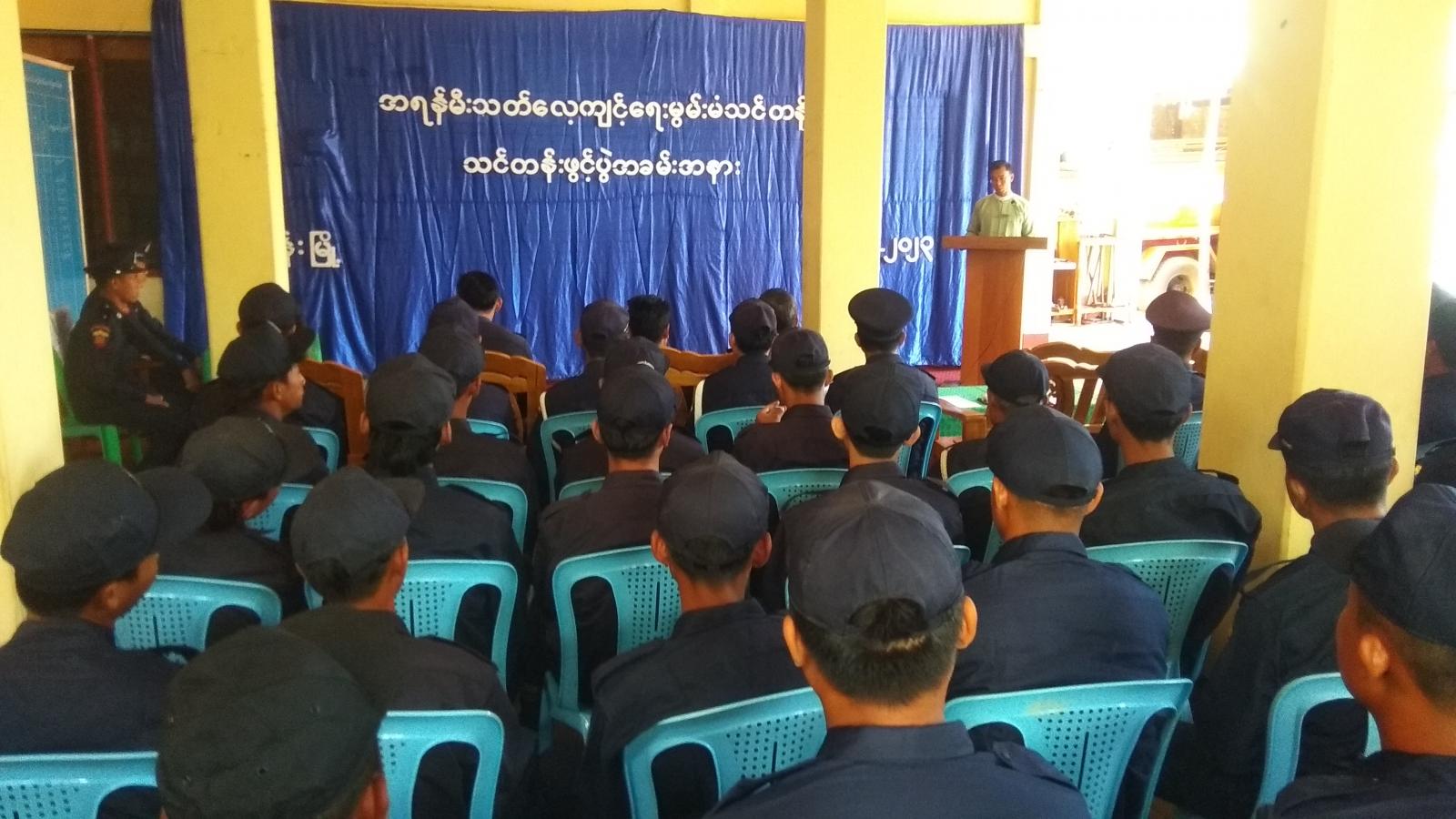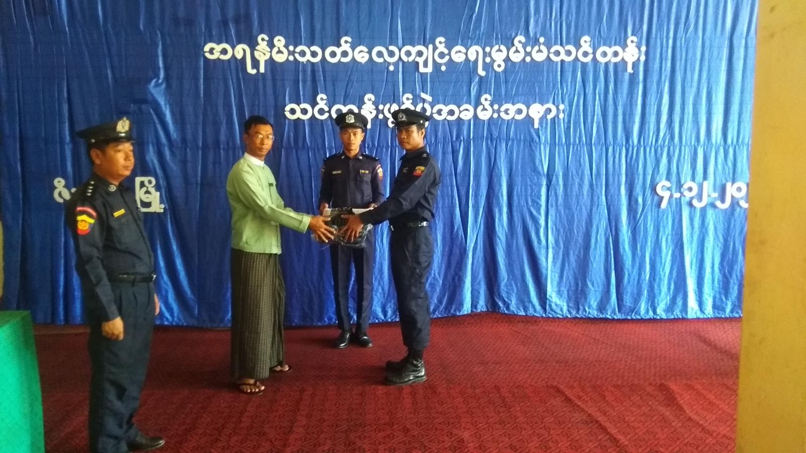 အခမ်းအနားတွင် မြို့နယ်စီမံအုပ်ချုပ်ရေးအဖွဲ့ဥက္ကဋ္ဌ ဦးမျိုးသက်အောင်က အဖွင့်အမှာစကားပြောကြားပြီး သင်တန်းကို ဖွင့်လှစ်ပေးခဲ့သည်။ ဆက်လက်၍ မြို့နယ်စီမံအုပ်ချုပ်ရေးအဖွဲ့ဥက္ကဋ္ဌနှင့် ရဲတပ်ဖွဲ့မှူး ရဲမှူးမြင့်ကျော်တို့မှ မီးသတ်တပ်ဖွဲ့ဝတ်စုံများ ပေးအပ်ရာ သင်တန်းသားများက လက်ခံရယူခဲ့ကြသည်။