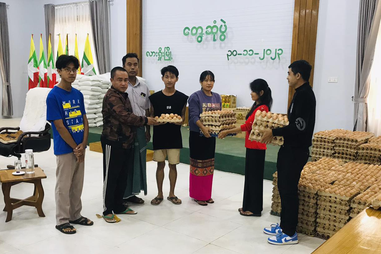 ပြည်နယ်၊ ခရိုင်၊ မြို့နယ်အဆင့် ဌာနဆိုင်ရာ ဝန်ထမ်းများအတွက် တစ်ဦးလျှင် ဆီ (၅၀)သား၊ ကြက်ဥ (၁၀)လုံးစီကို လားရှိုးခရိုင် အထွေထွေအုပ်ချုပ်ရေးဦးစီးဌာနတွင် ထုတ်ပေးခဲ့ရာ သက်ဆိုင်ရာဌာနအလိုက် တာဝန်ရှိသူတို့က လက်ခံခဲ့ကြောင်း သိရသည်။